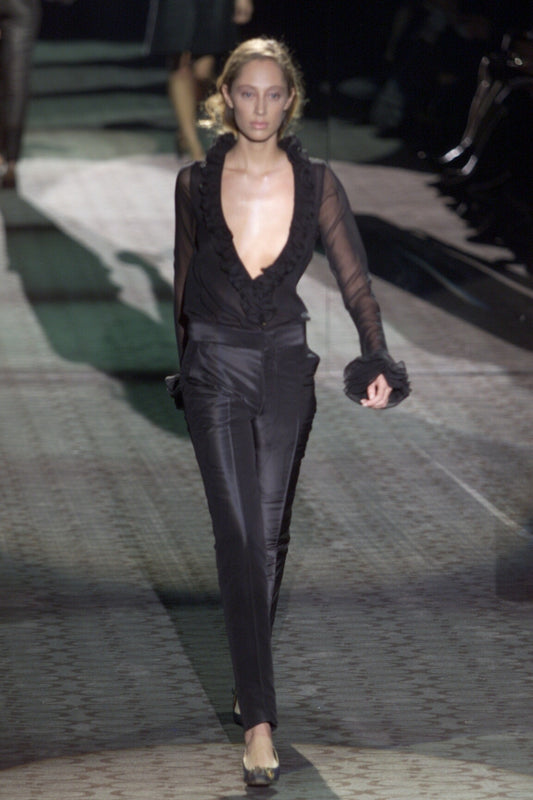 Gucci Fall 2000 Tom Ford Runway Black Ruffled Plunge Silk Blouse