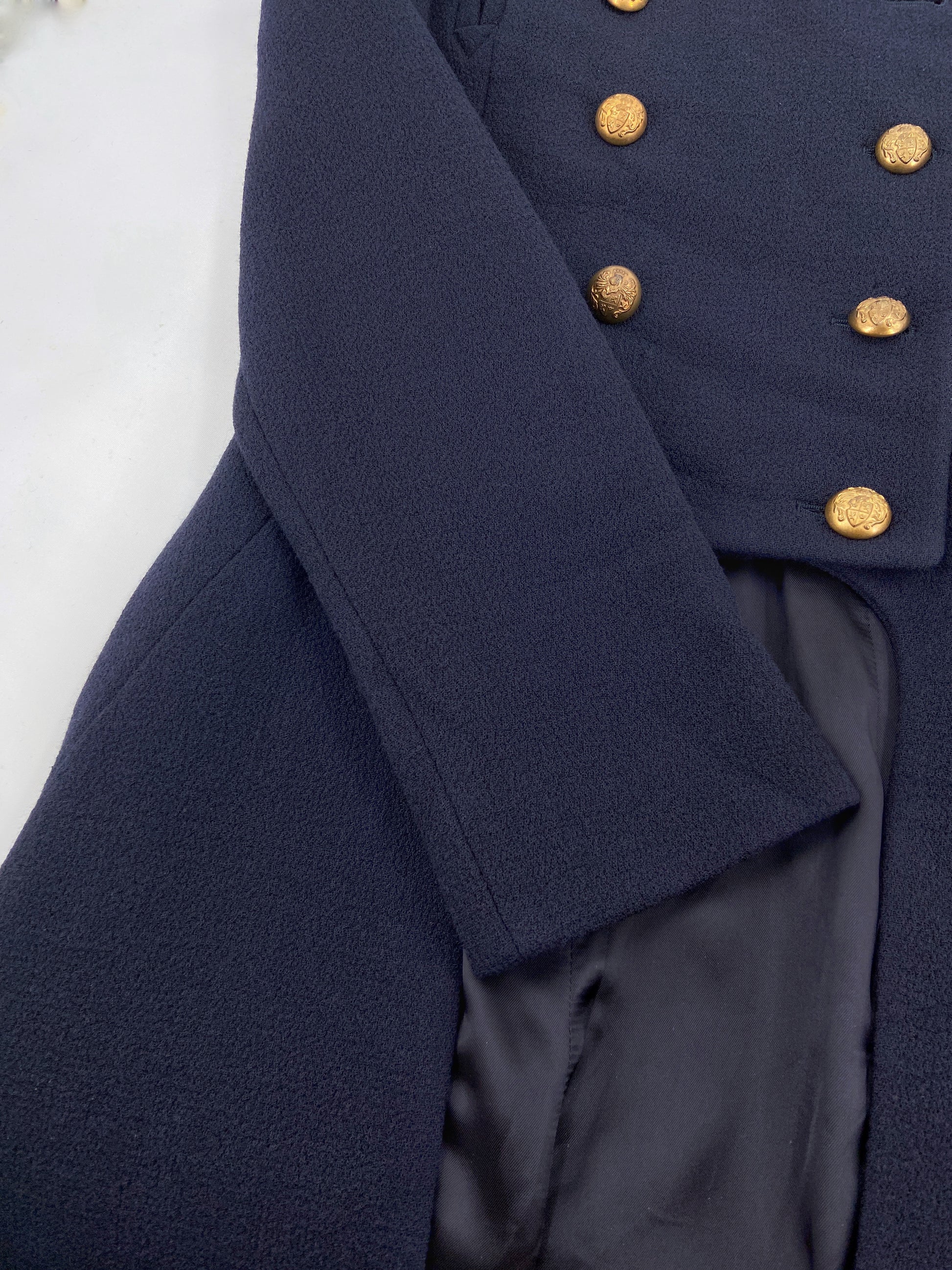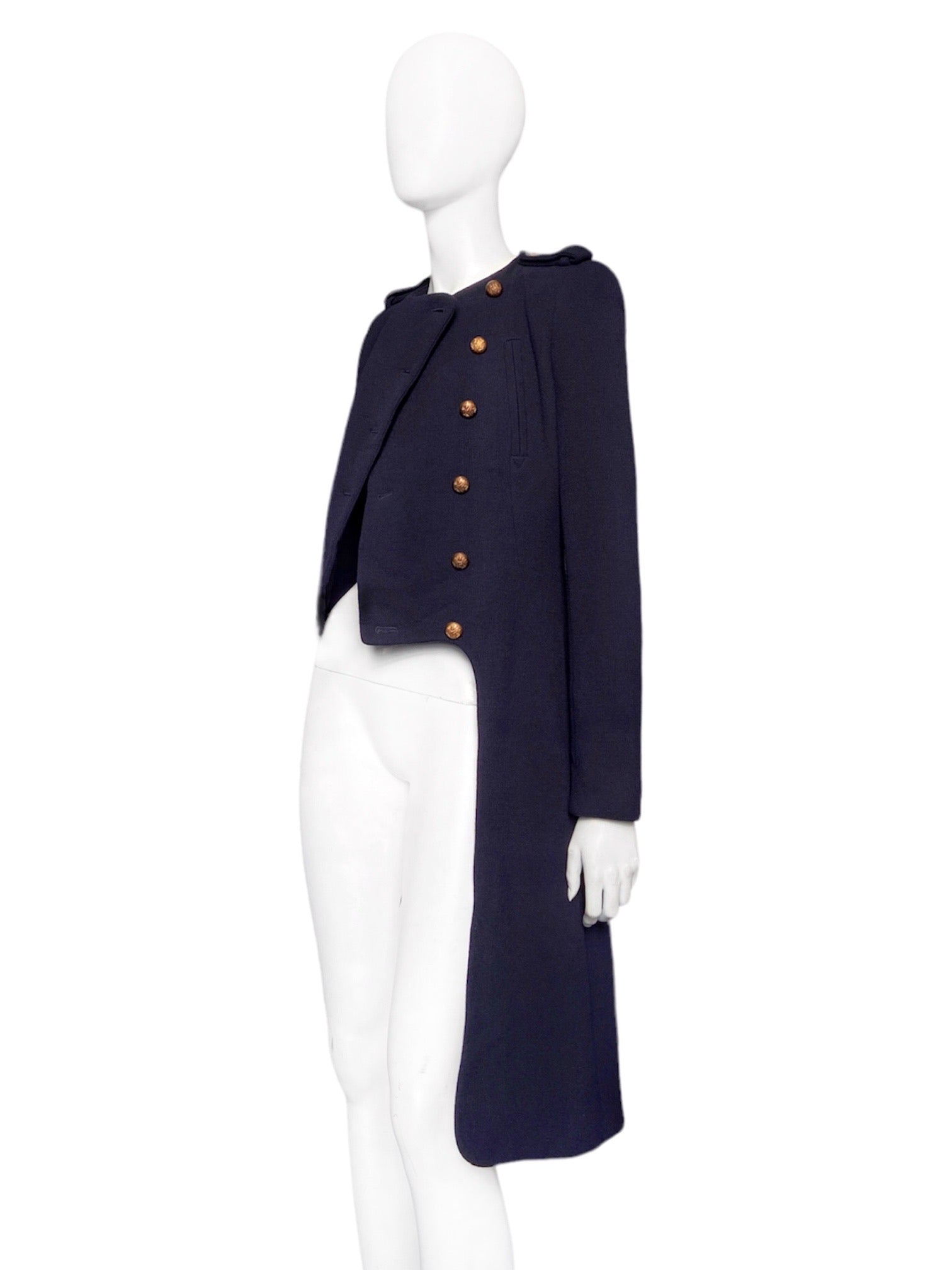 This is a double-breasted tailcoat with gold engraved buttons and decorated with epaulettes