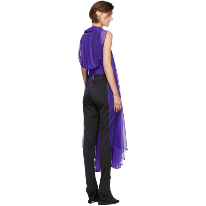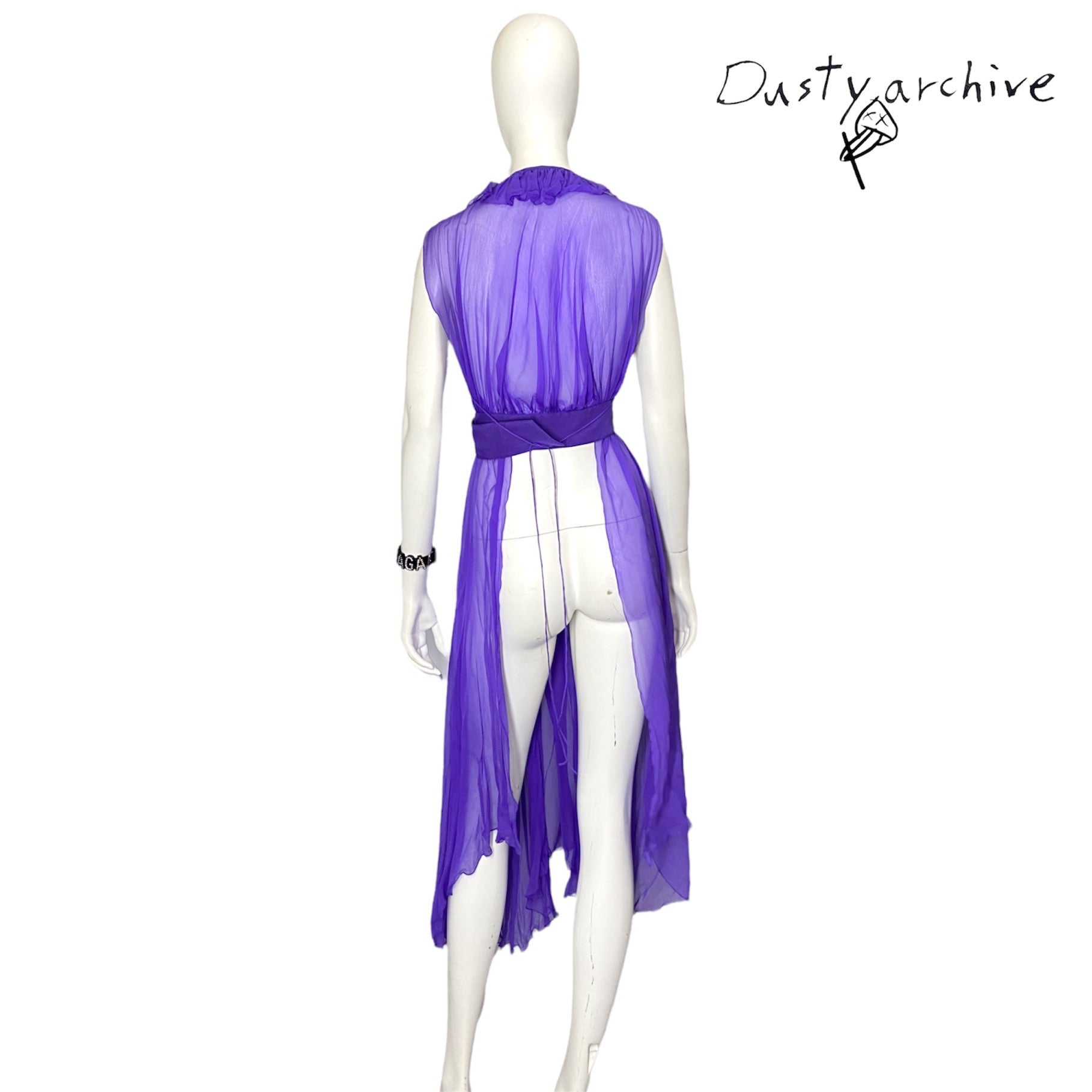An amazing silk dress by Demna at Balenciaga. Worth peaking under a coat on the fall 2017 runway, this purple dress is made from wispy silk-mousseline with a  cropped back and large buckled belt to cinch the waist. The front is a little more feminine with fluttery ruffles around the neckline and a keyhole fastening. Retail at 1875. brand new never worn no flaws.