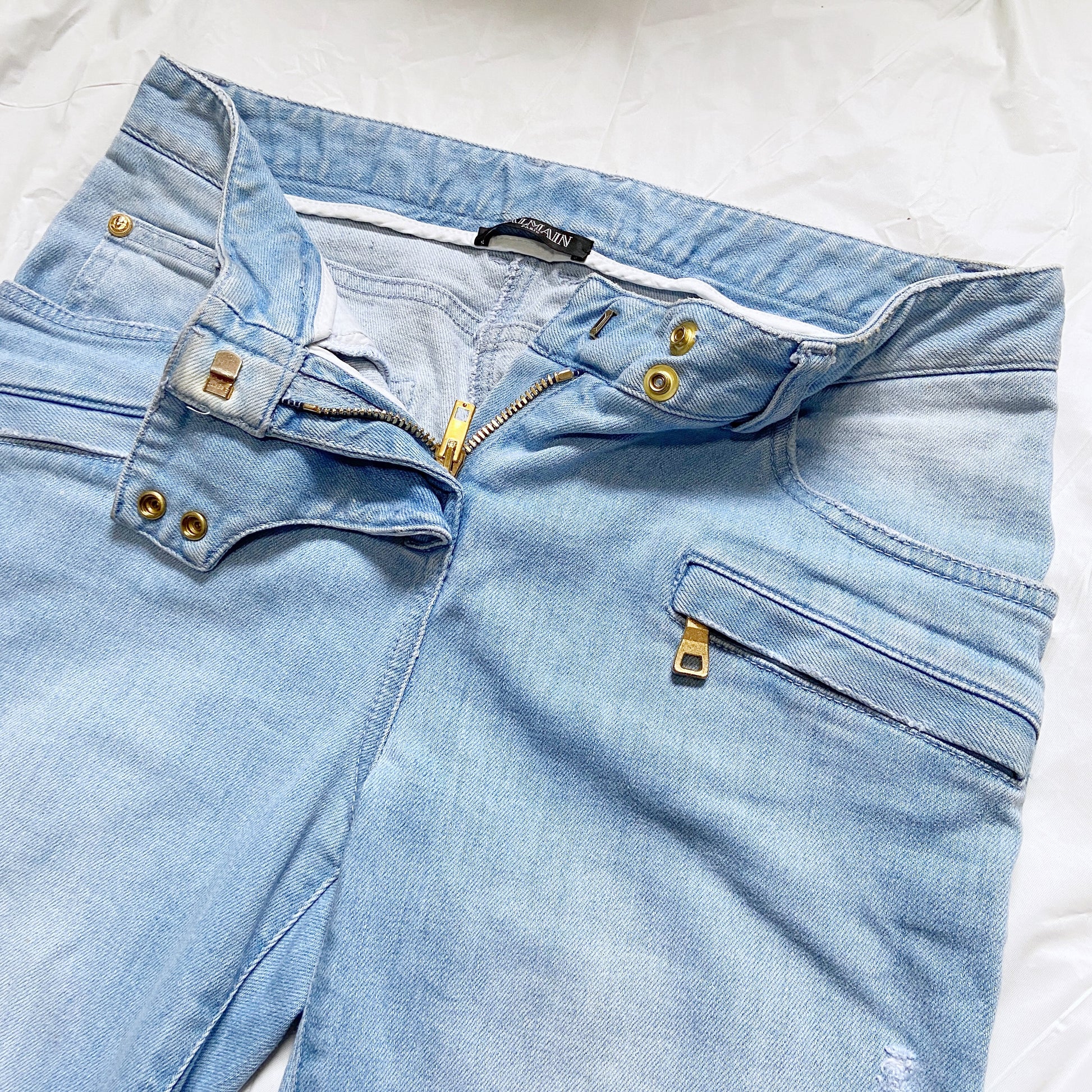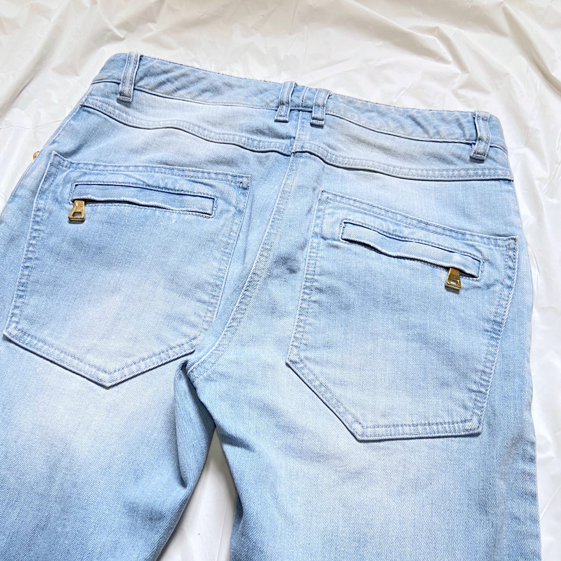Balmain Spring 2009 Decarnin era distressed light blue gold zipper jeans