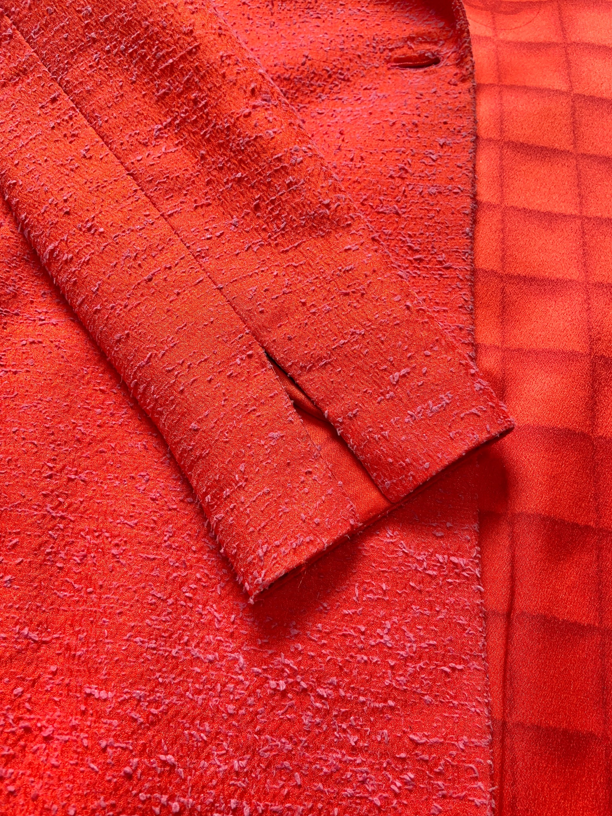 A stunning red coat with a beautiful red fabric with a distressed like finish