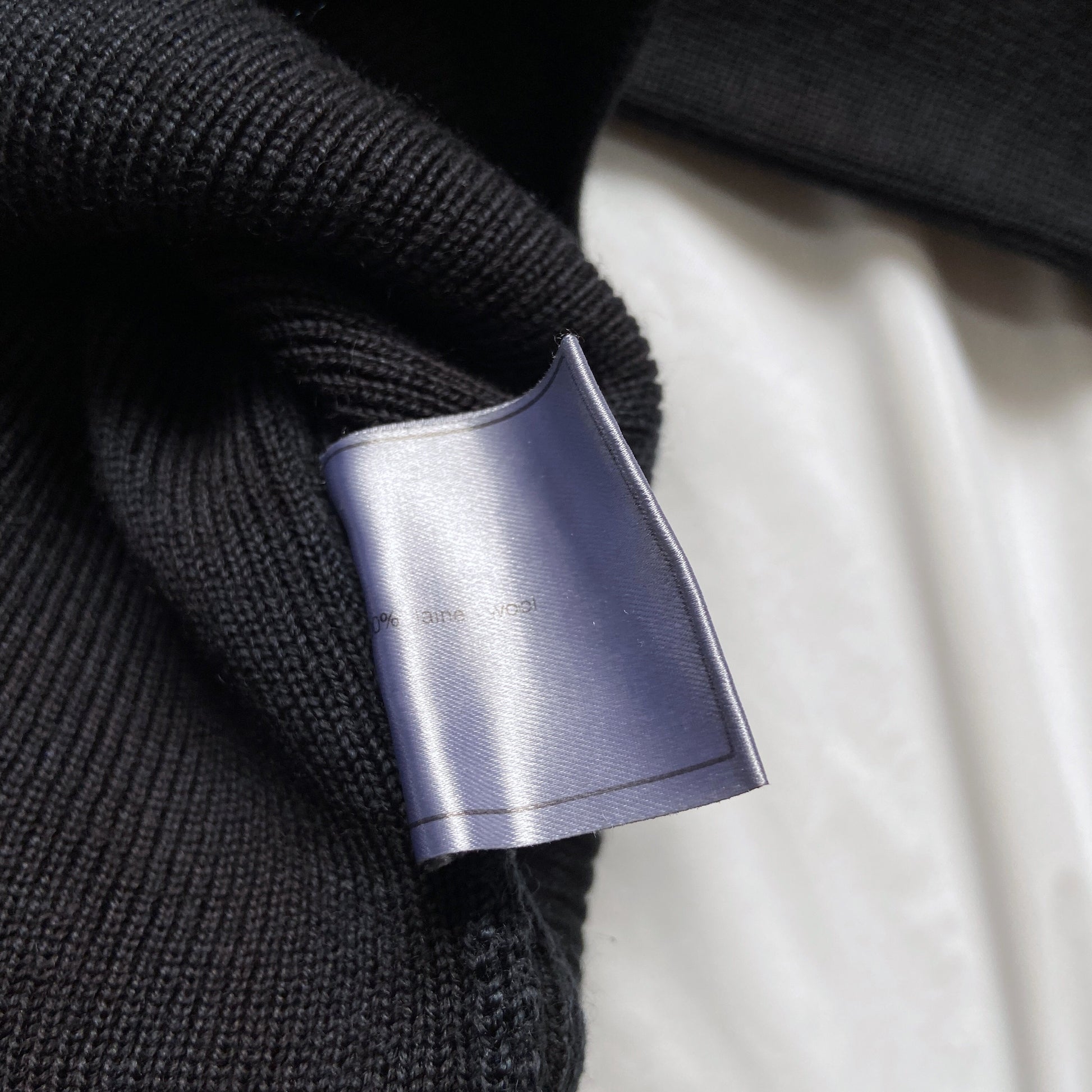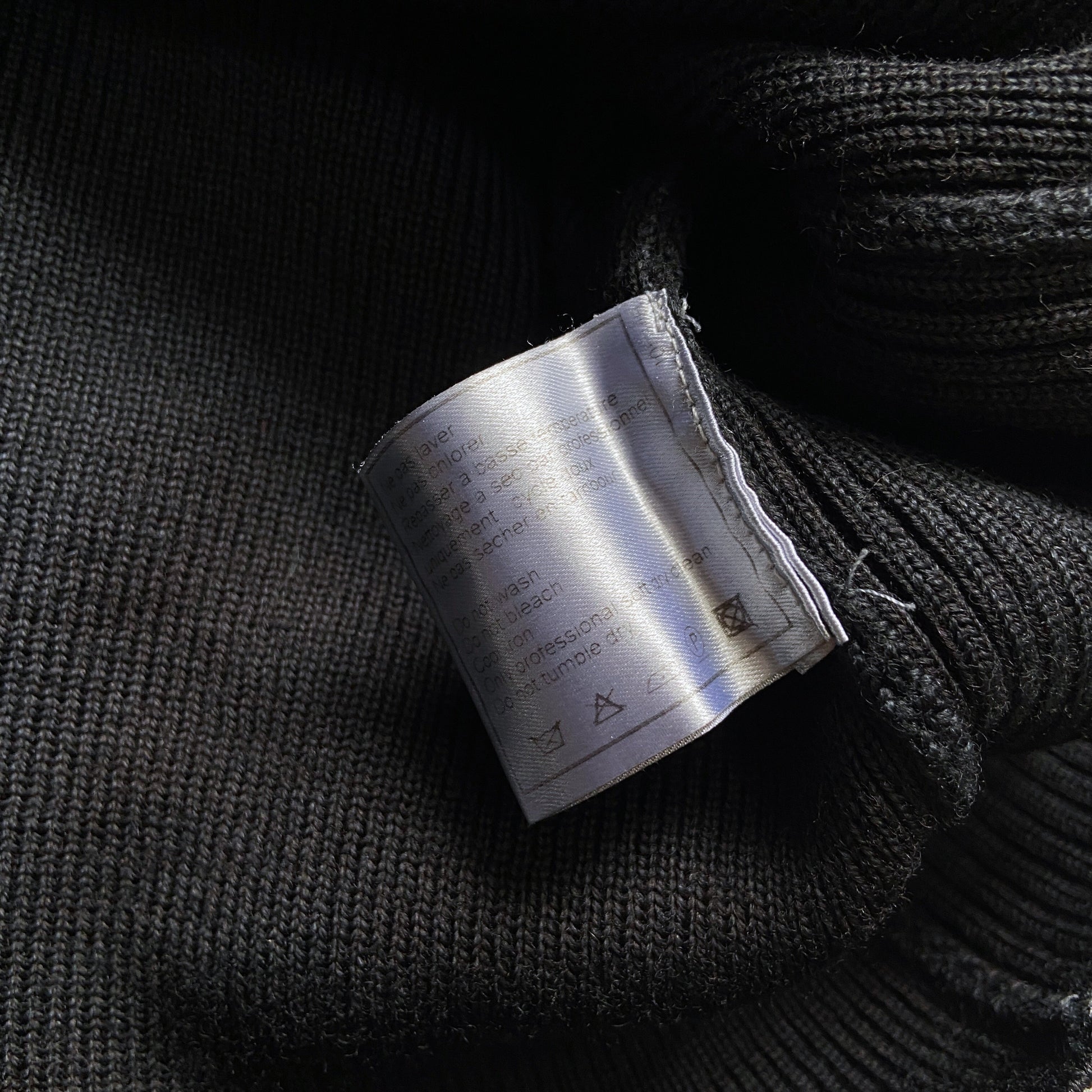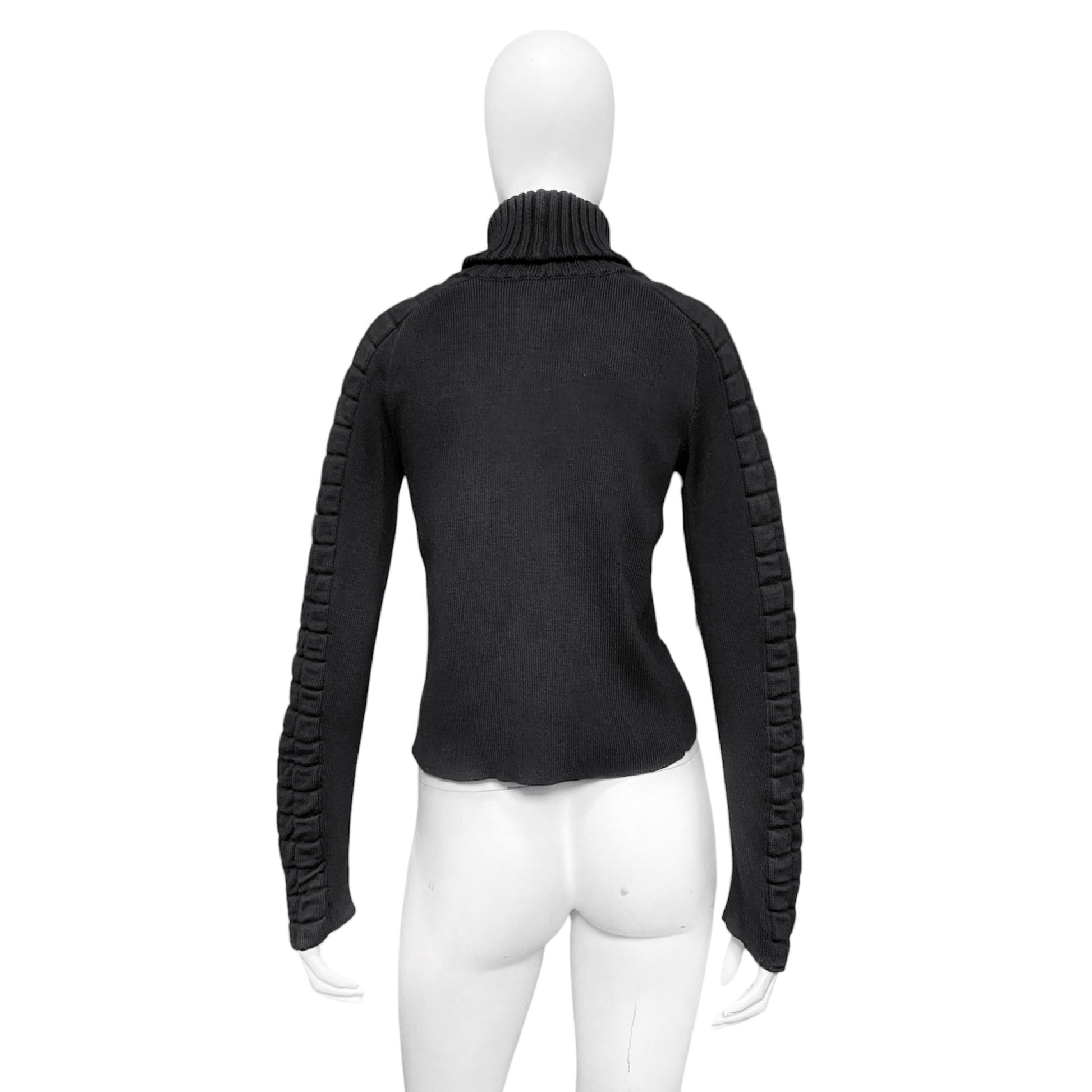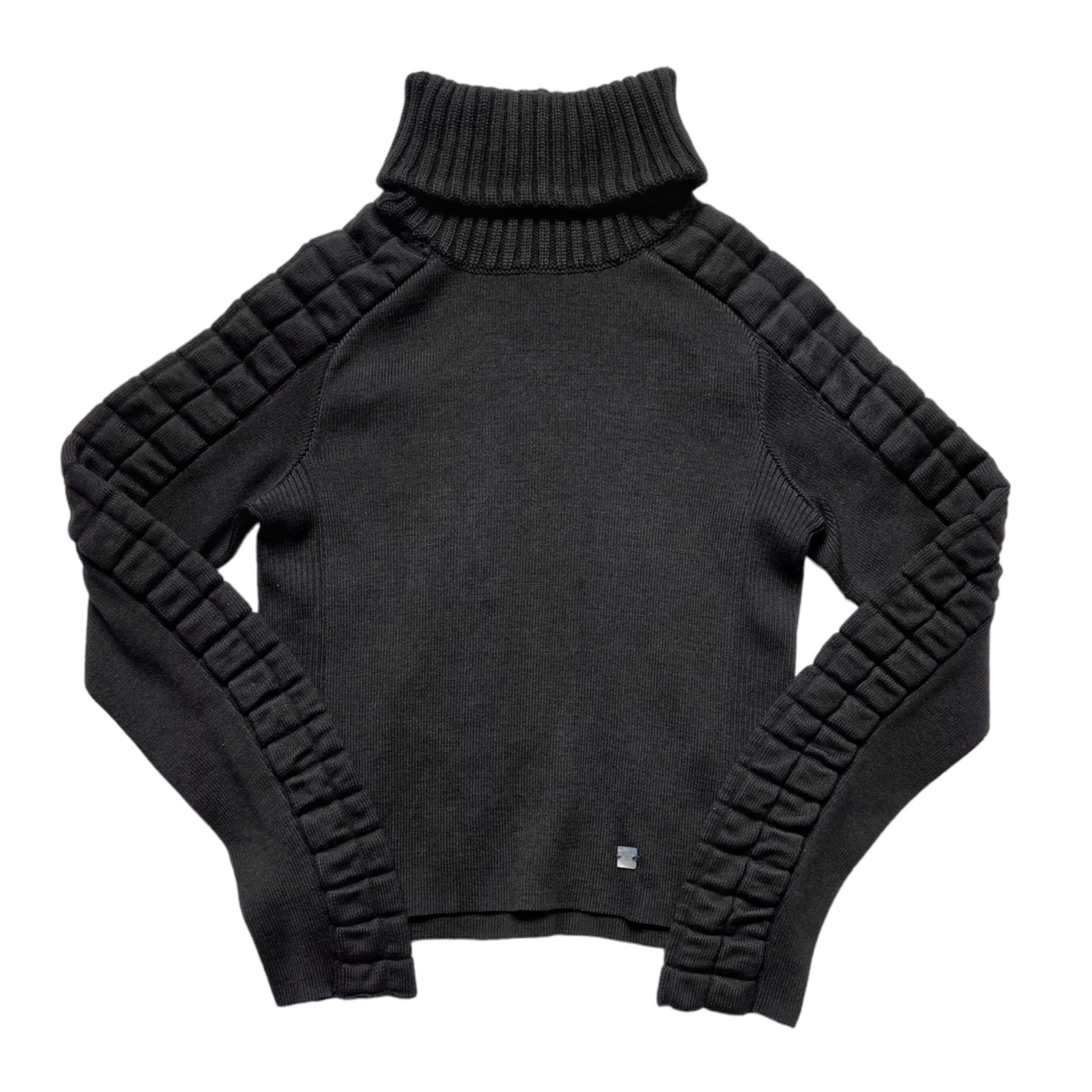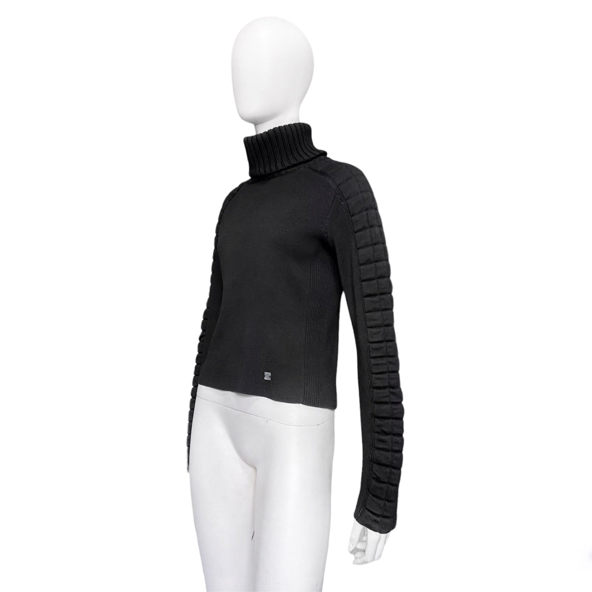 Comfort and warmth will be assured with this fantastic knitted wool sweater ! Part of the look 23 and 27 (see picture 3 and 4) of the Chanel Fall-Winter 2000-2001 runway show, it is designed for a slightly slim fit and has a cozy turtleneck. The shoulders and the sleeves are highlighted with a knit pattern reminiscent of the house signature quilted squares. The black color looks especially chic with tonal tailoring and dark denim. Unlined and labeled a French size 38 (US 4-6), this sweater is also suitable for perfecting your ski outfit !