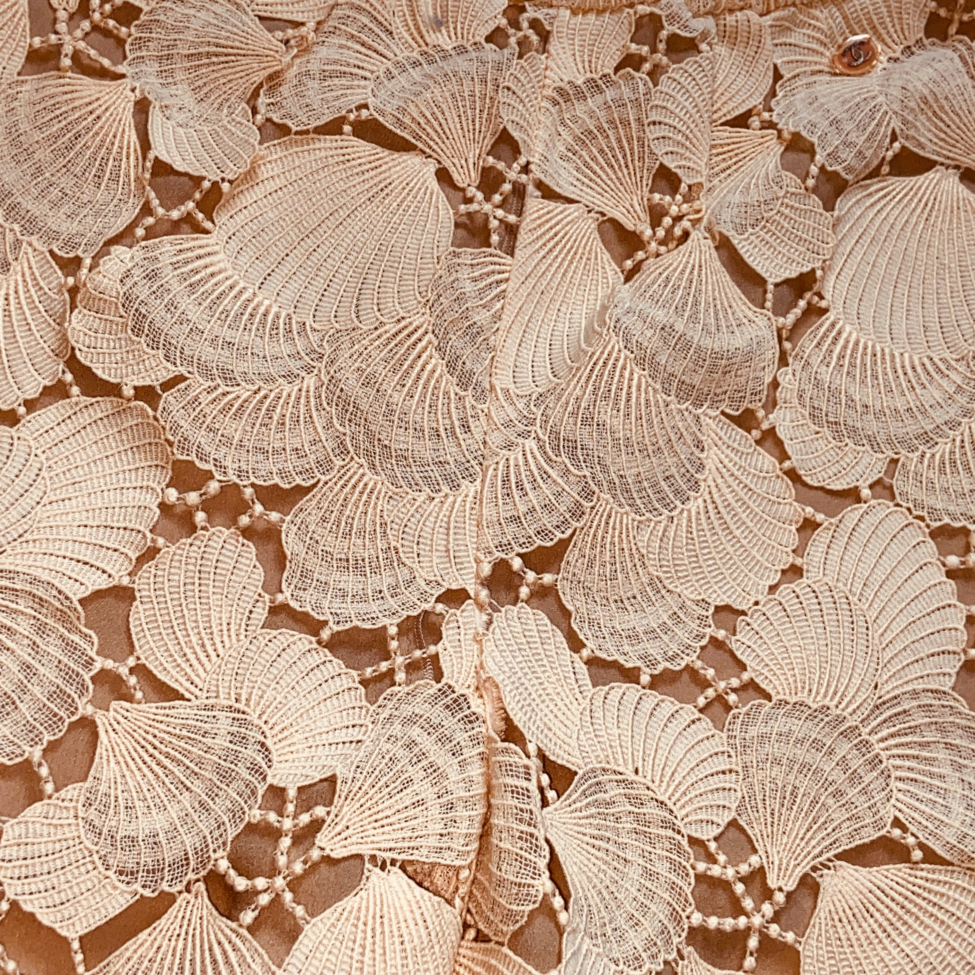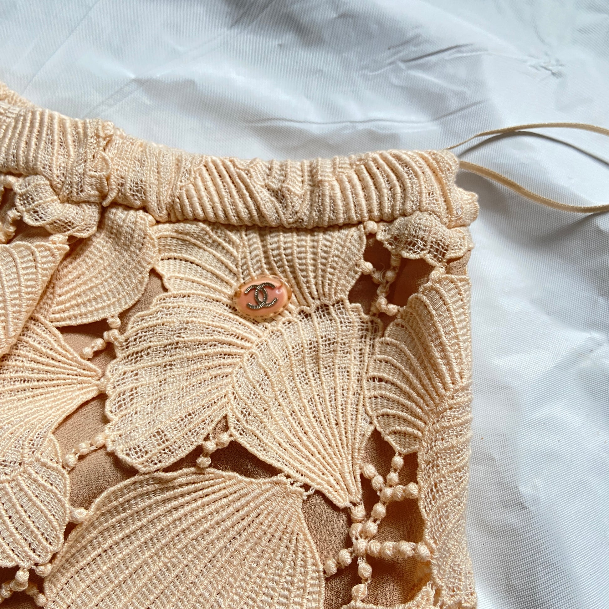 A very pretty pair of shorts from karl’s designs. With beautiful embroidery resembling seashells or floral patterns. In mint condition, except the tag has been cut, the chanel logo embellishment is still intact.