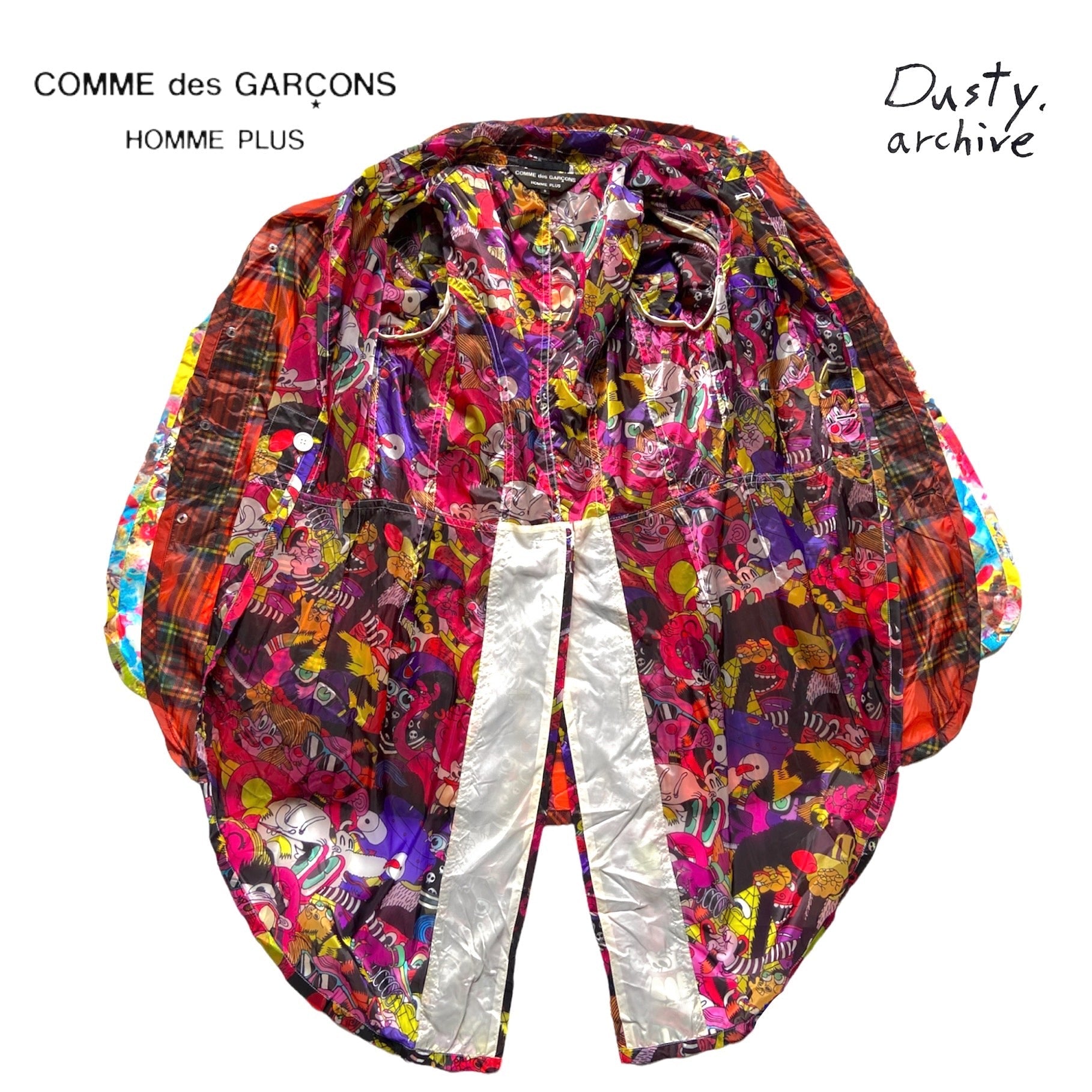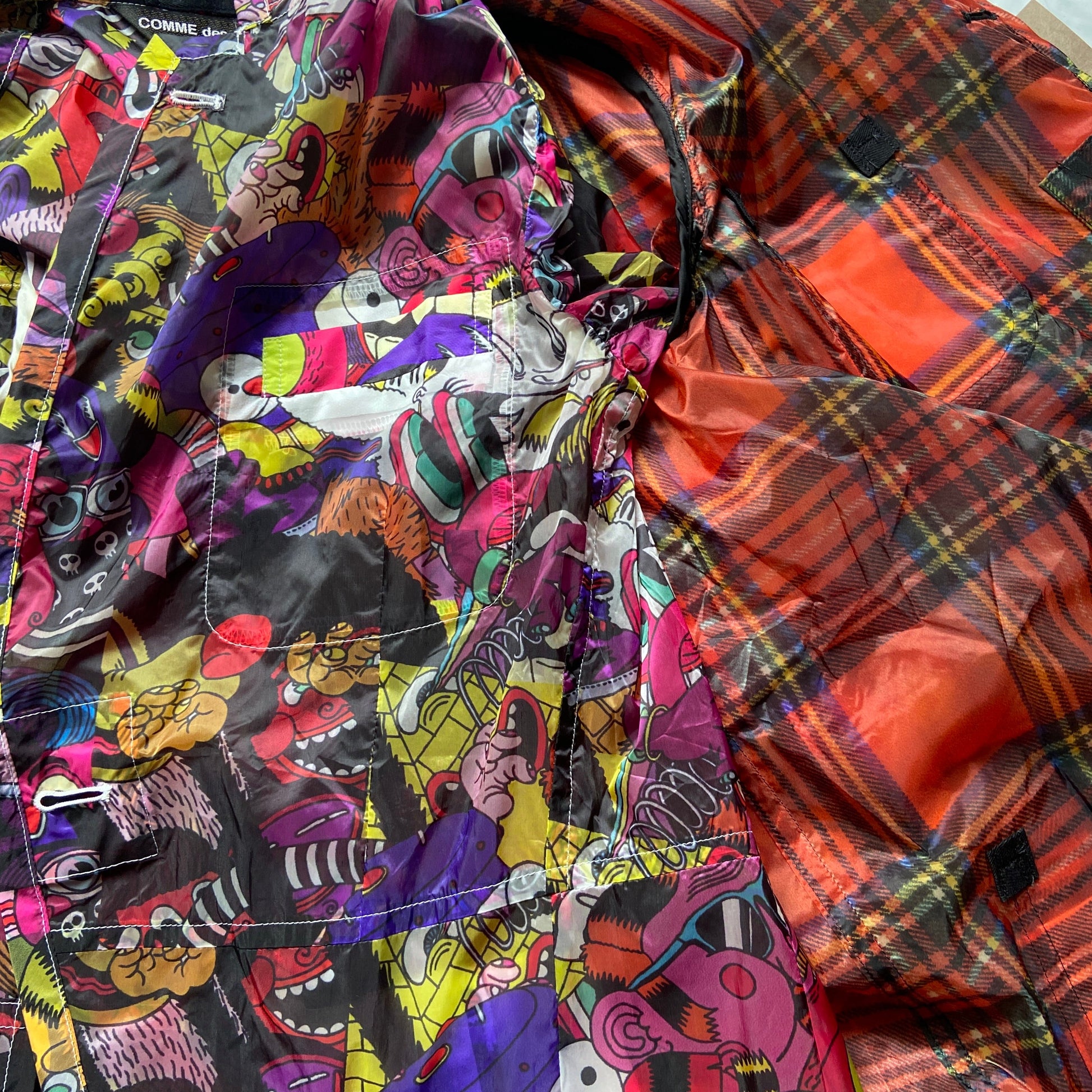 An insane jacket from th ss14 cdgh+ runway. Triple layered, consist of three individual jackets with different prints two cartoons and the middle plaid, all with pockets and buttons on sleeve cuffs and front. Visual insanity. Prints designed by olleborebla. Brand new never used with tags. Probably never see this again 😙