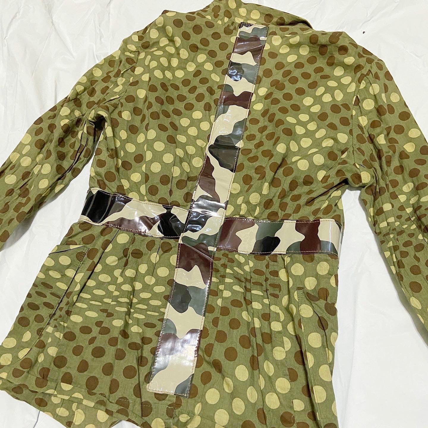 A brilliant example of the genius of 2000s comme, balancing graphics heavy with structural pioneering, Grandma Rei is once again proved to be the goat. As seen on kate moss and runway, this green iteration combines the psychedelic aspect with militaristic camouflage print, with two strips of plastic that structures the blazer overall, the strip also covers the front button, and therefore only the top button can be used. Super light material with two side pockets.
