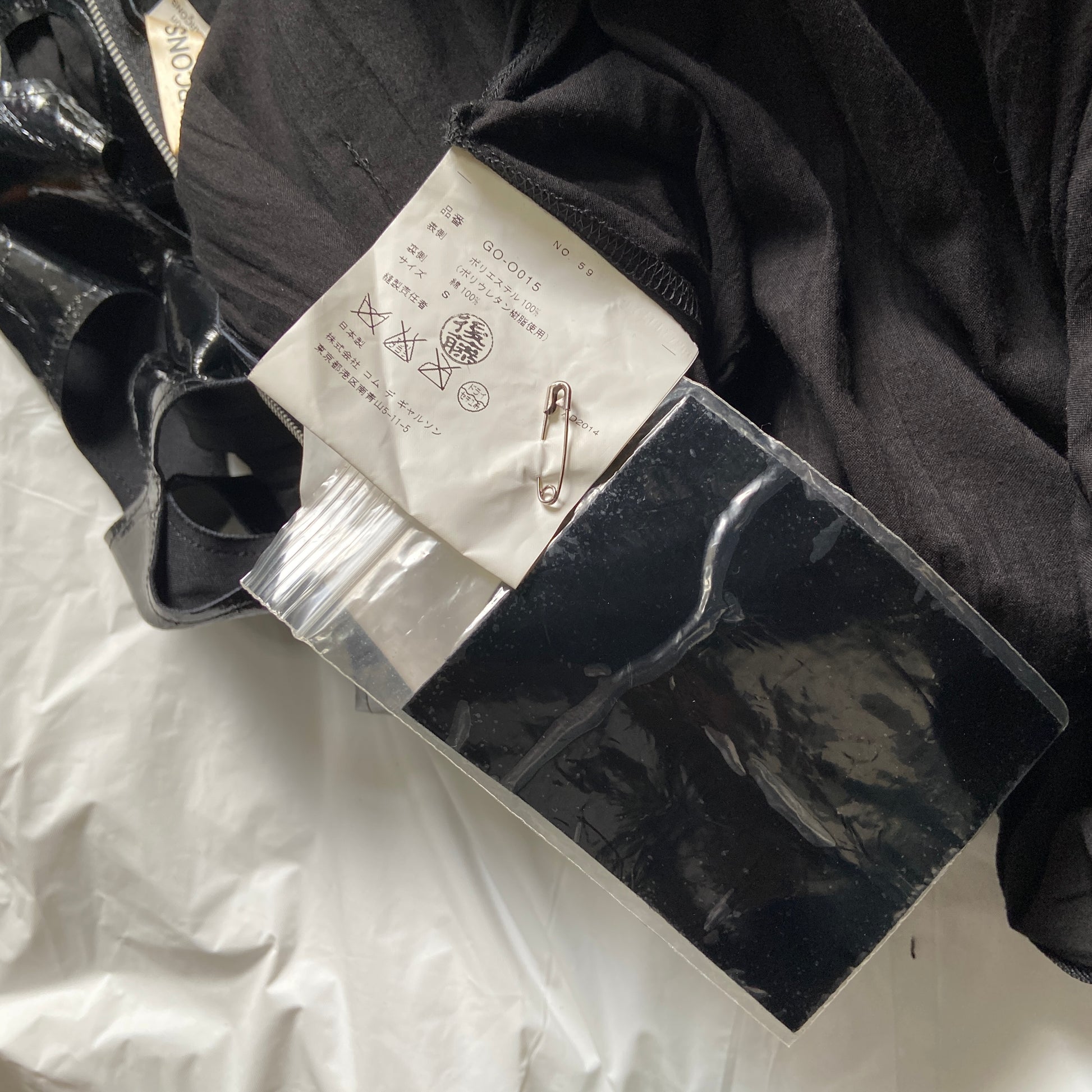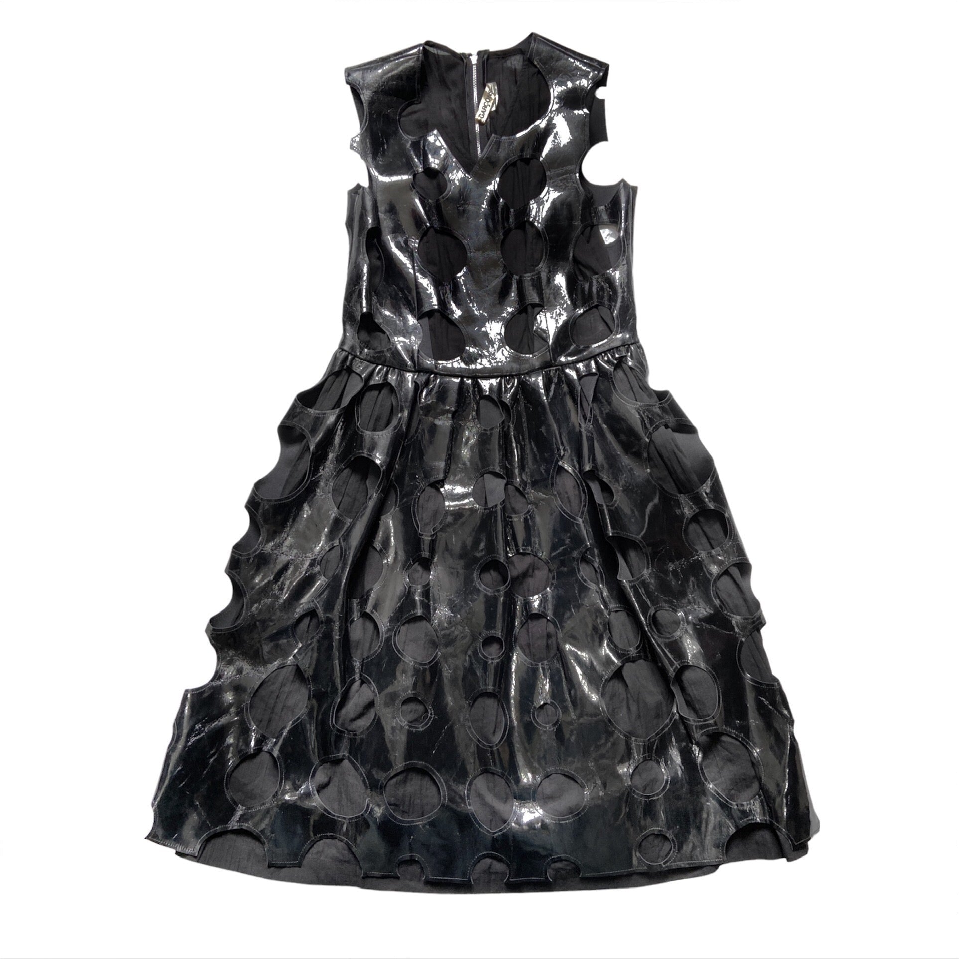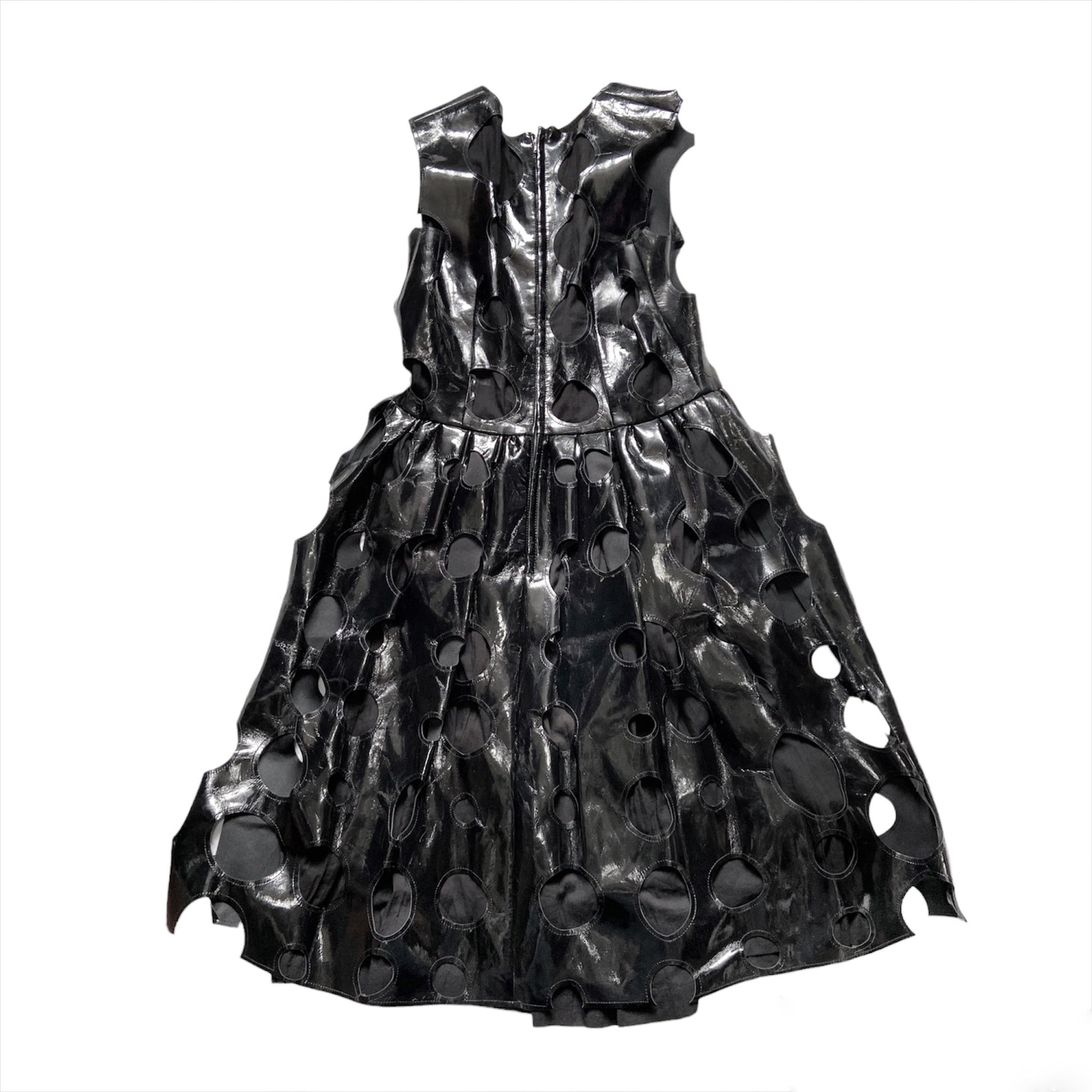 A classic from CDG designs. With circle cut outs on reflective pvc, creating this provocative dress. Theres a soft cotton lining, unfortunately theres some creasing on the pvc, not visible from a distance.