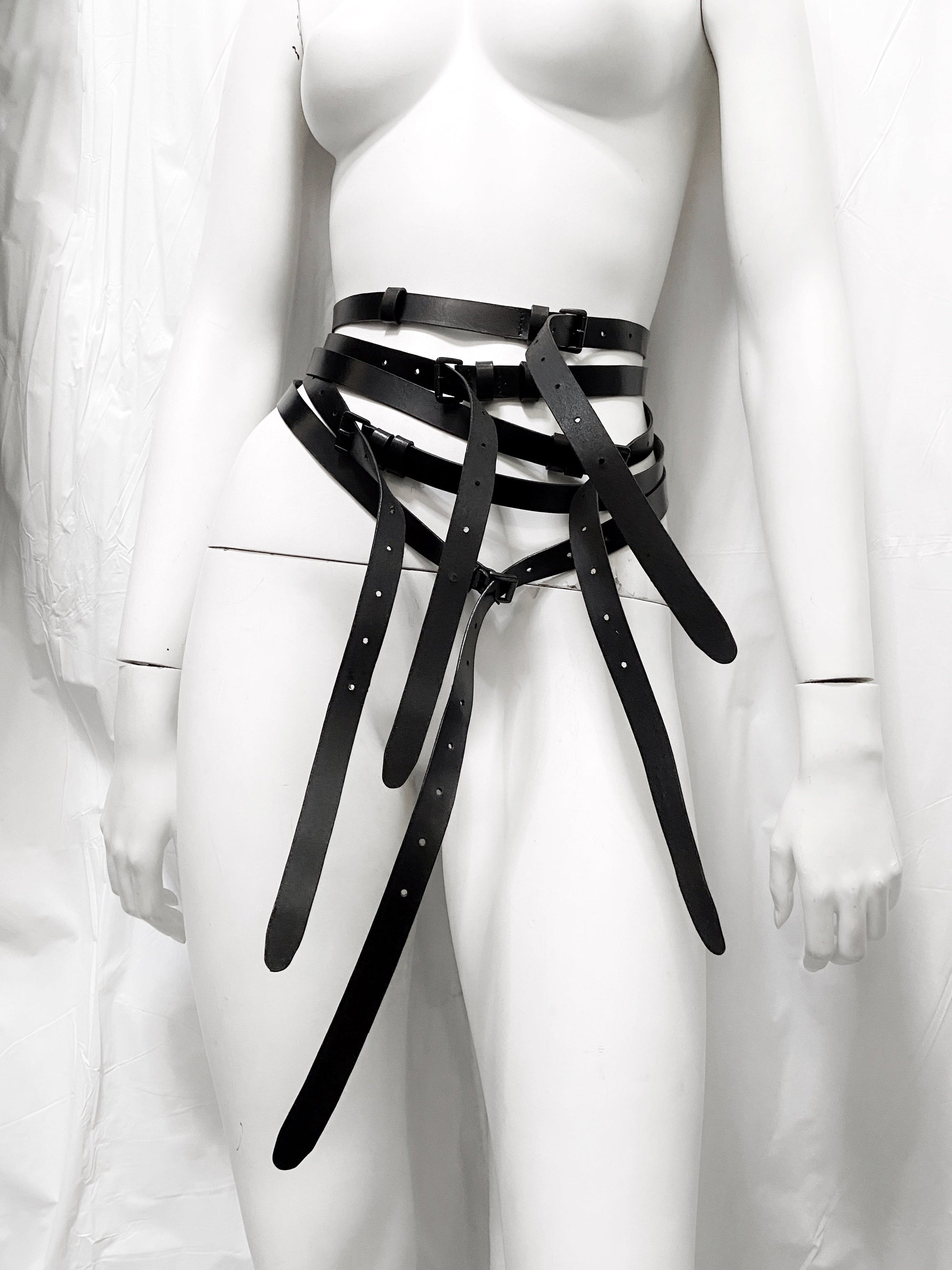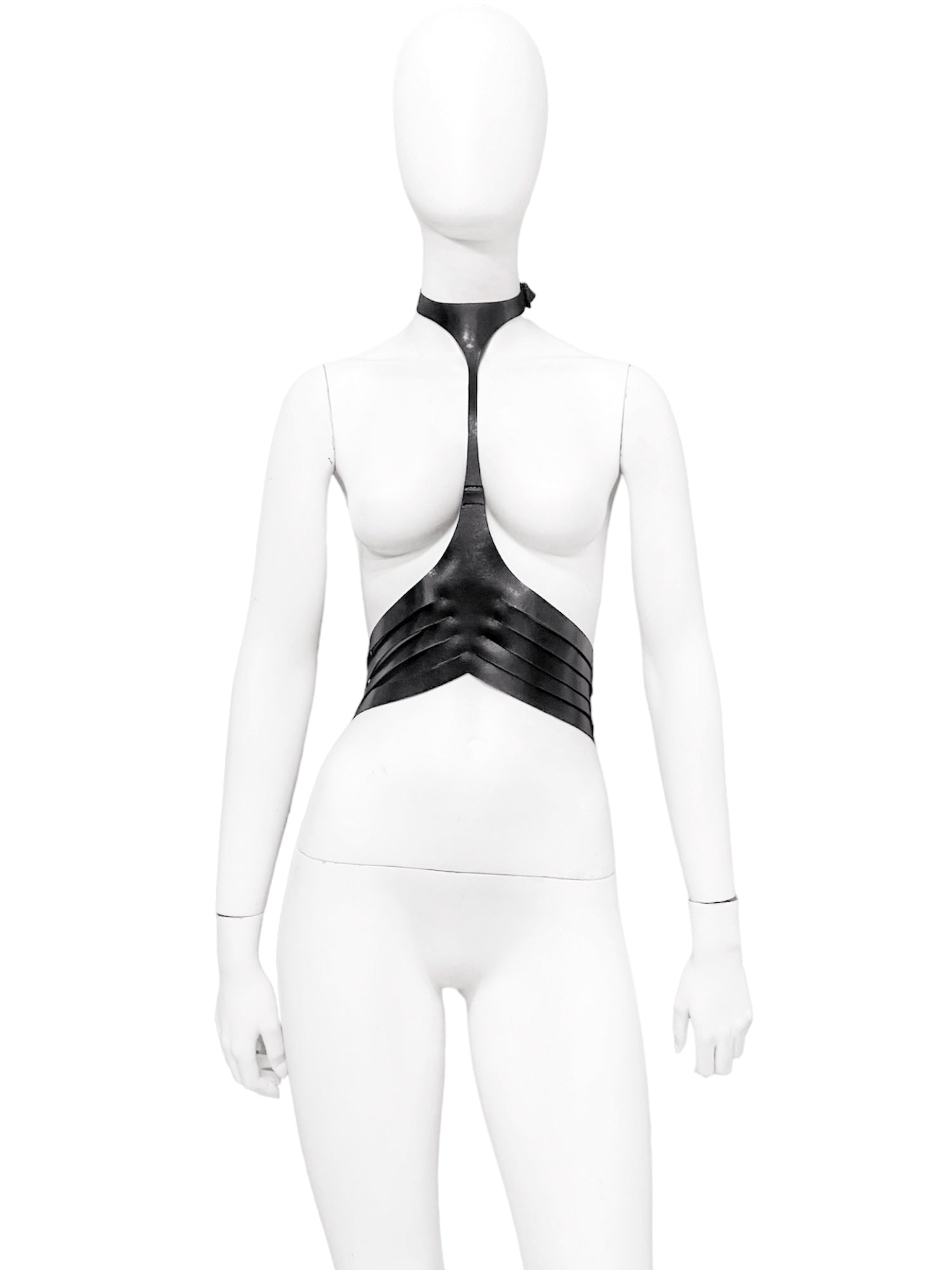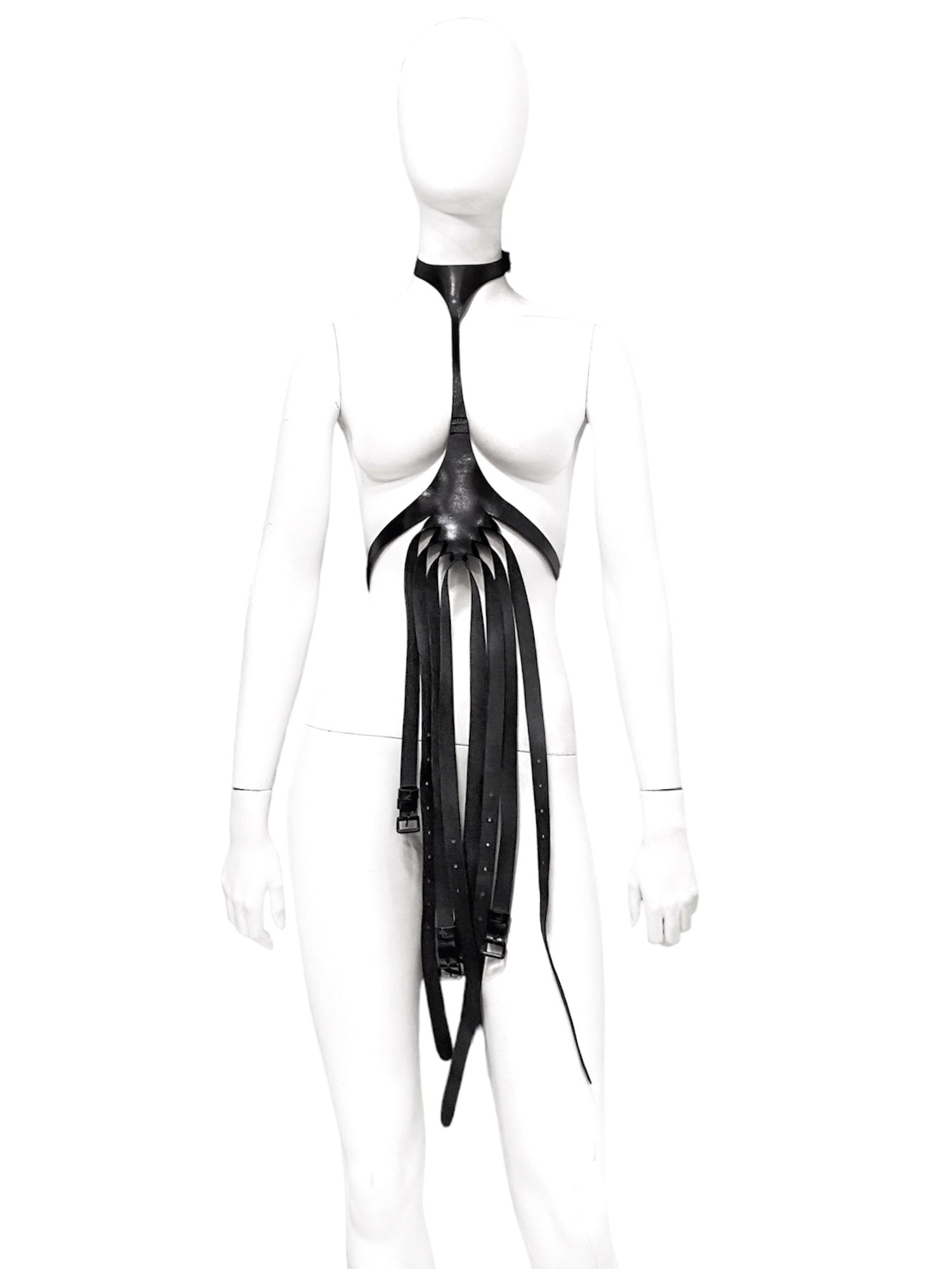 With a belted collar and body and can be styled in many ways, namely unbuckled and flipped around with the full visual chaos of the belts, there’s also one look that styled the harness with the collar belts connected with the first body belt, which created a sort of backpack like design