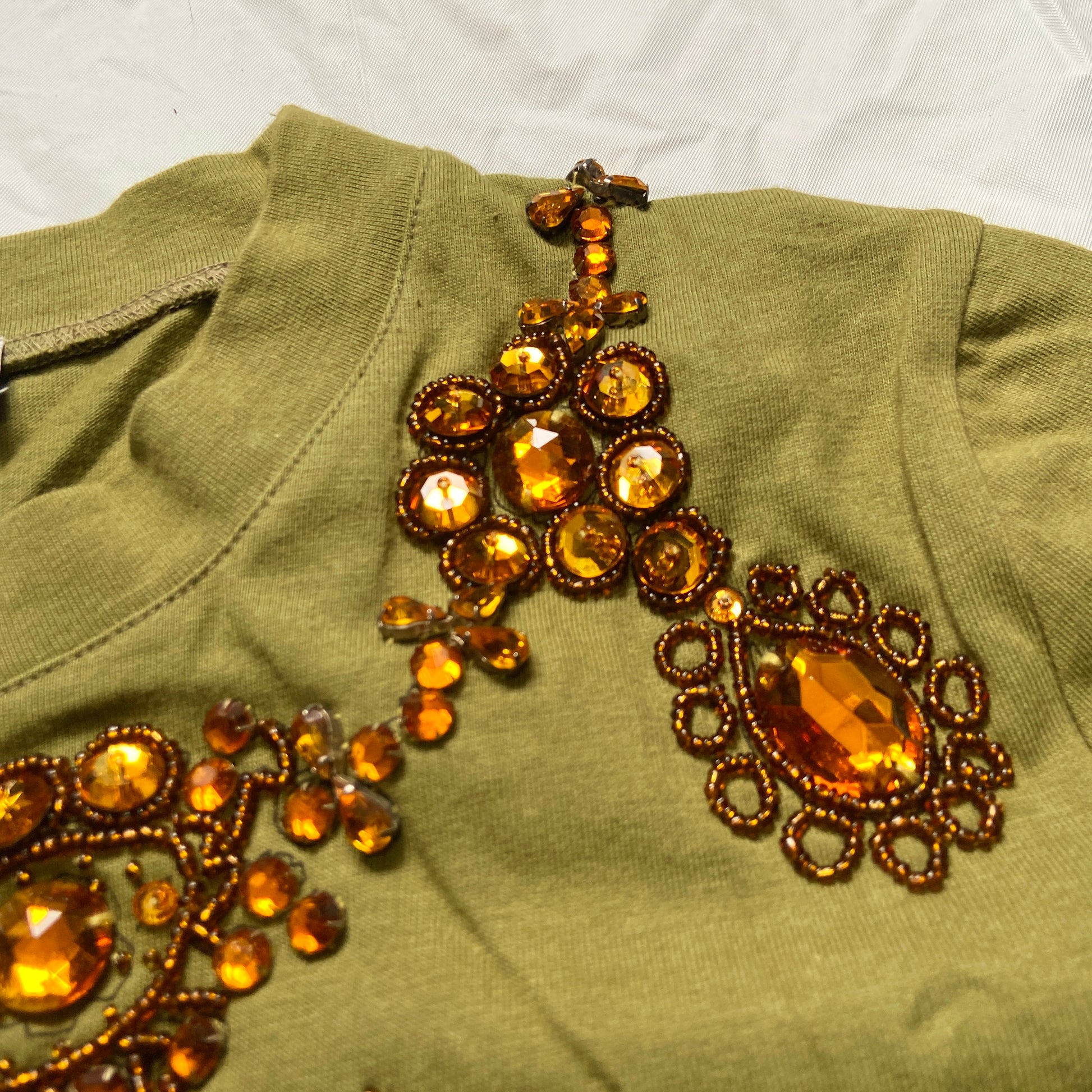 A girly chic tee with gems sewed on as a trompe l’oeil necklace, with amber Swarovski crystals and beads individually hand sewn on the tee , which goes on both the front and back. Bwnt only tried on tag was removed to avoid damaging the tee. Mint condition no defects.