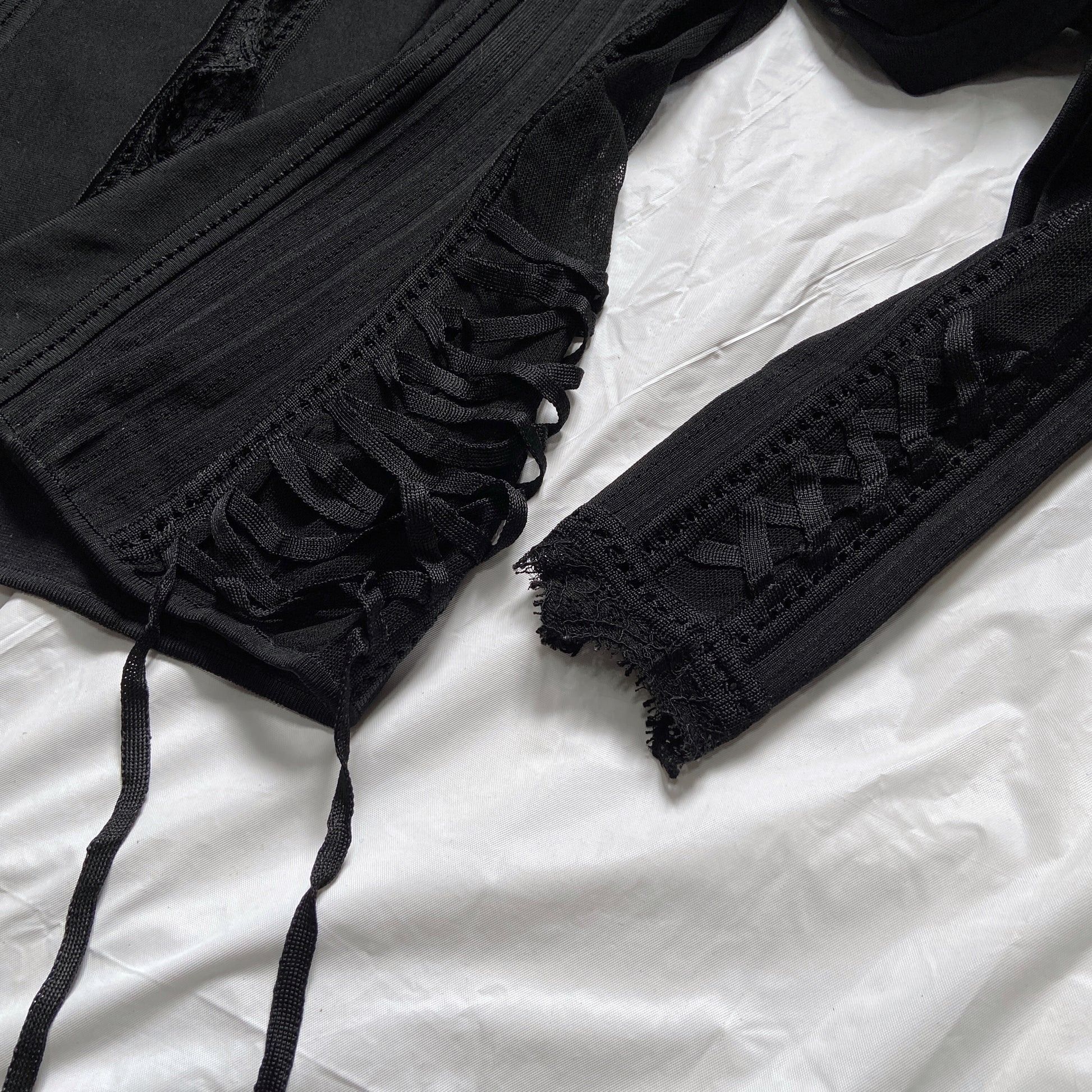 Bondage lacing detail at the waist and the cuffs, which when worn the mesh would highlight the lacing contrasting the skintone. Stretchy material, tight fit