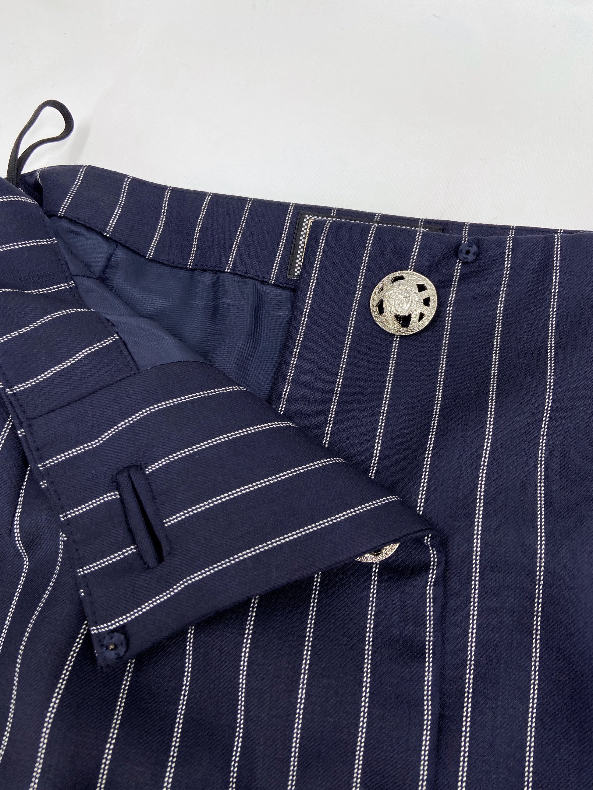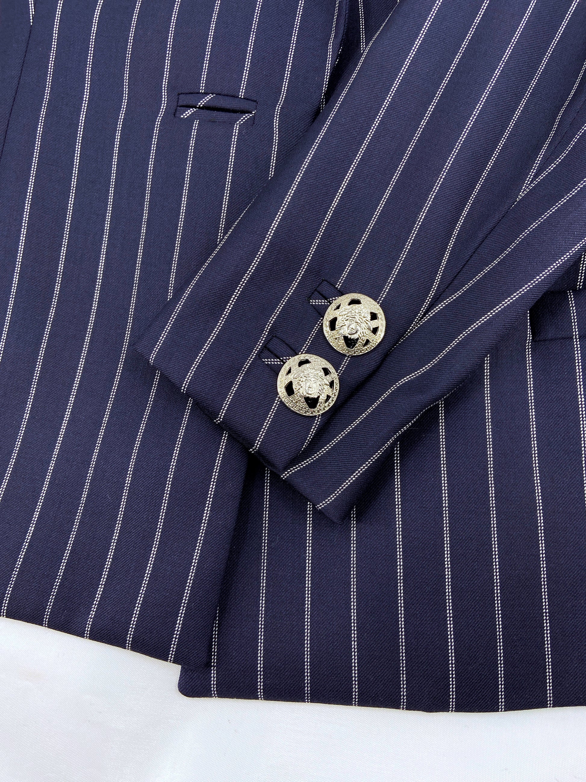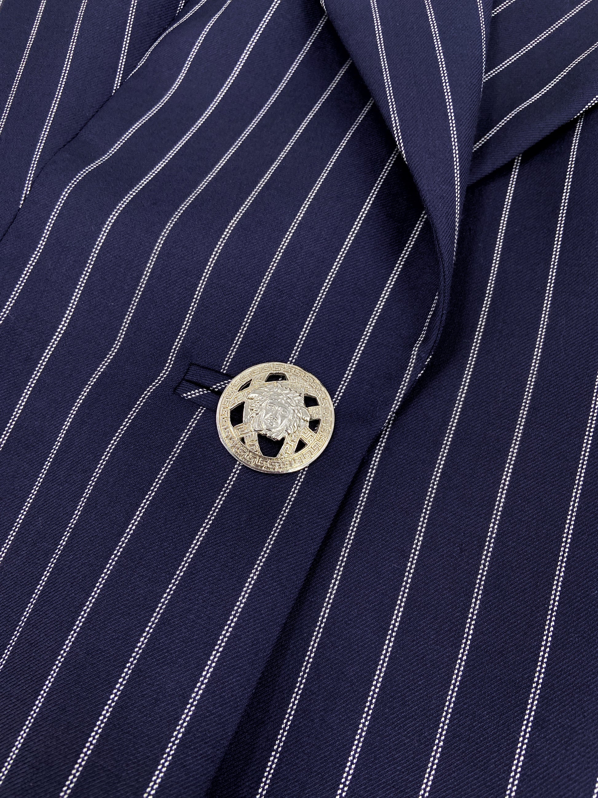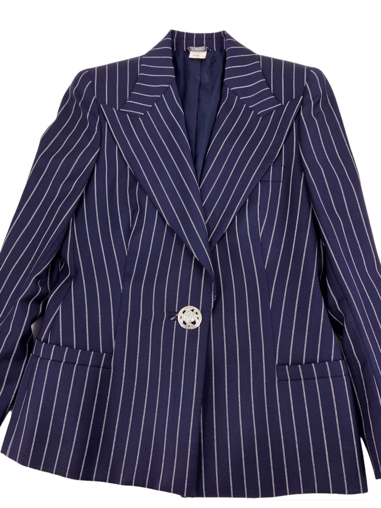 Stunningly constructed blazer, peak lapels, padded shoulders and oversized silver button with Medusa logo, paired with matching high waisted wrap skirt with also matching buttons
