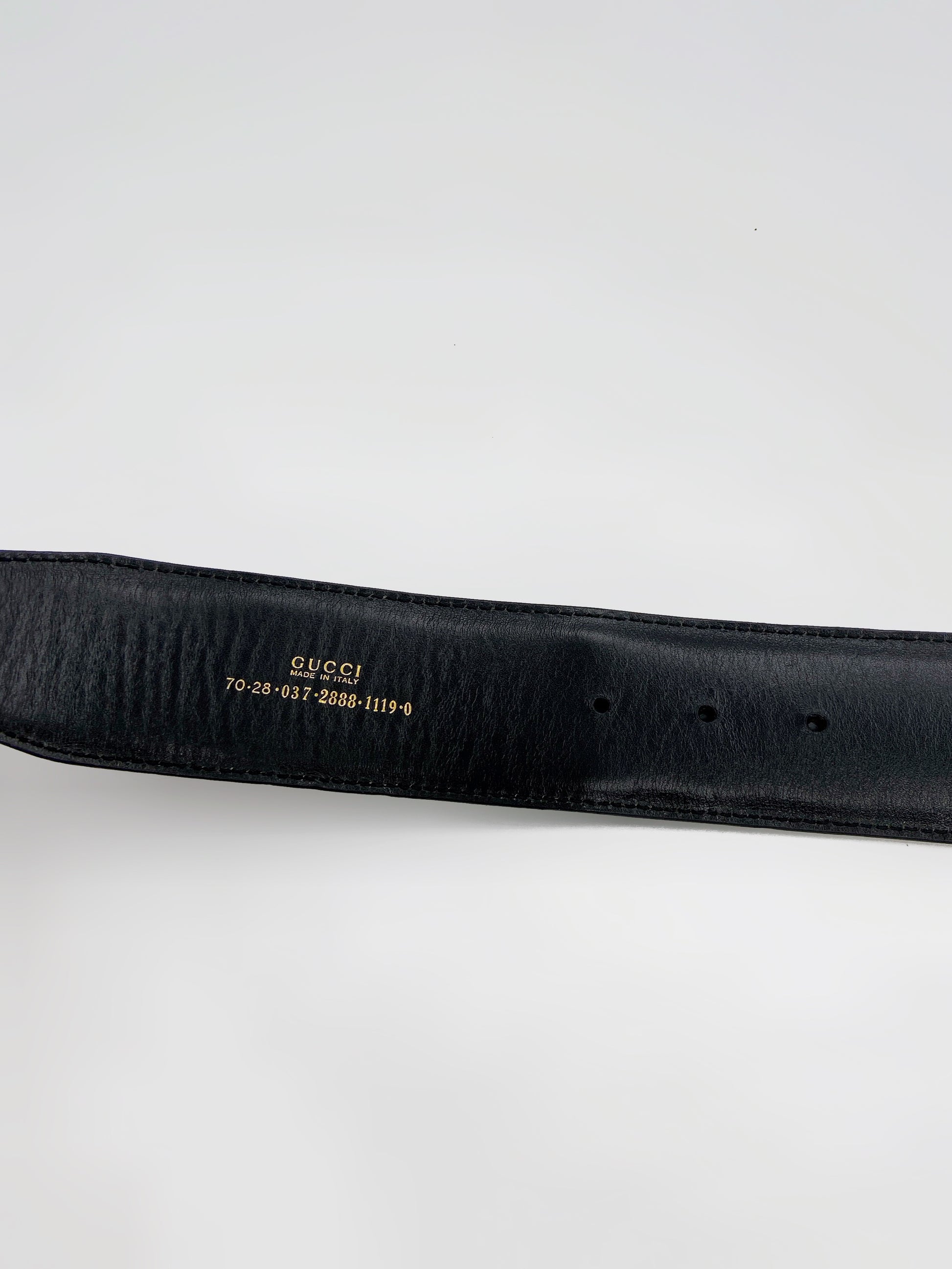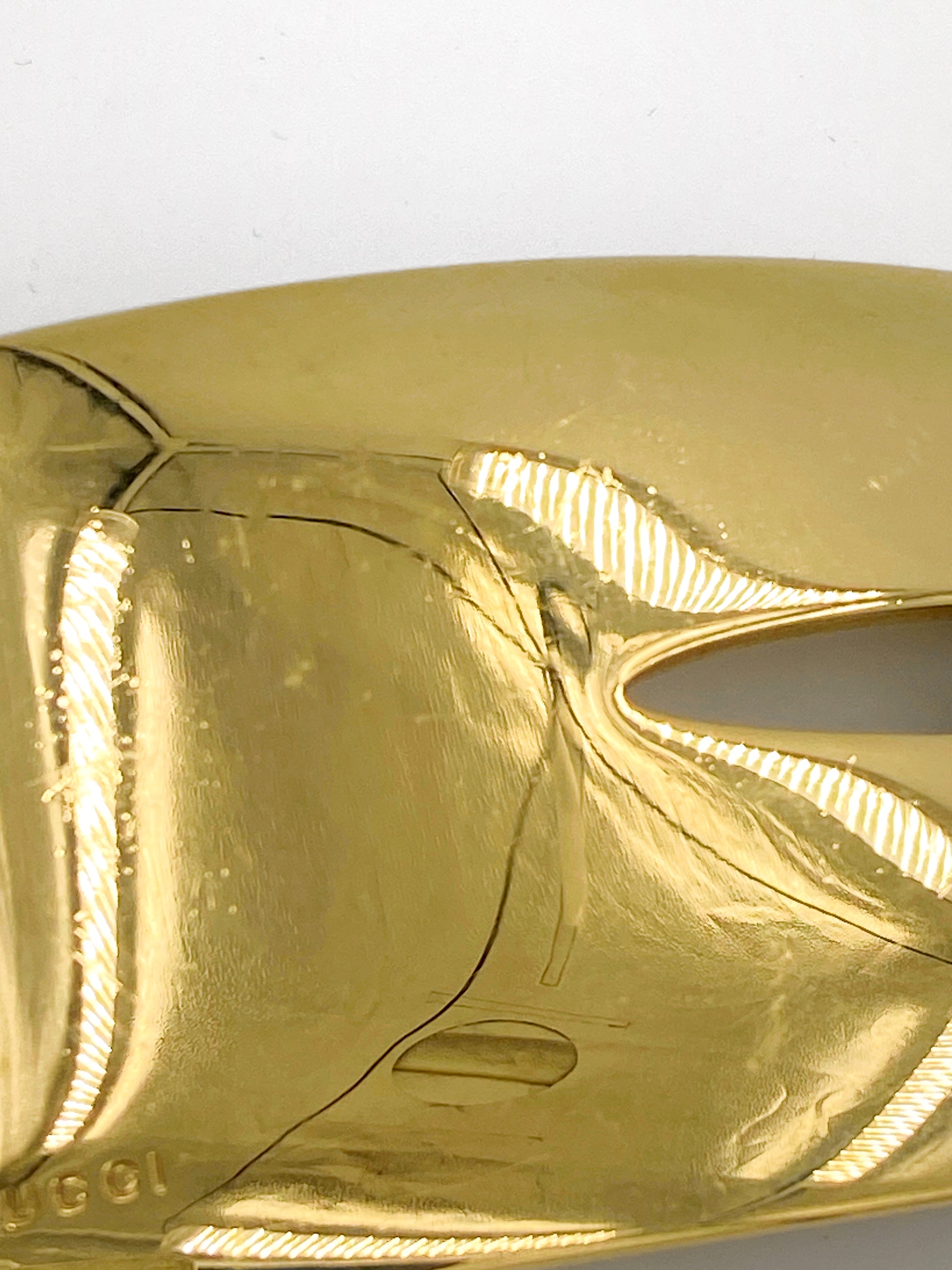 One of the very iconic belts from the collection, with three versions of “G” reworked into eyecatching oversized gold ornaments