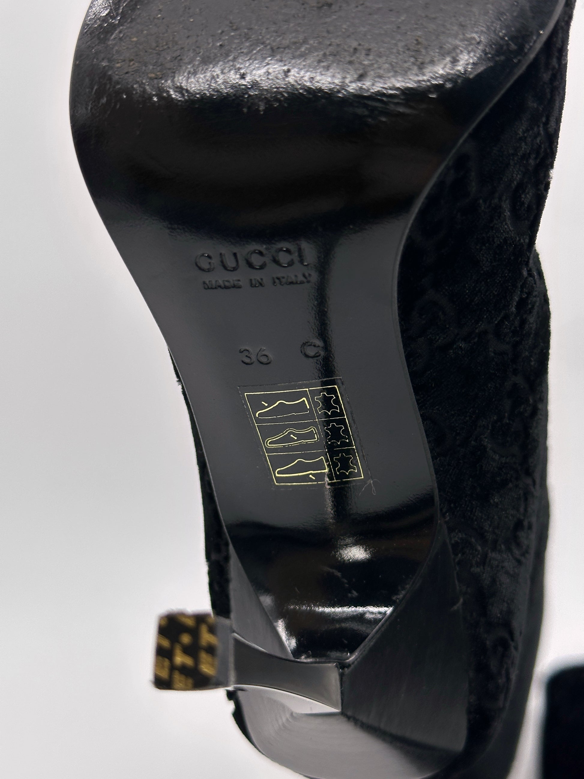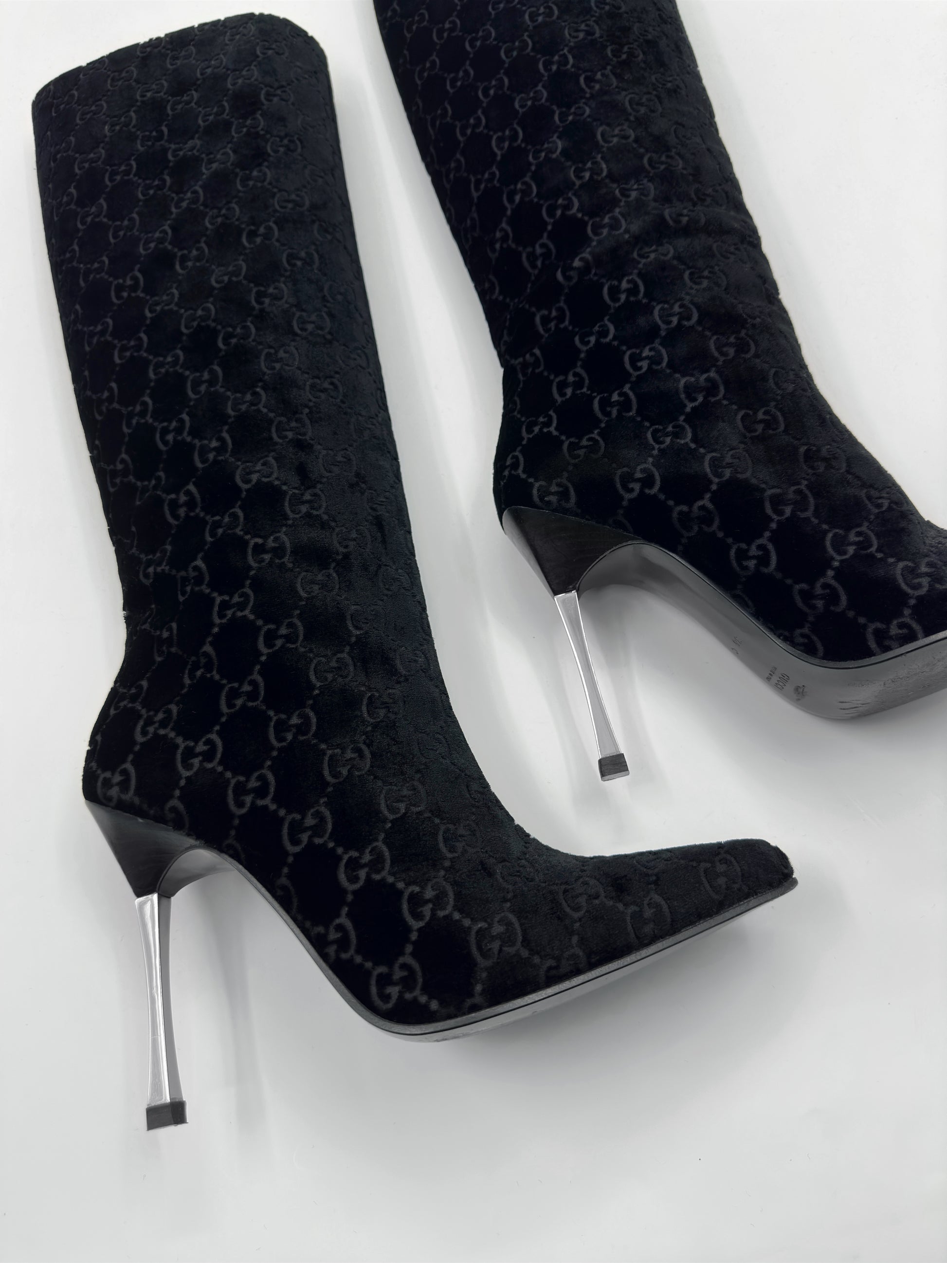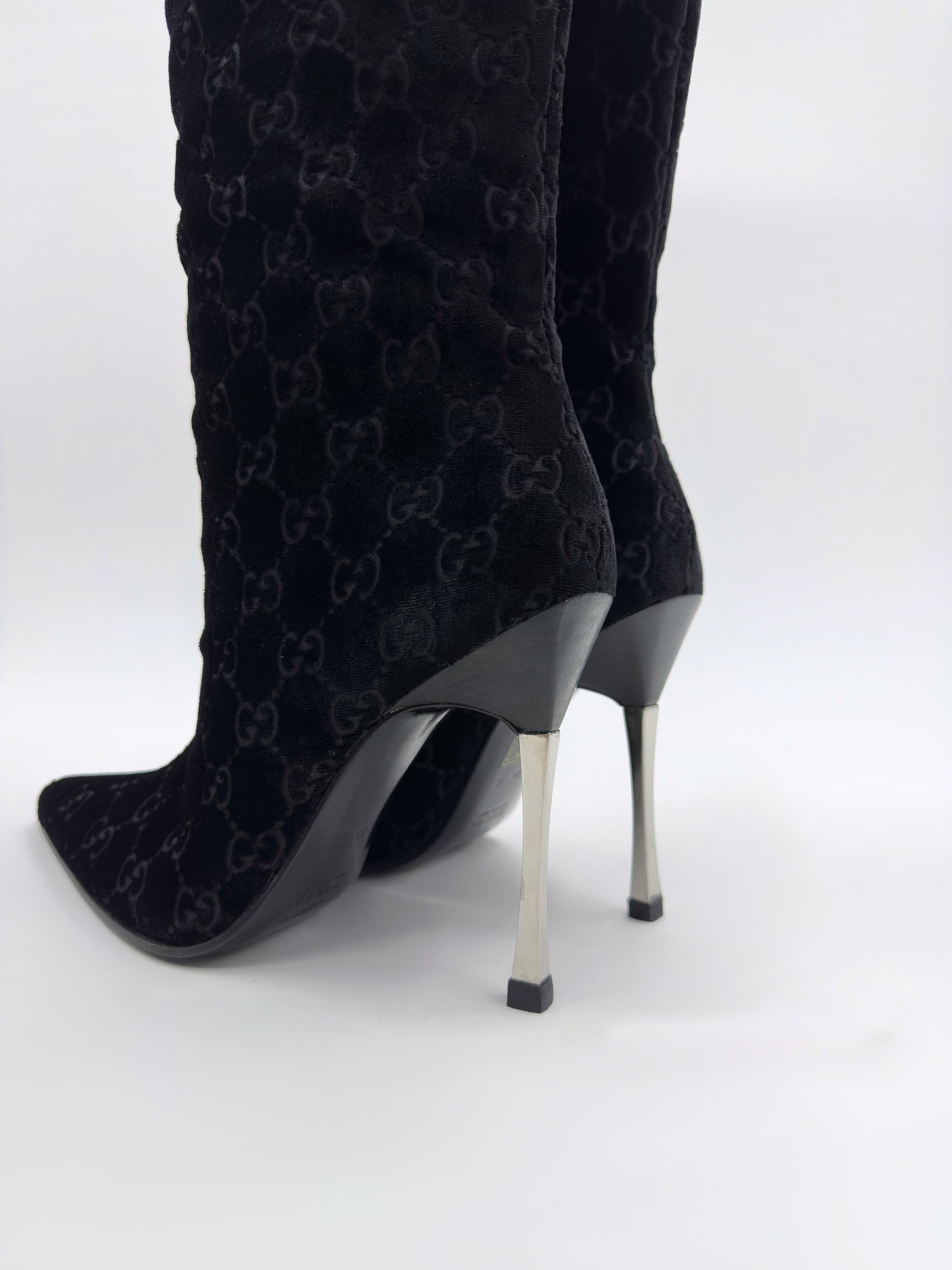 Gucci Fall 1997 Tom Ford Dark Navy Guccisima Monogram Velvet Metal Heel Tall Boots 36