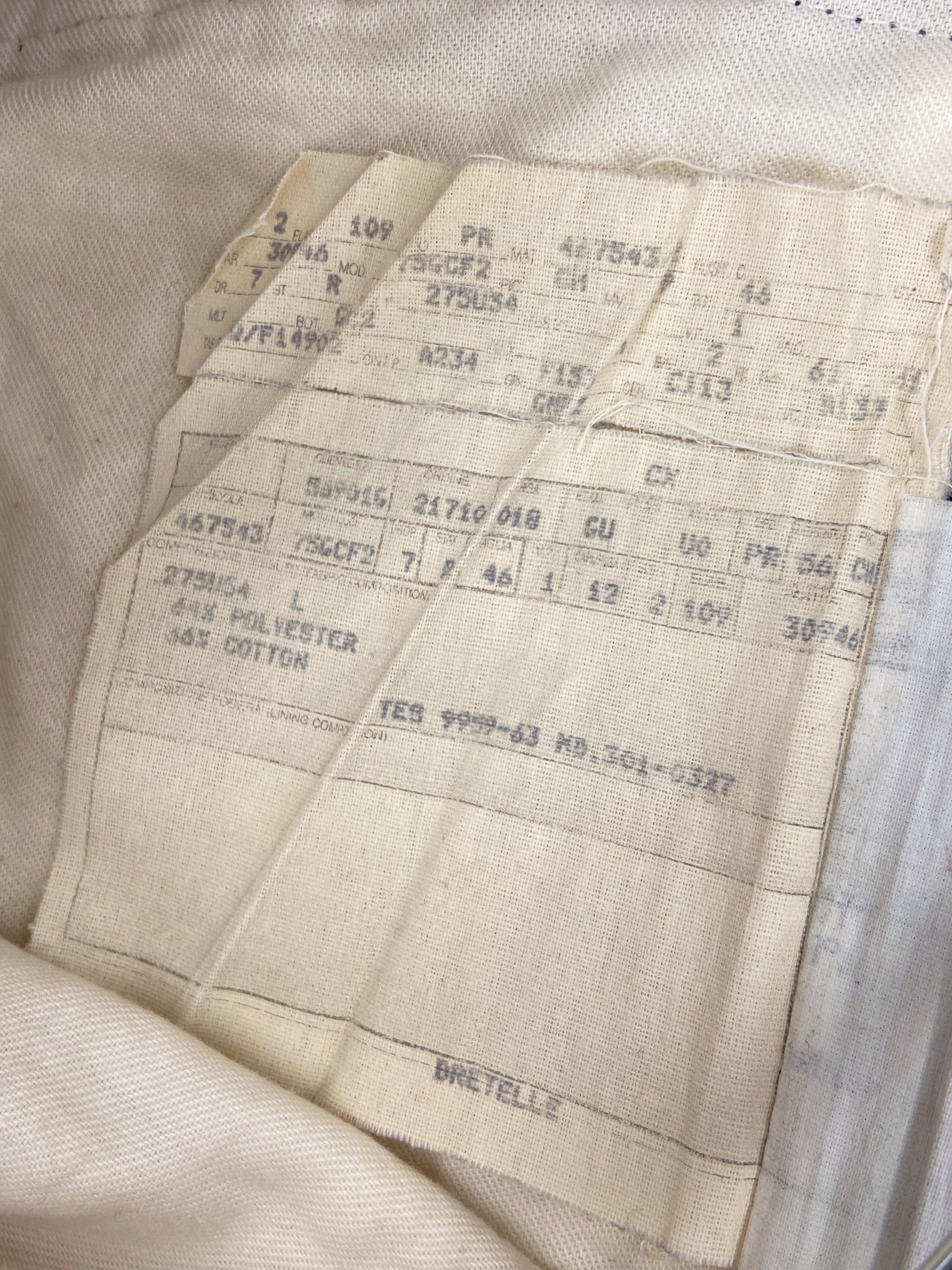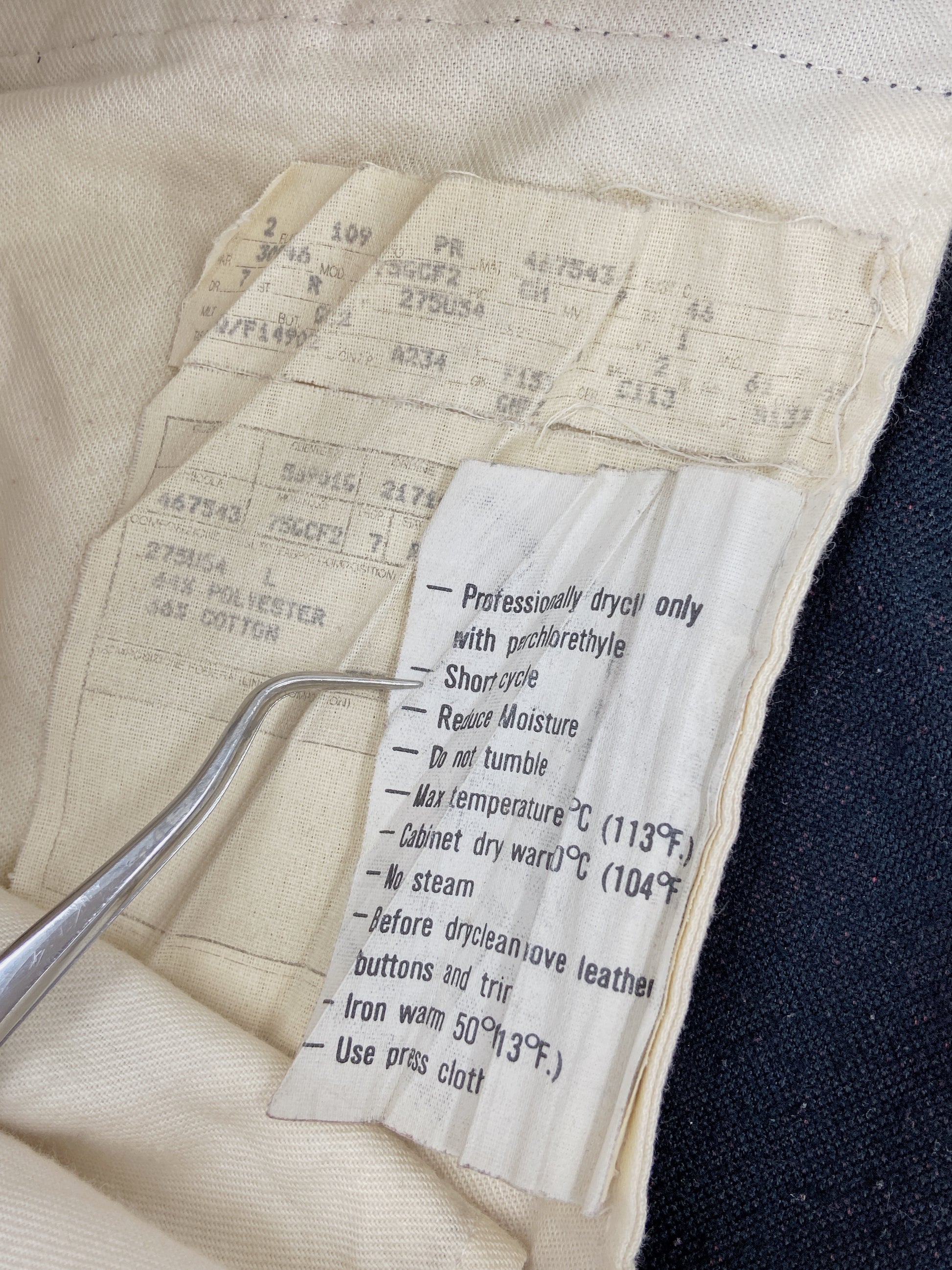 Defects: Some of the velvet fell out on both front leg cuff and discolouration on the back, minor yellowing of the lining and minor lint