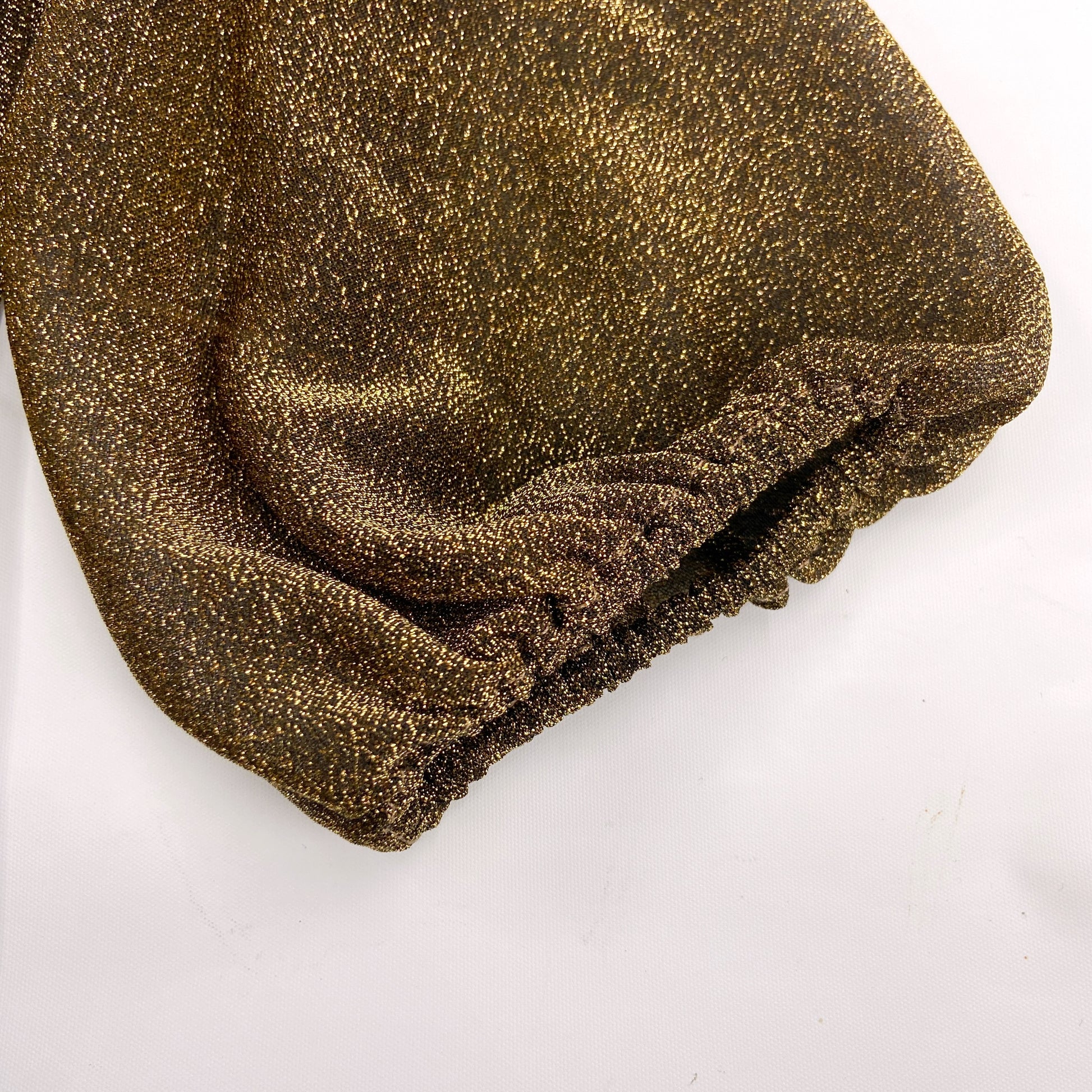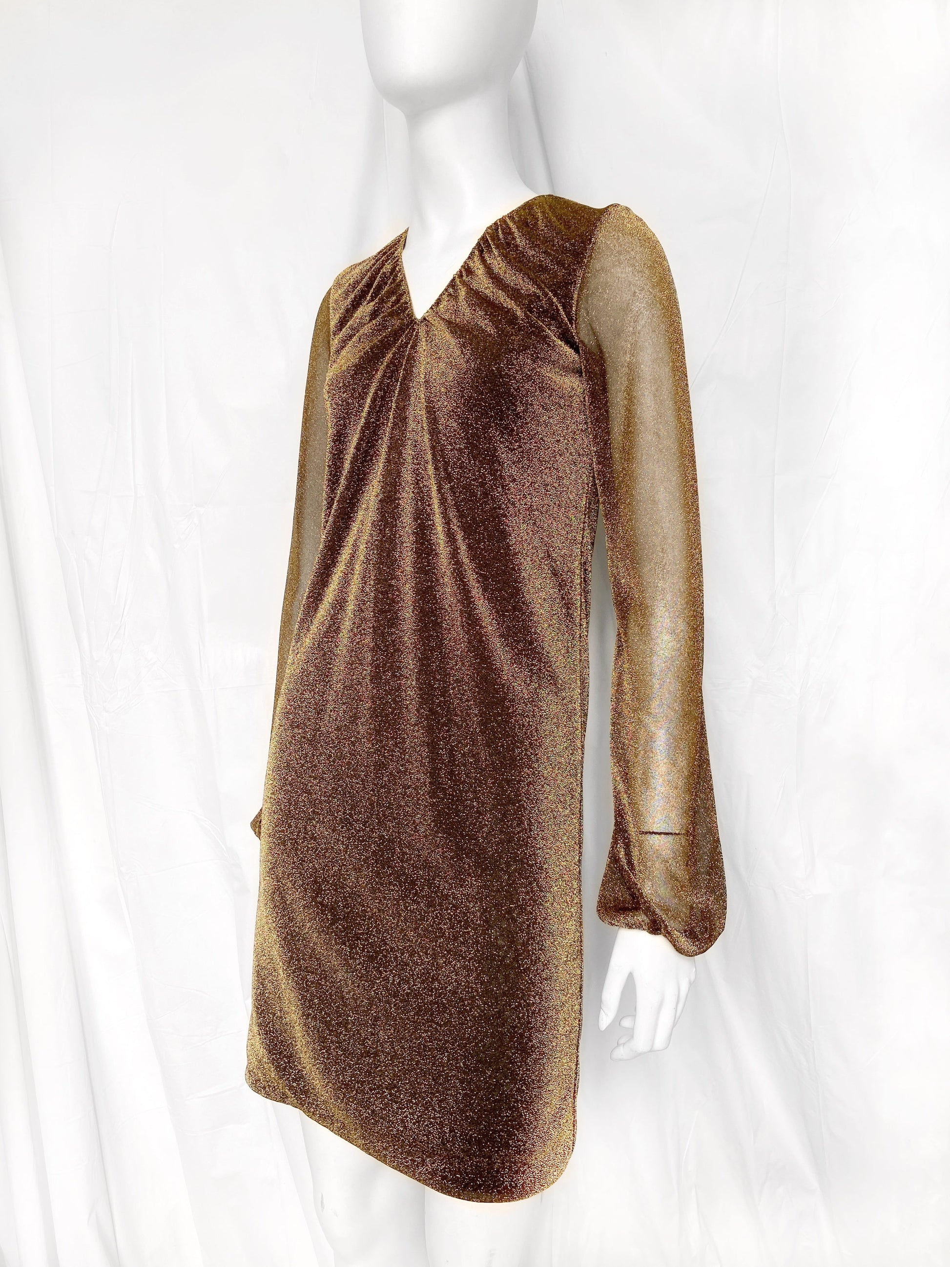 The dress is made from double-layered gold glittery mesh, while the sleeves are singled-layered and is slightly sheer