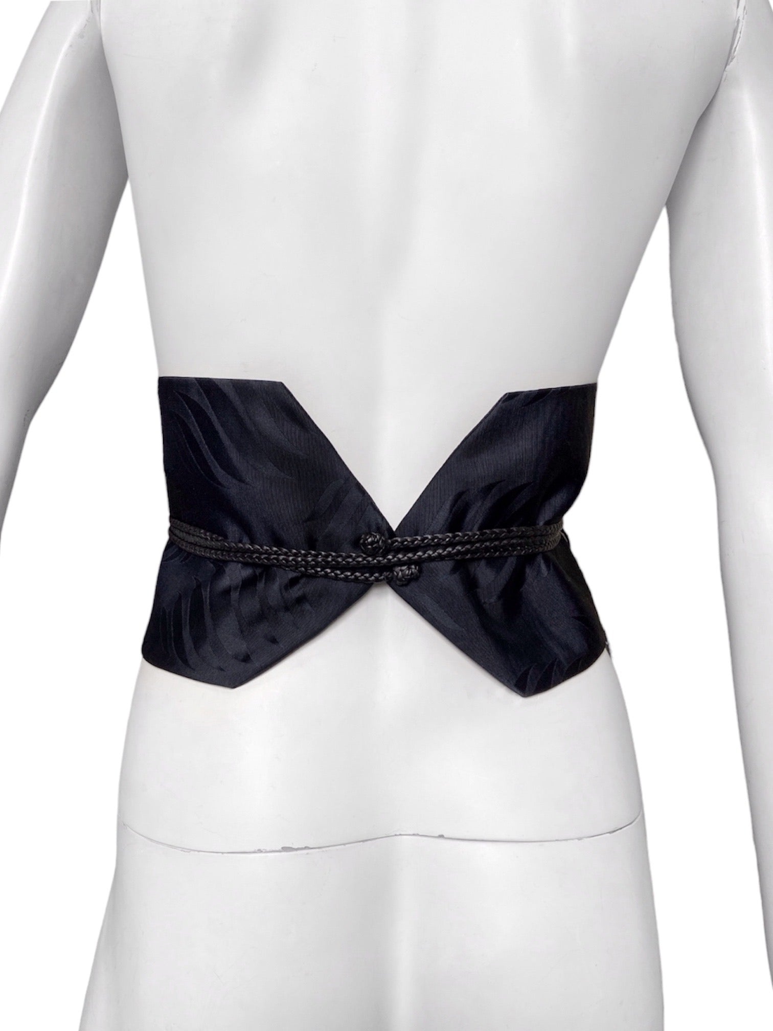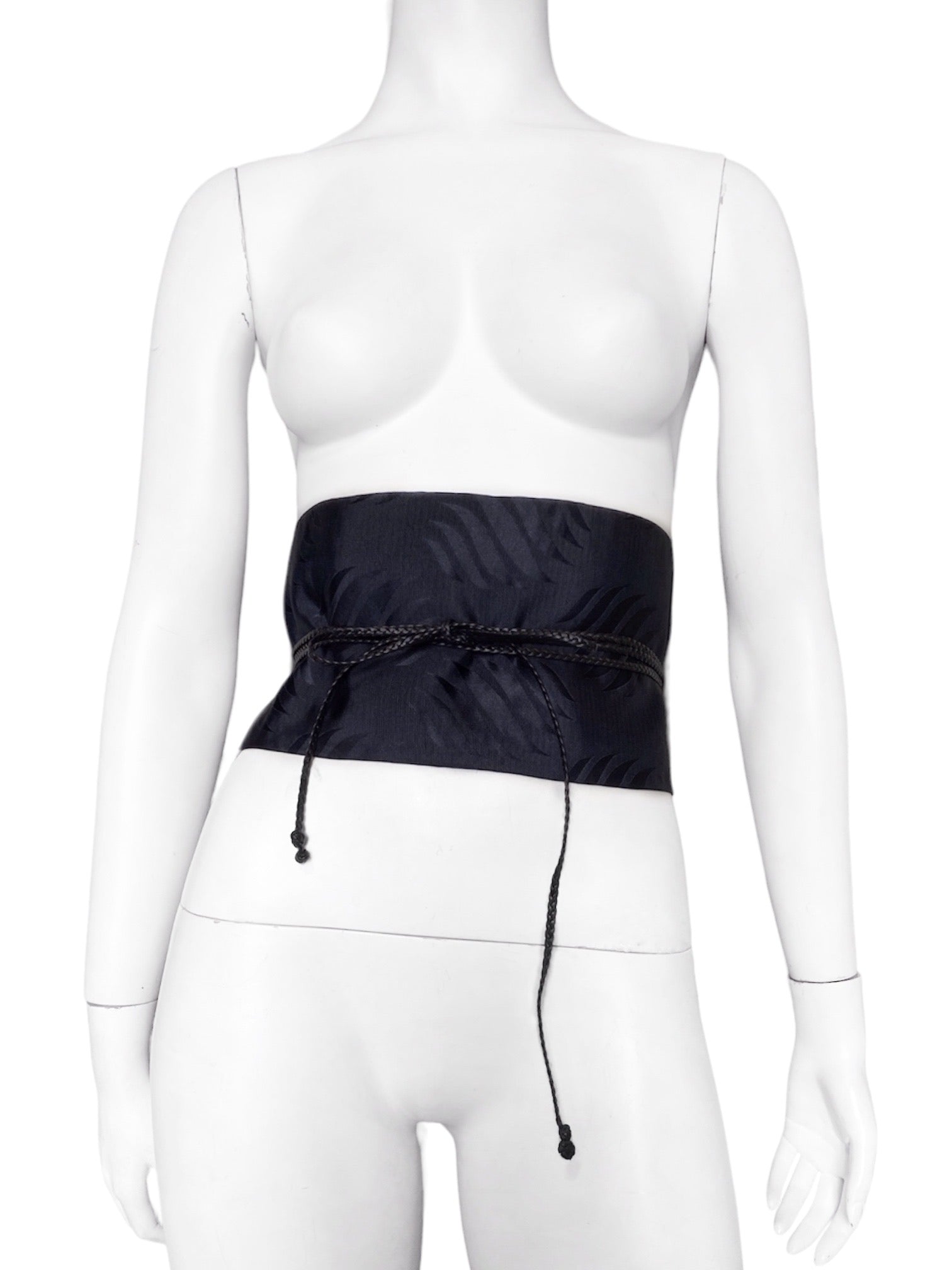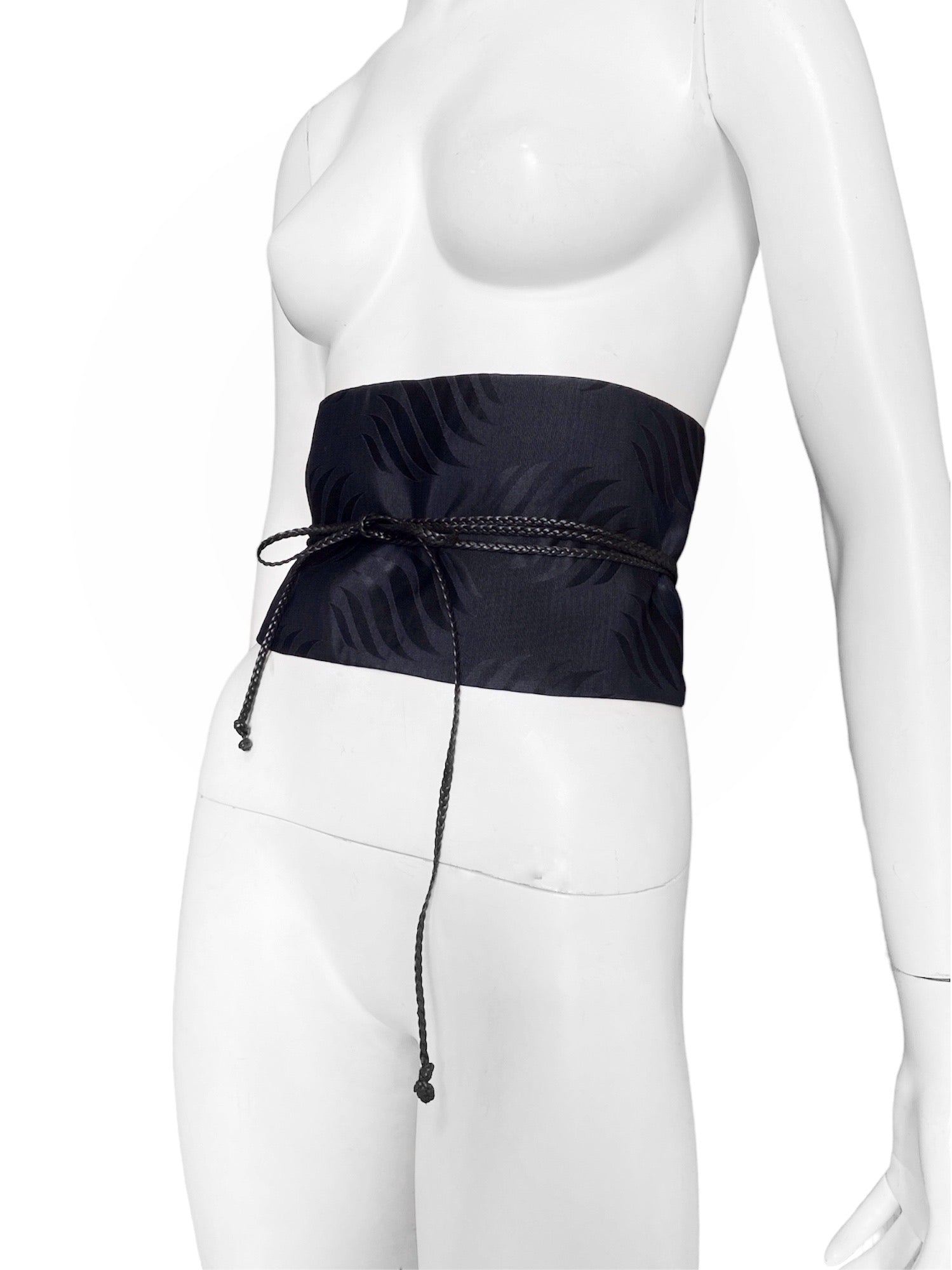 A traditional Japanese inspired Obi belt design with jacquard bamboo pattern with long braided leather straps attached and design to wrapped around the body and can be tied off and styled in several ways