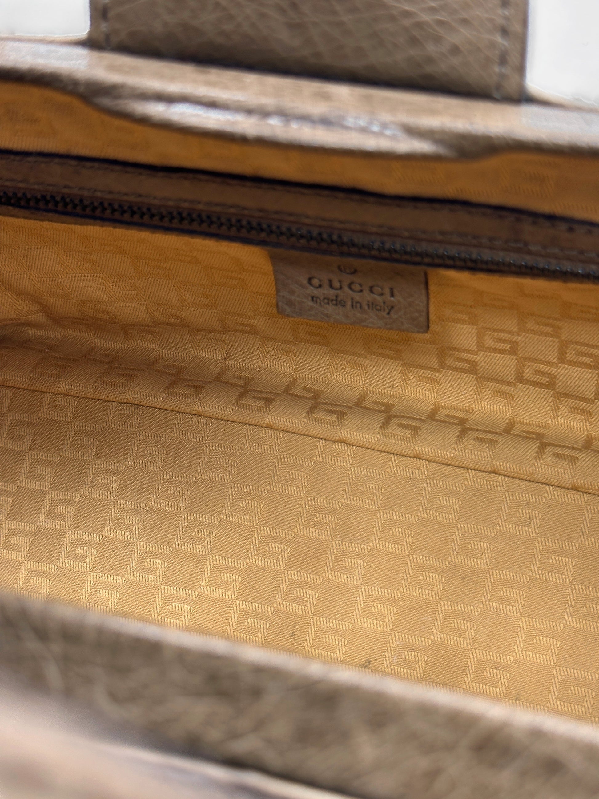 Fully lined with gold Gucci monogrammed fabric with one zip pocket against the back