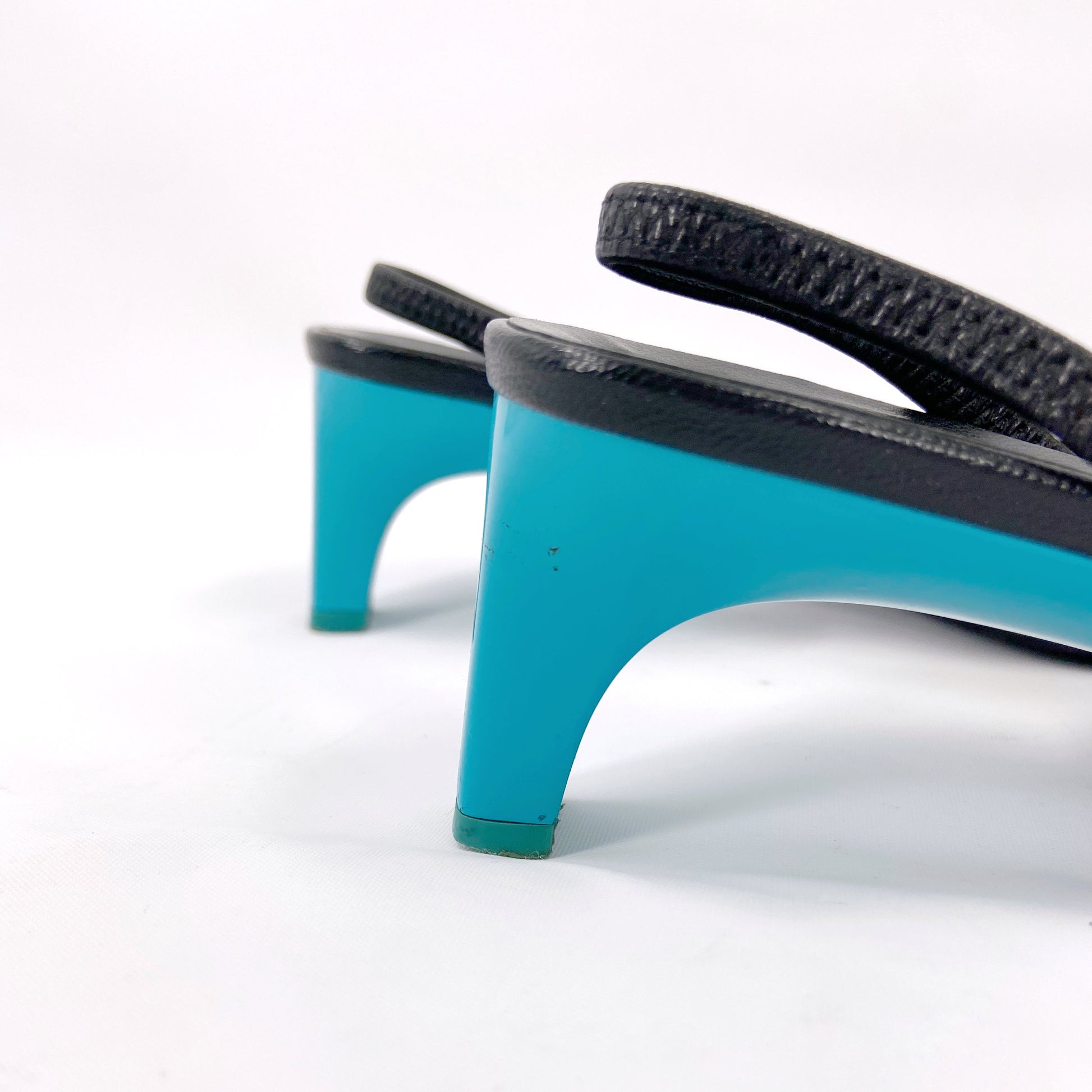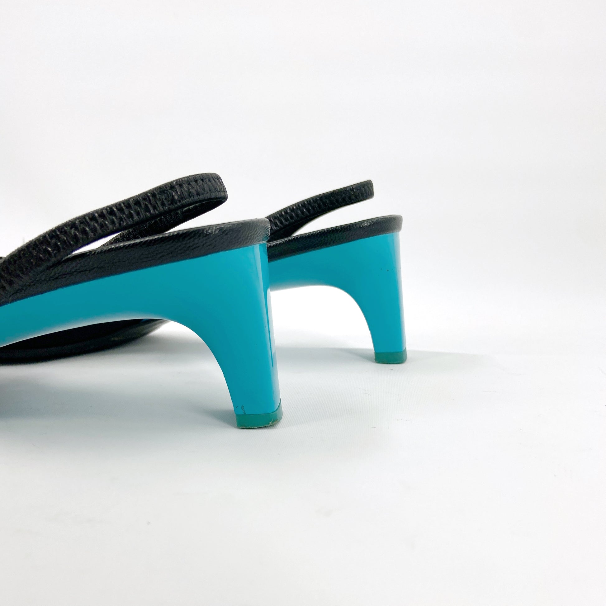 Delicate pair of slingsbacks with feather appliqué over black satin, with blue heels with turquoise small block heel & leather insole stamped 'Gucci'