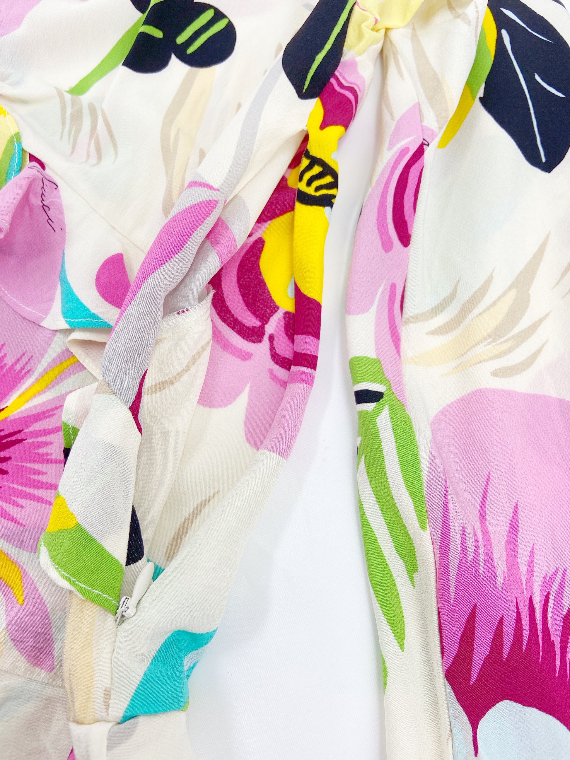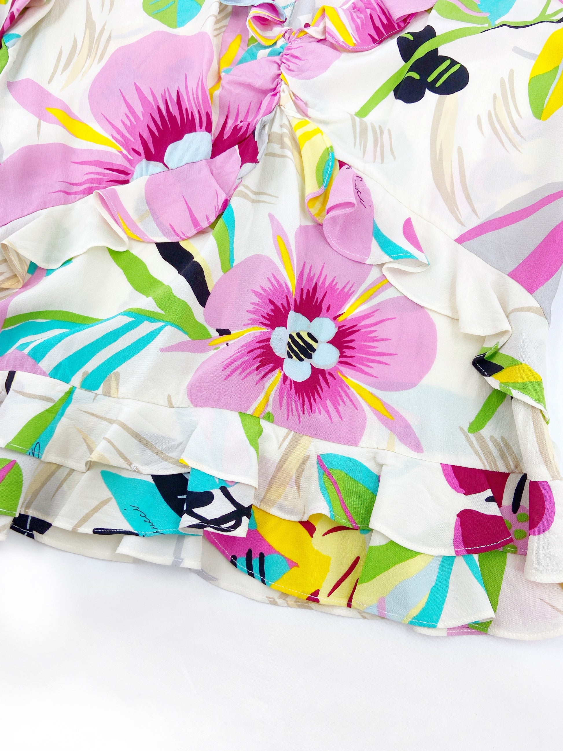 Iconic ruffled blouse with the seasonal floral print in a ivory colourway