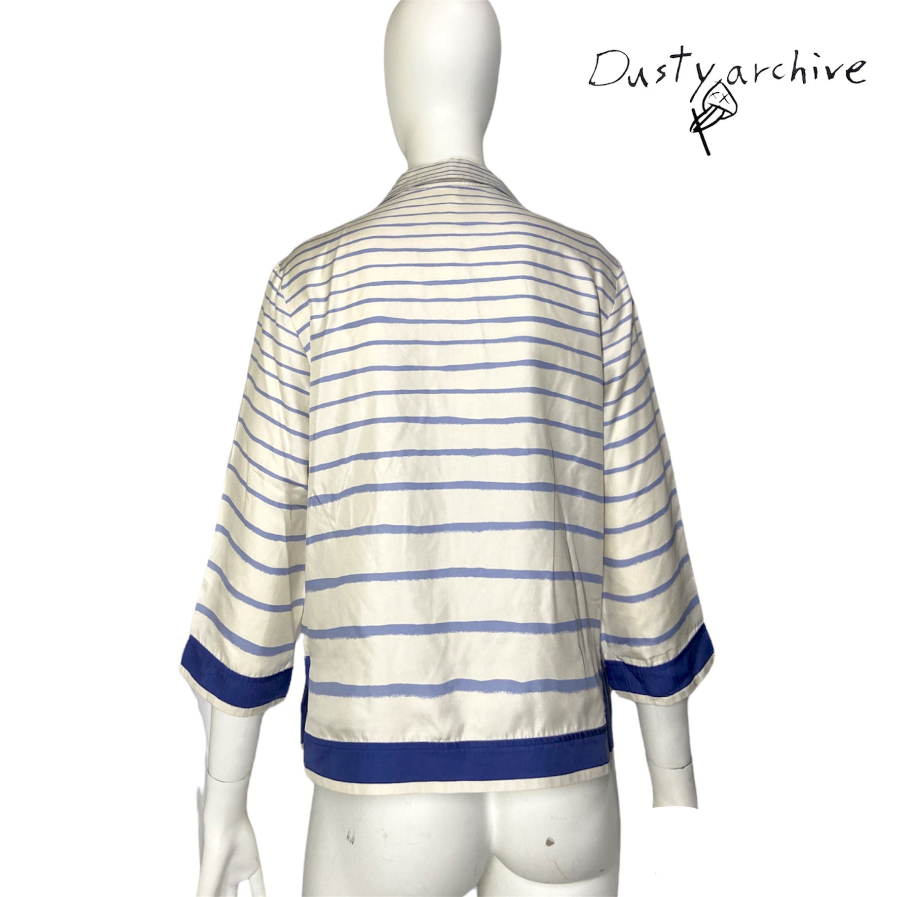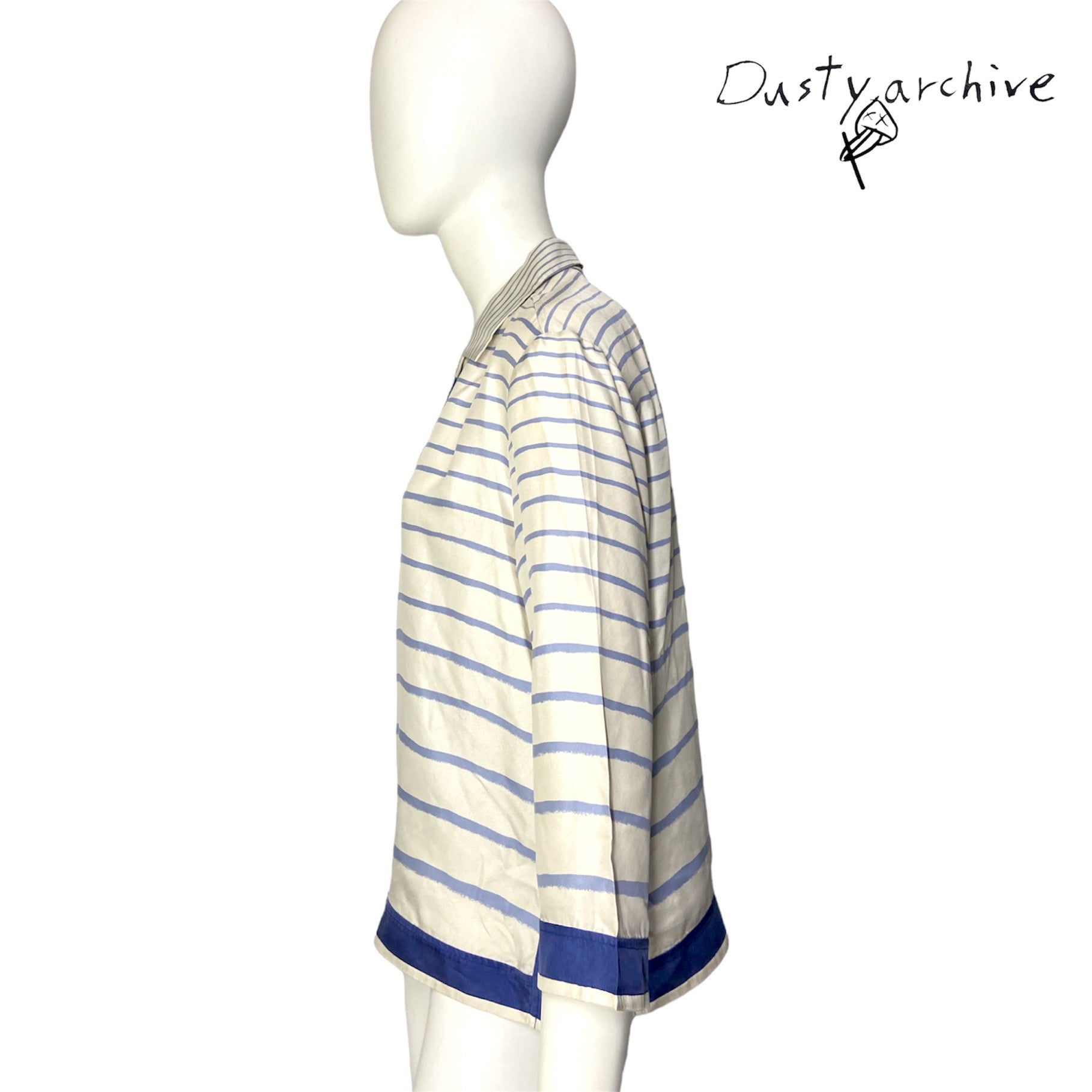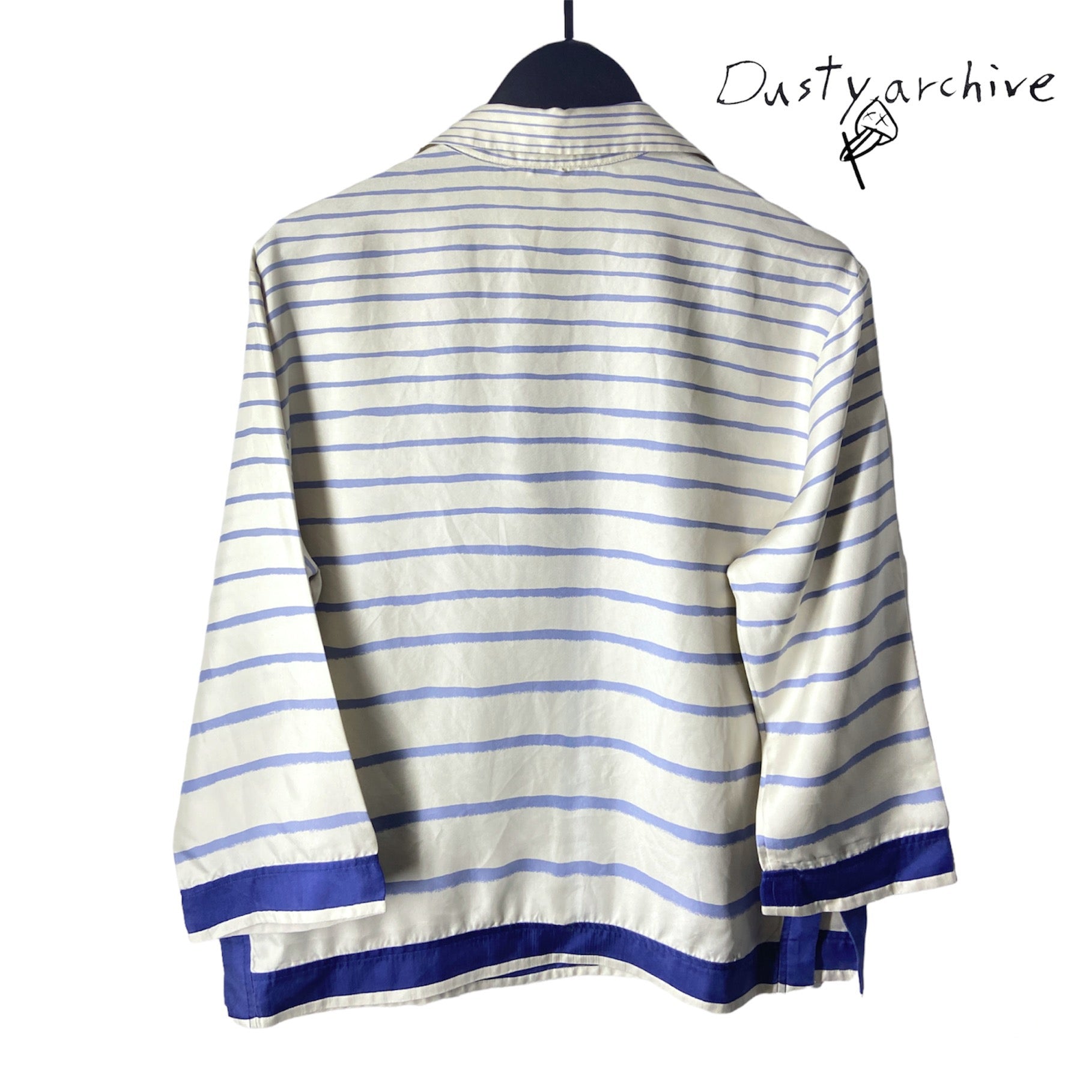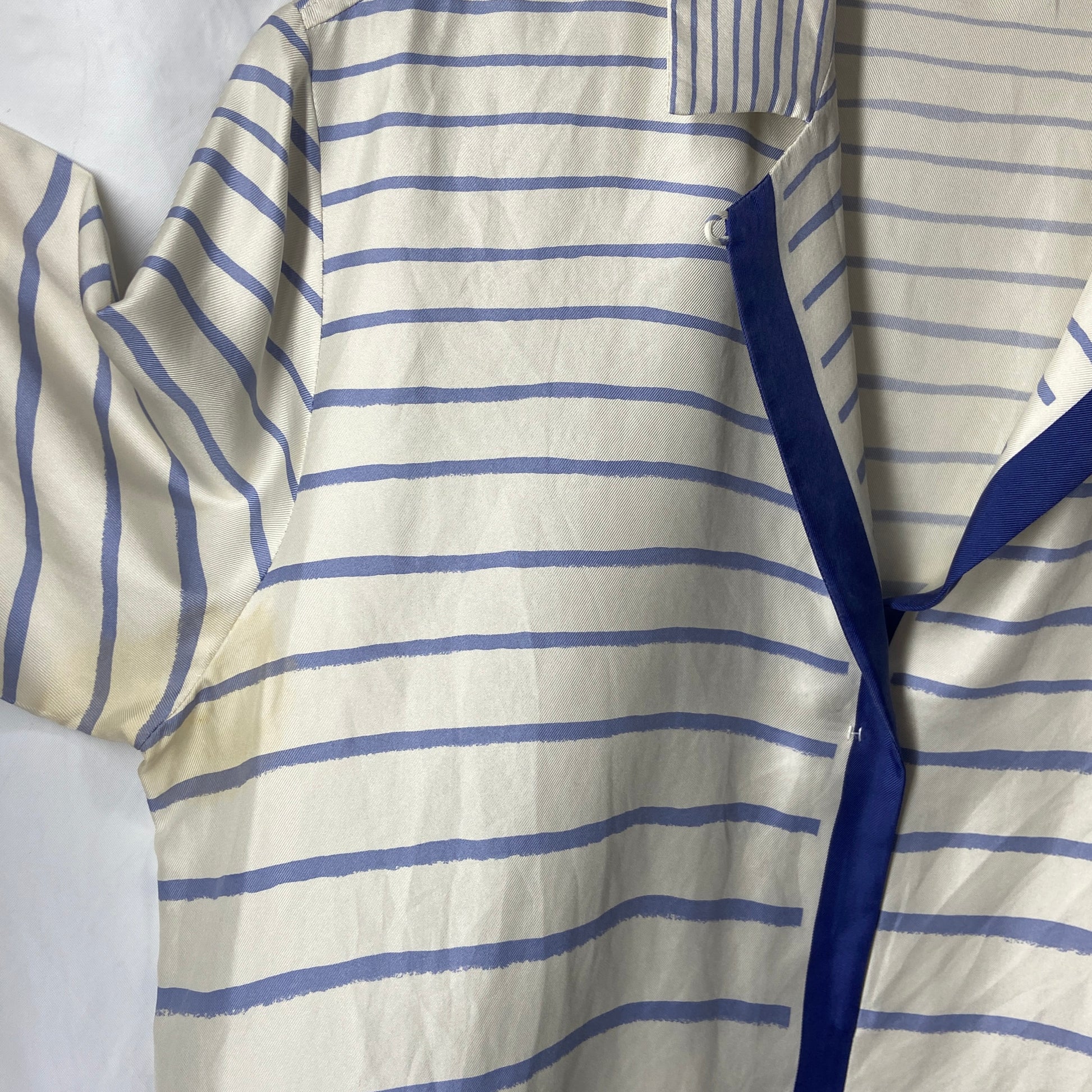 A beautiful silk sailor print blouse by margiela at his reign at the maison of hermes. Very soft breathable silk with an almost handpainted blue stripe prints. The blouse is originally cream coloured. Item is in good condition, no rips or tears. Except for a tiny yellowing under the right armpit, which is unnoticeable when worn