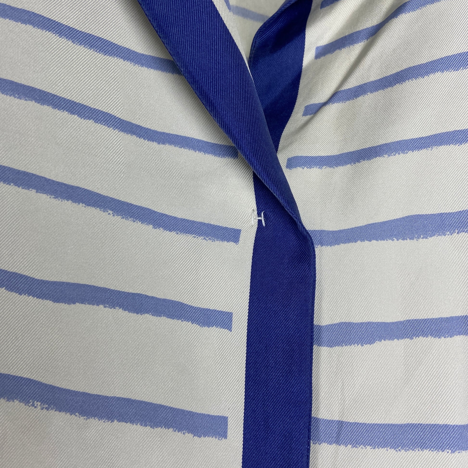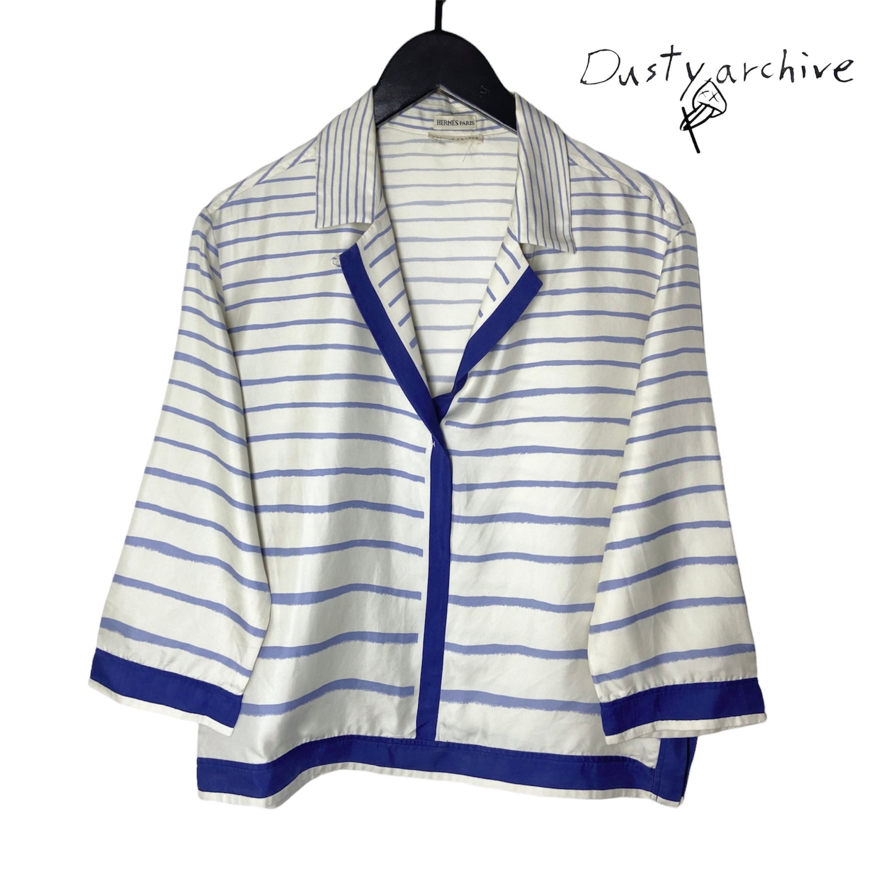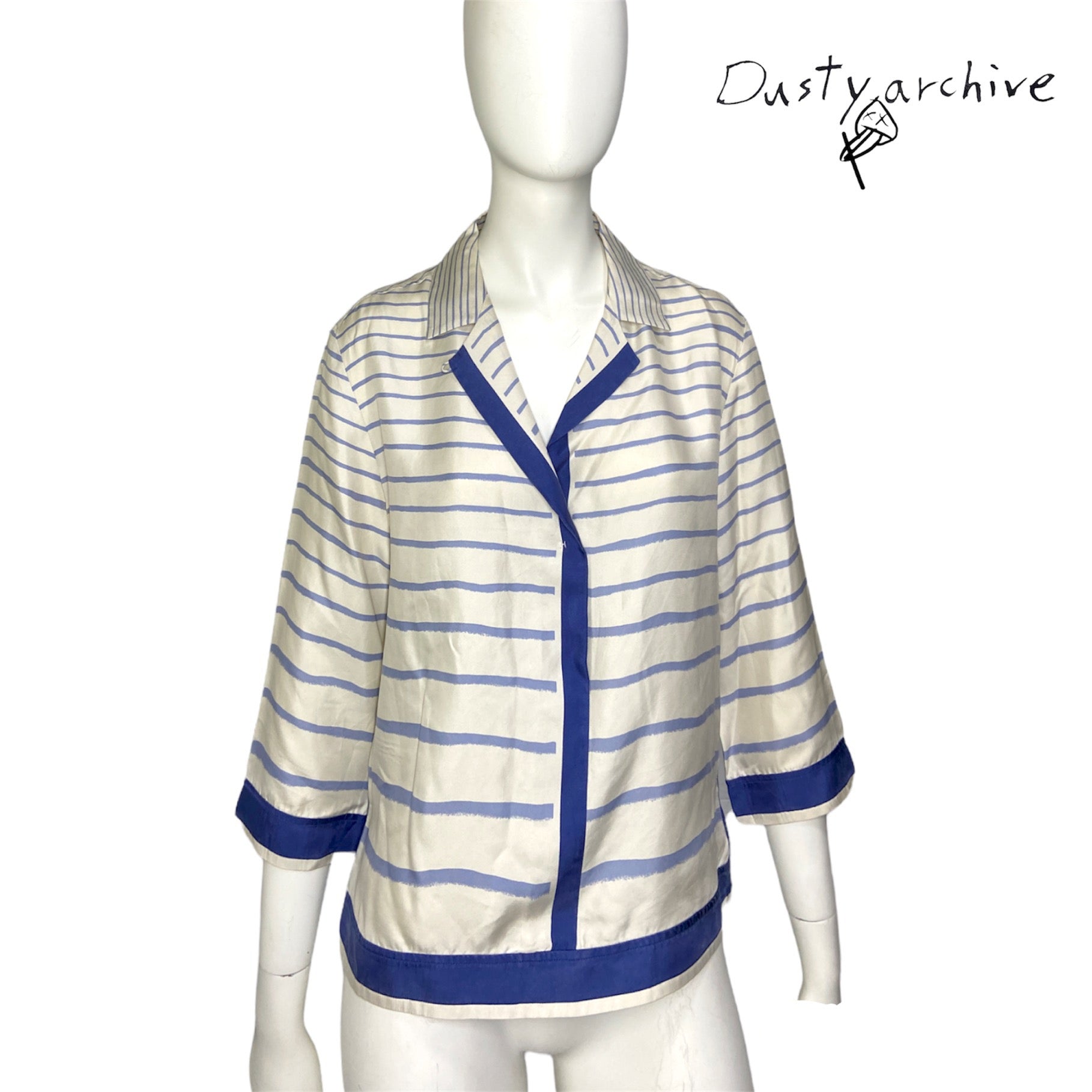 A beautiful silk sailor print blouse by margiela at his reign at the maison of hermes. Very soft breathable silk with an almost handpainted blue stripe prints. The blouse is originally cream coloured. Item is in good condition, no rips or tears. Except for a tiny yellowing under the right armpit, which is unnoticeable when worn