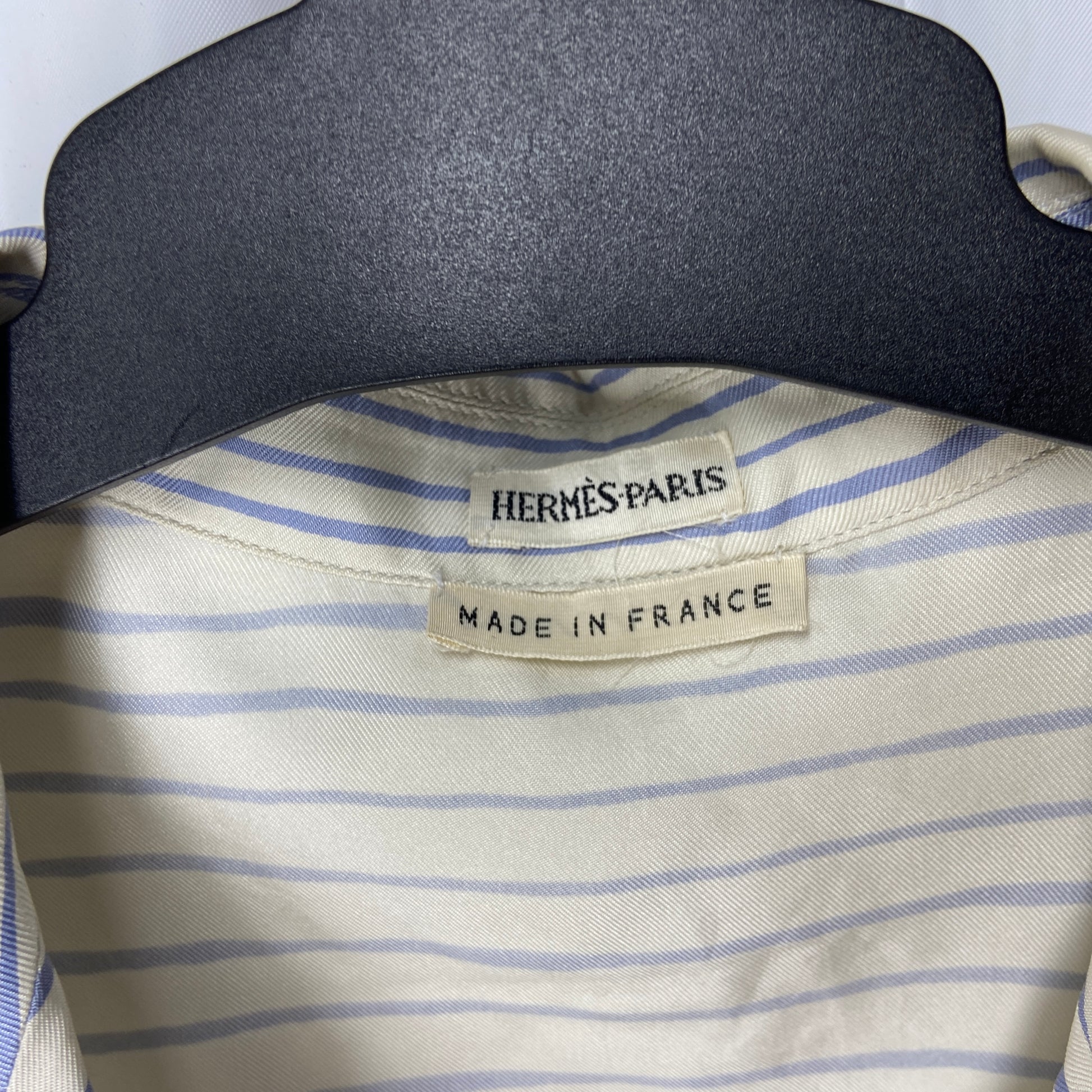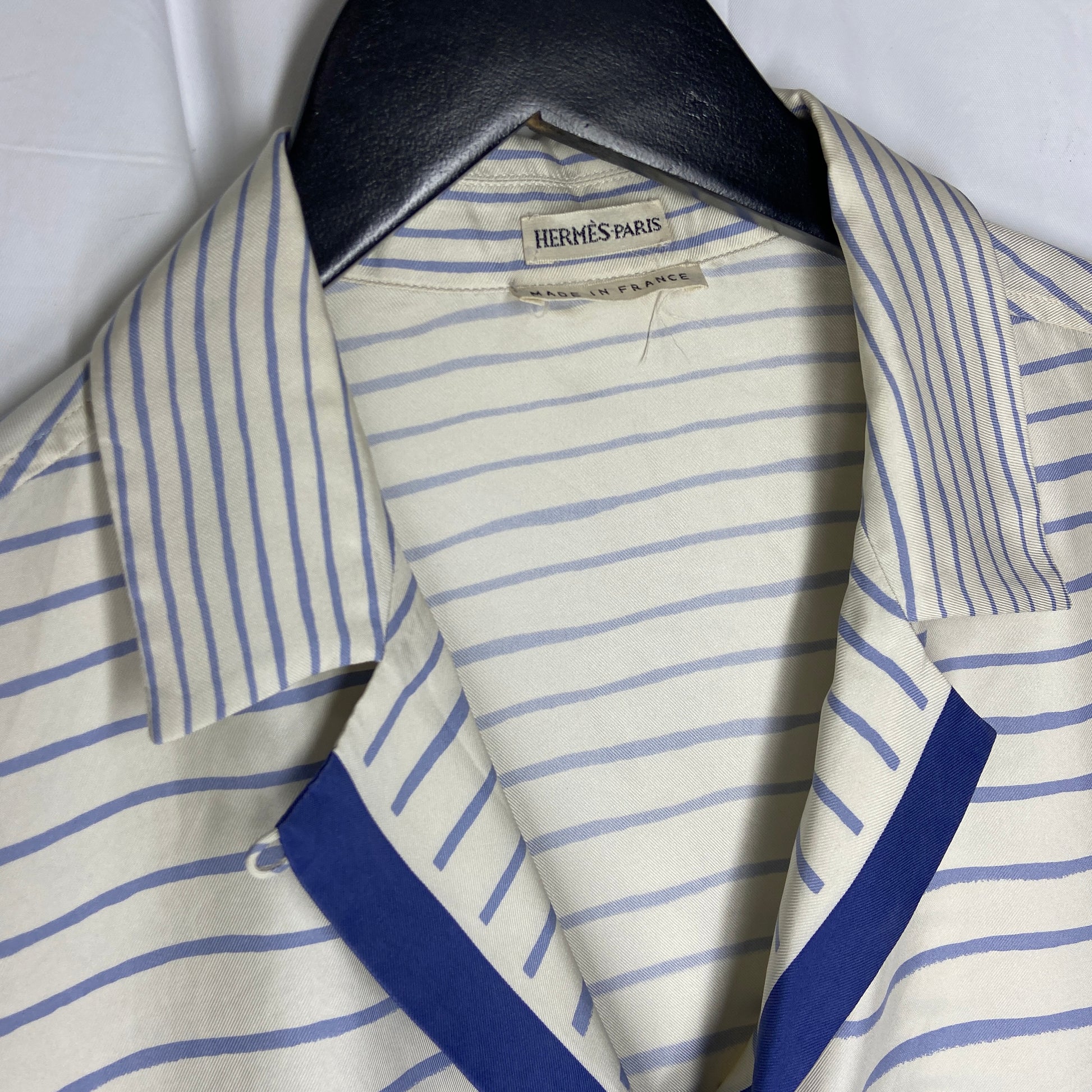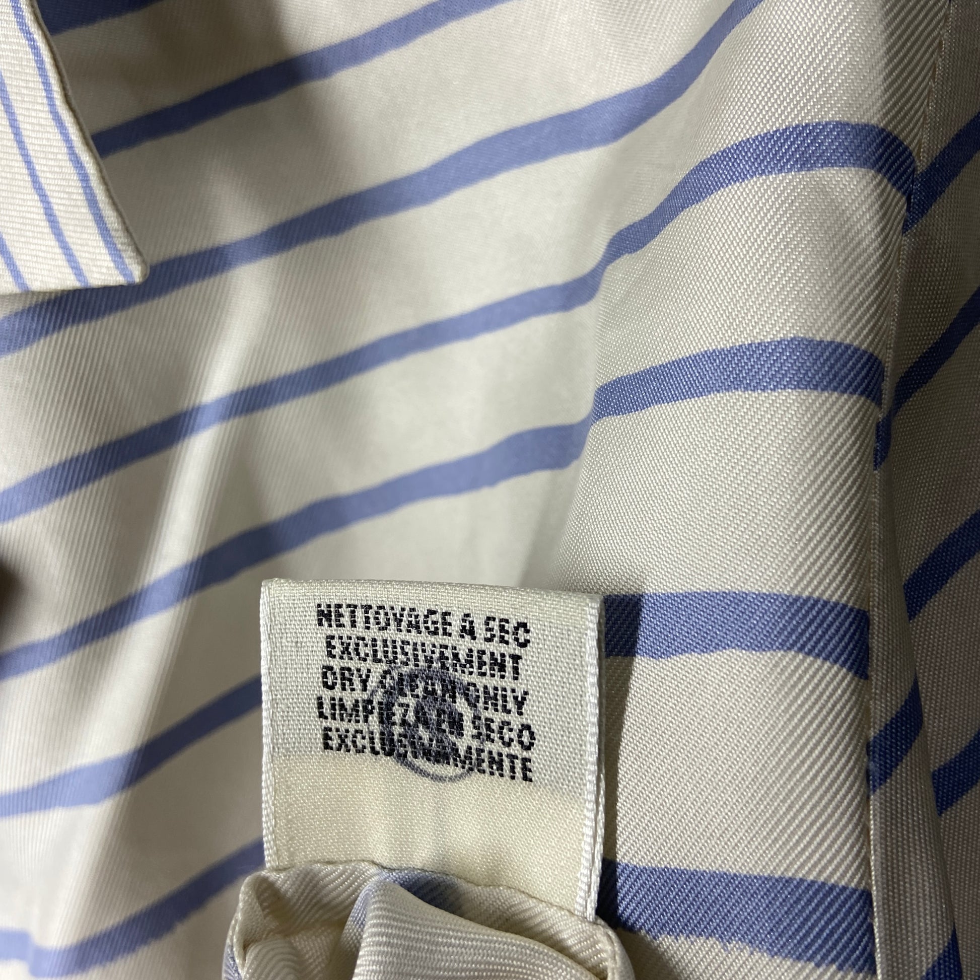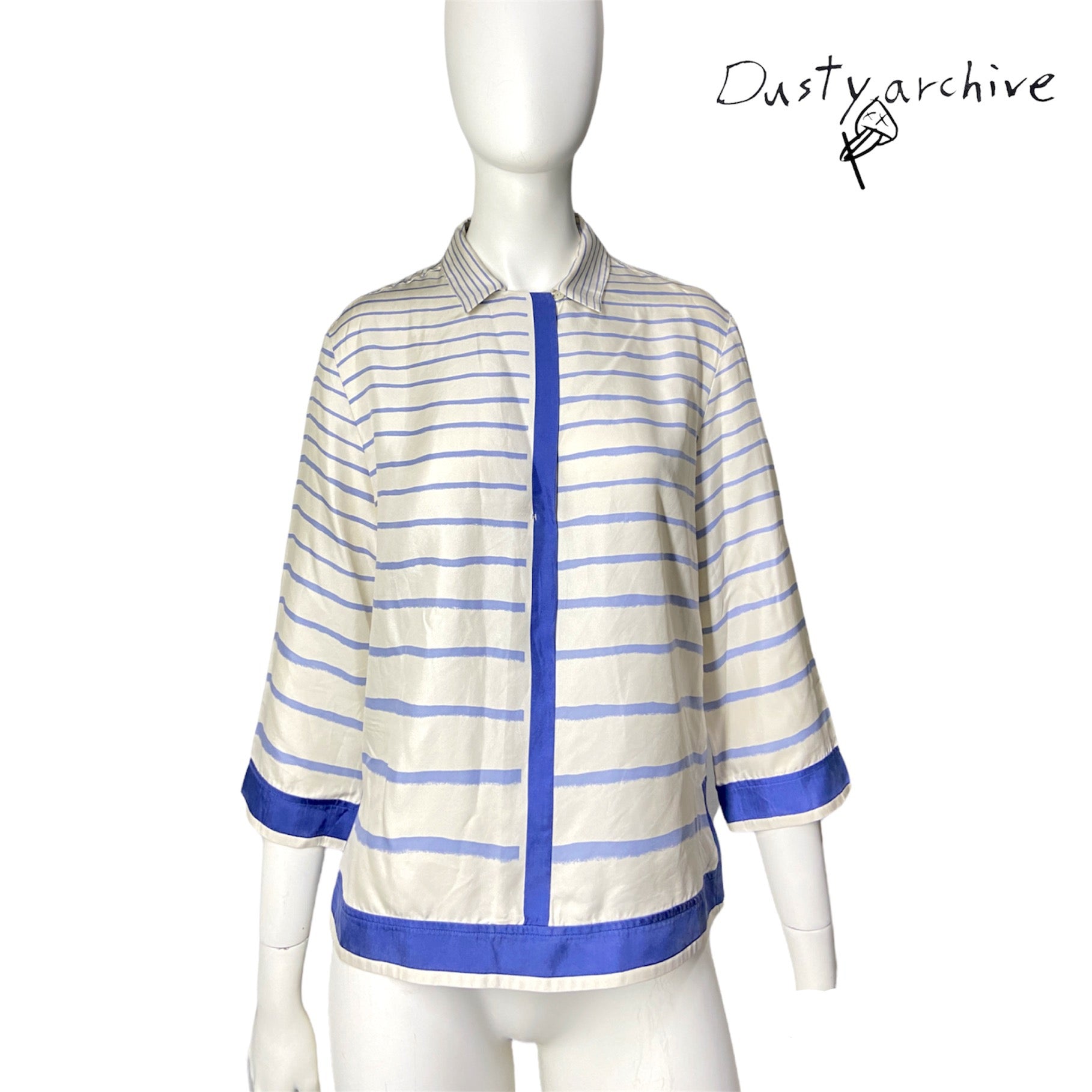 A beautiful silk sailor print blouse by margiela at his reign at the maison of hermes. Very soft breathable silk with an almost handpainted blue stripe prints. The blouse is originally cream coloured. Item is in good condition, no rips or tears. Except for a tiny yellowing under the right armpit, which is unnoticeable when worn