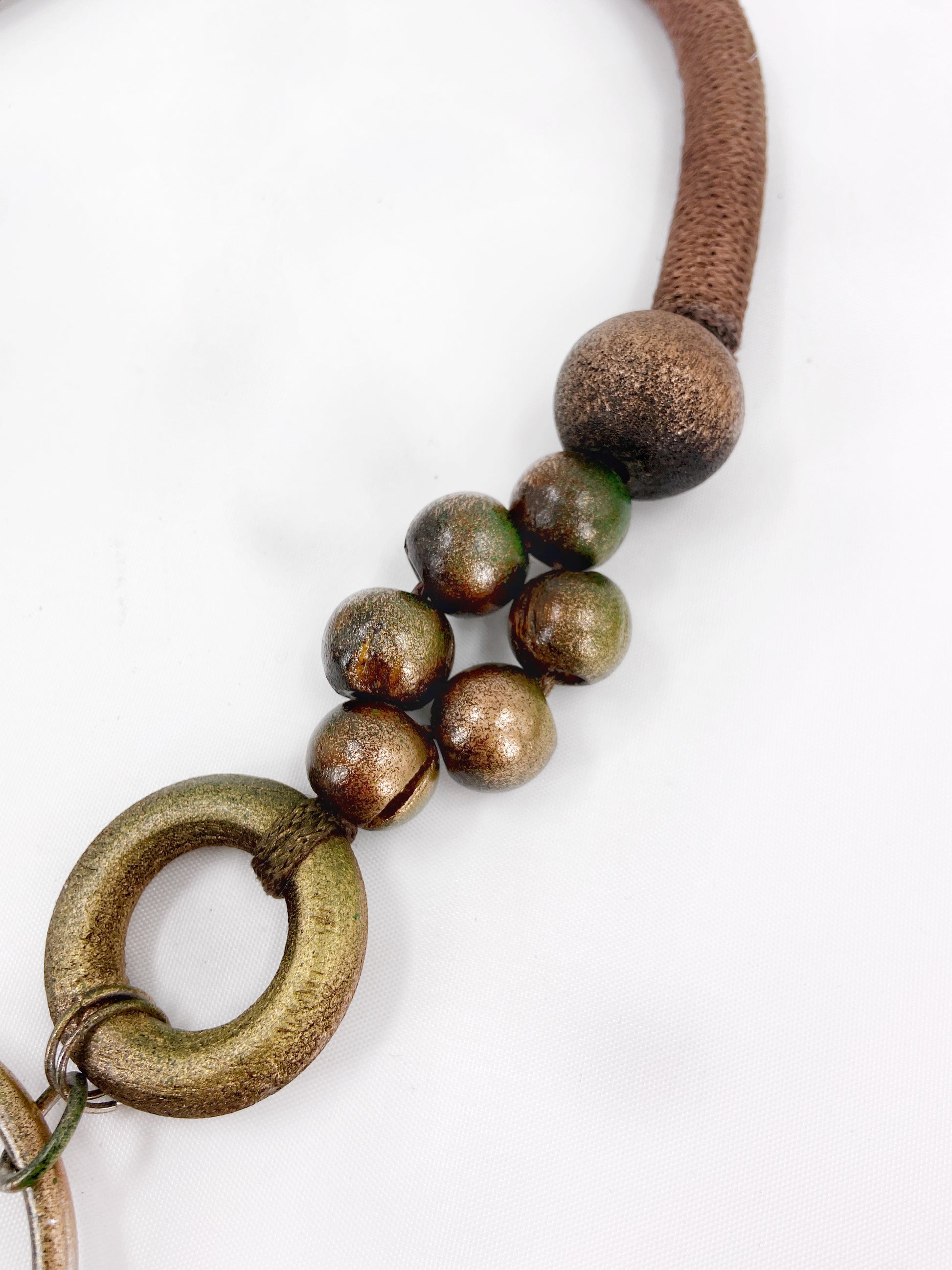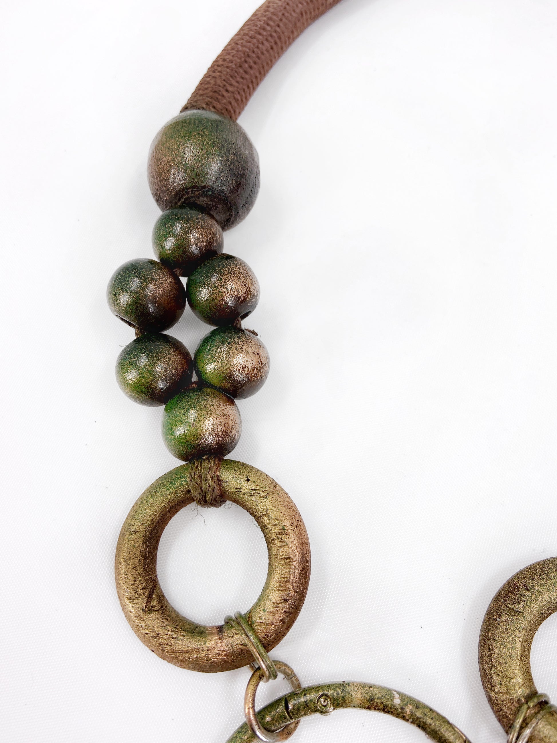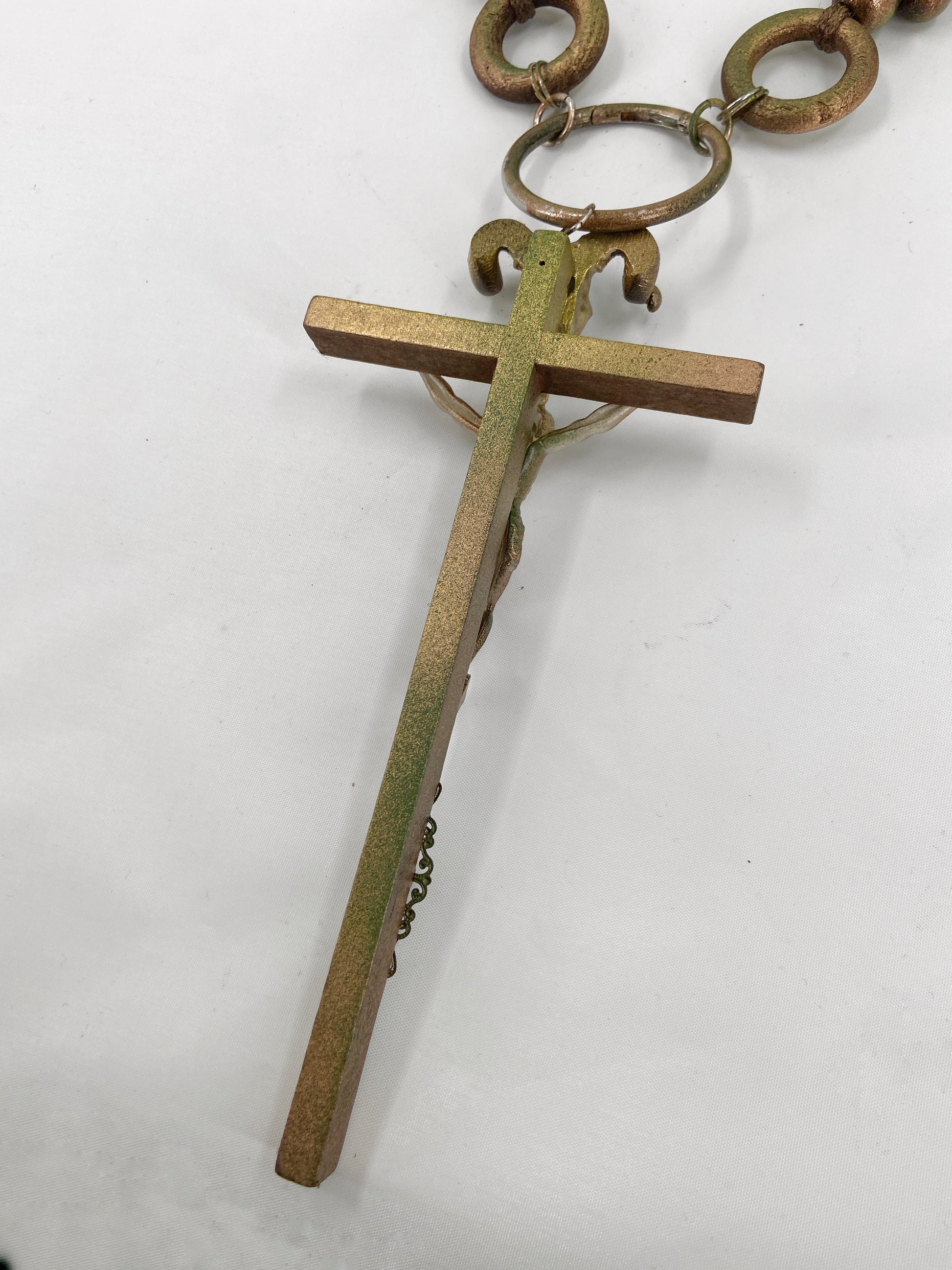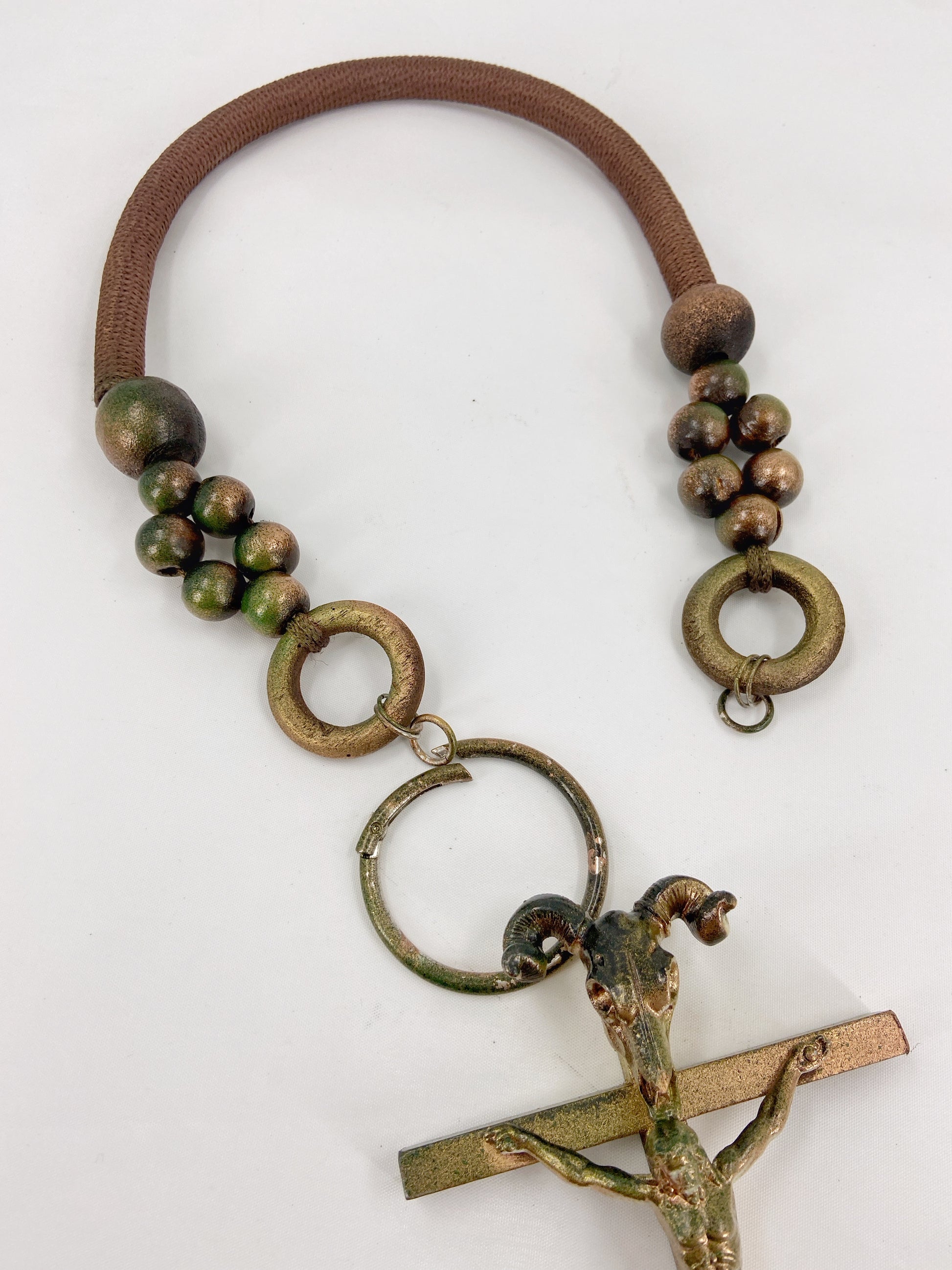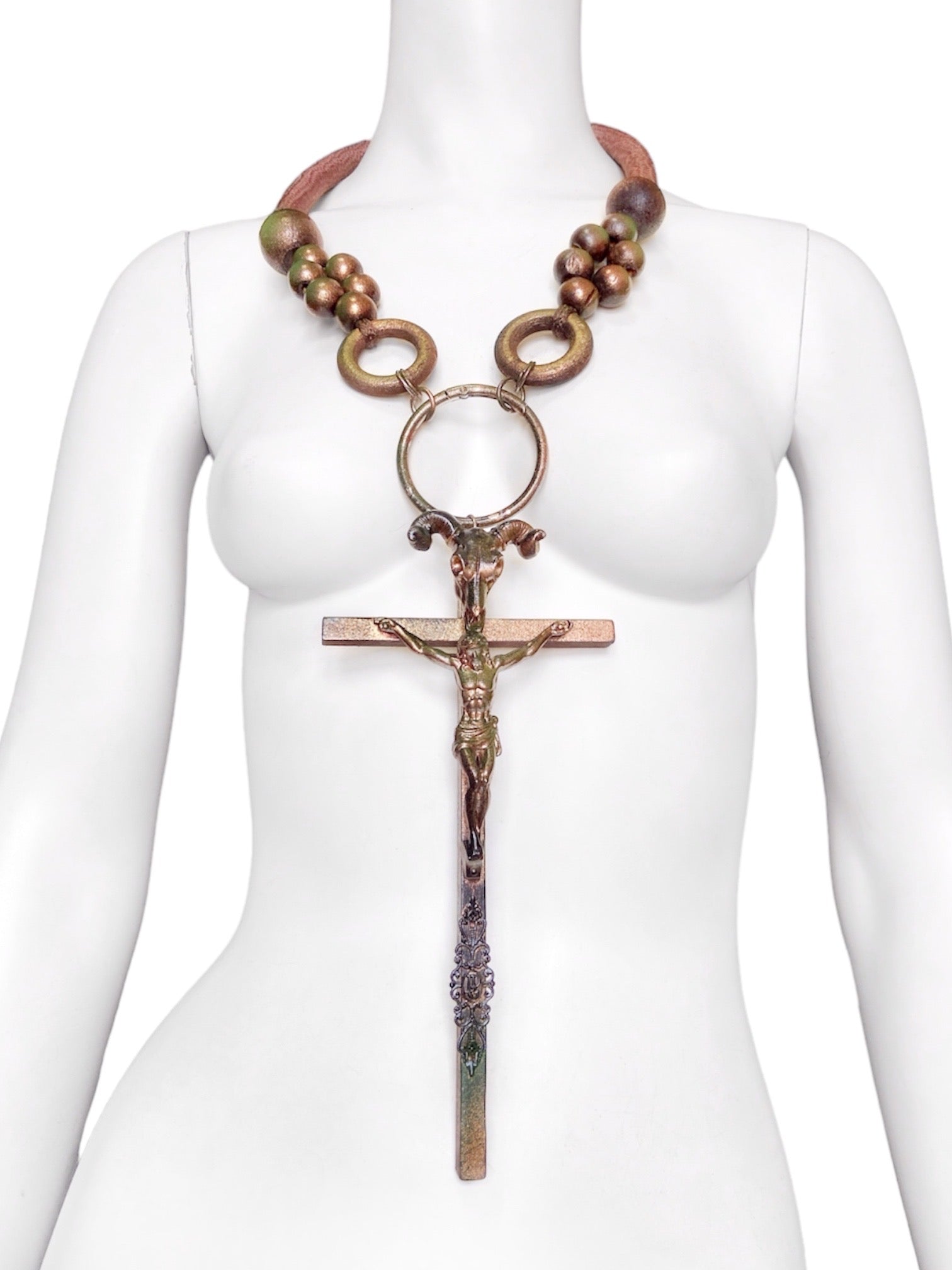 Composed of a wooden crucifix pendant with a Jesus and goat skull sculpture with a ring closure that can be opened, connected giant beads and rings and a semicircle neckpiece with a woven surface