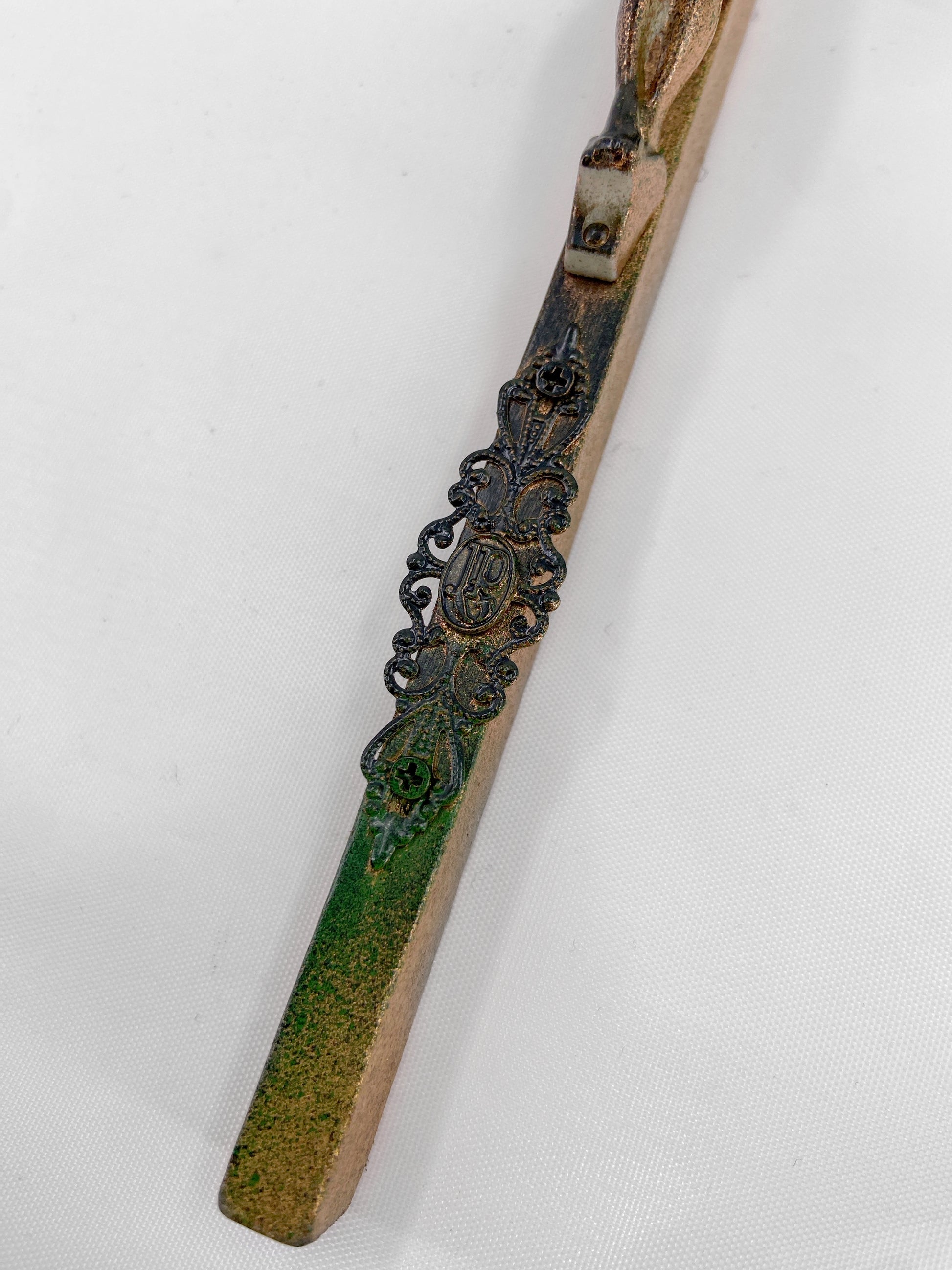 Notably the necklace is laid flat and airbrushed, giving the piece a antique look with uneven finish with some parts of the necklace still black