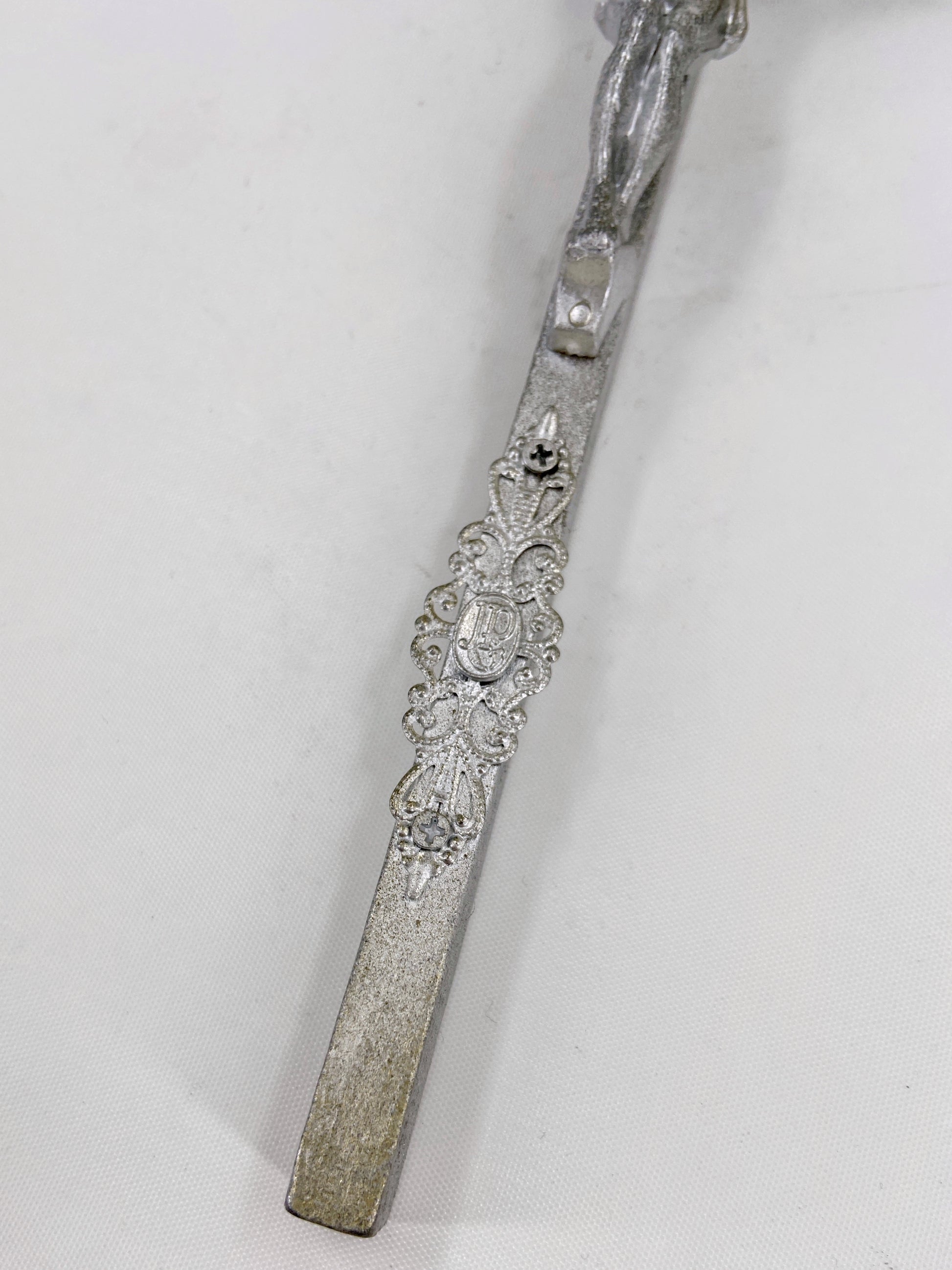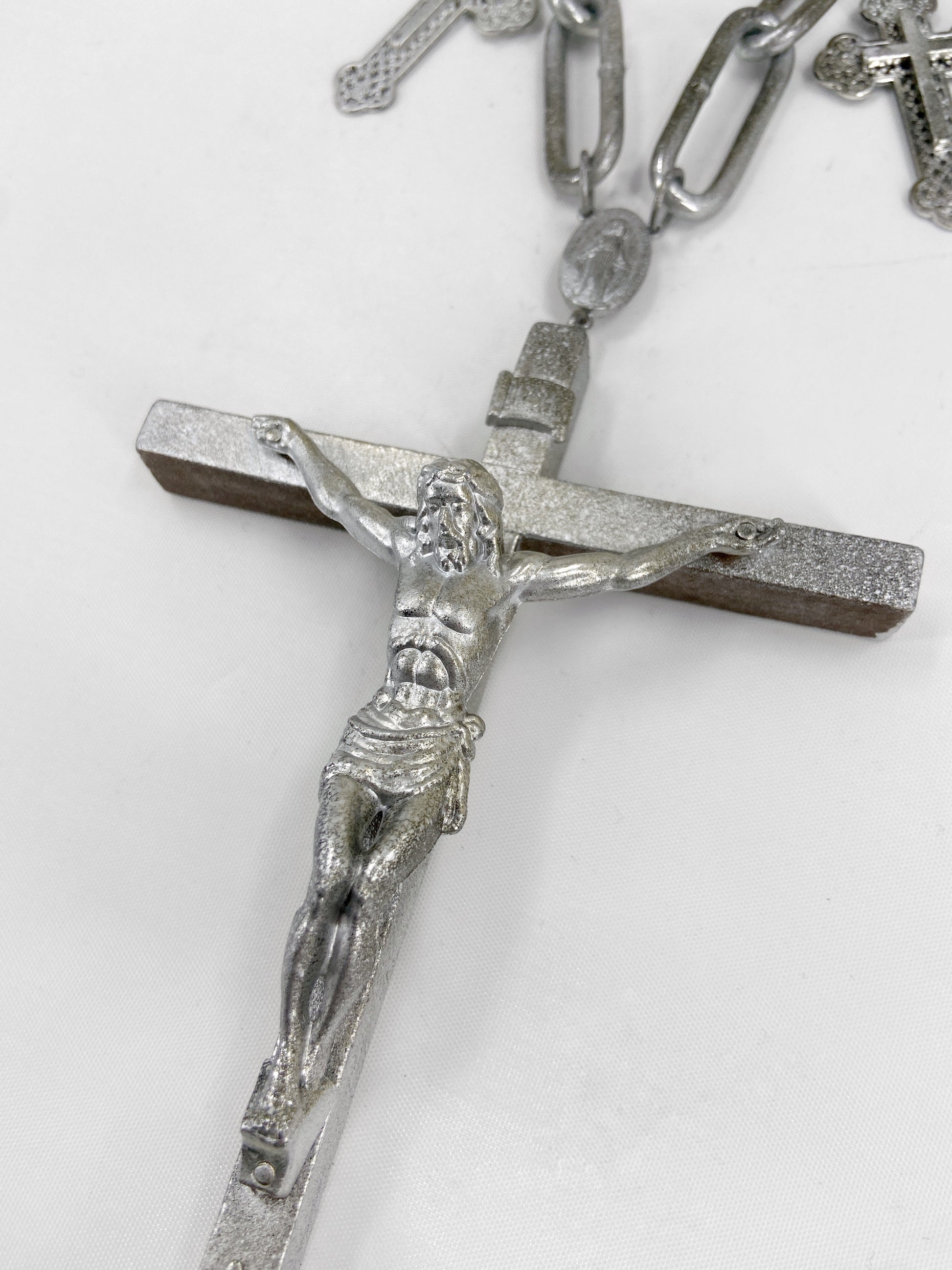 Composed of a giant crucifix with hand carved Jesus sculpture and a scroll carved with “INRI”, five sets totalling 10 crucifix crosses that are symmetrically matched on each side, and a heavy-weight metal chain