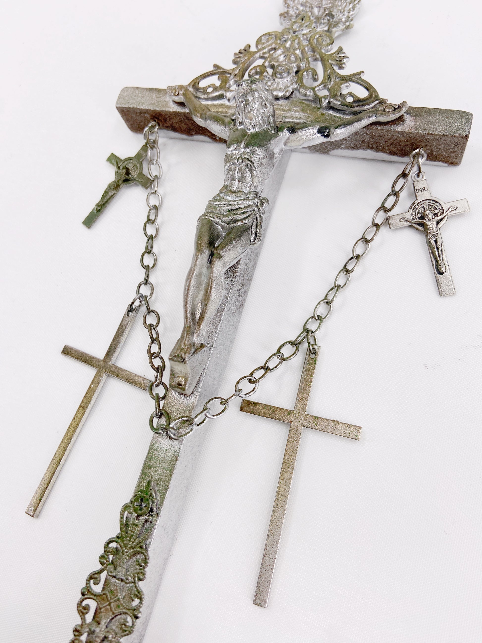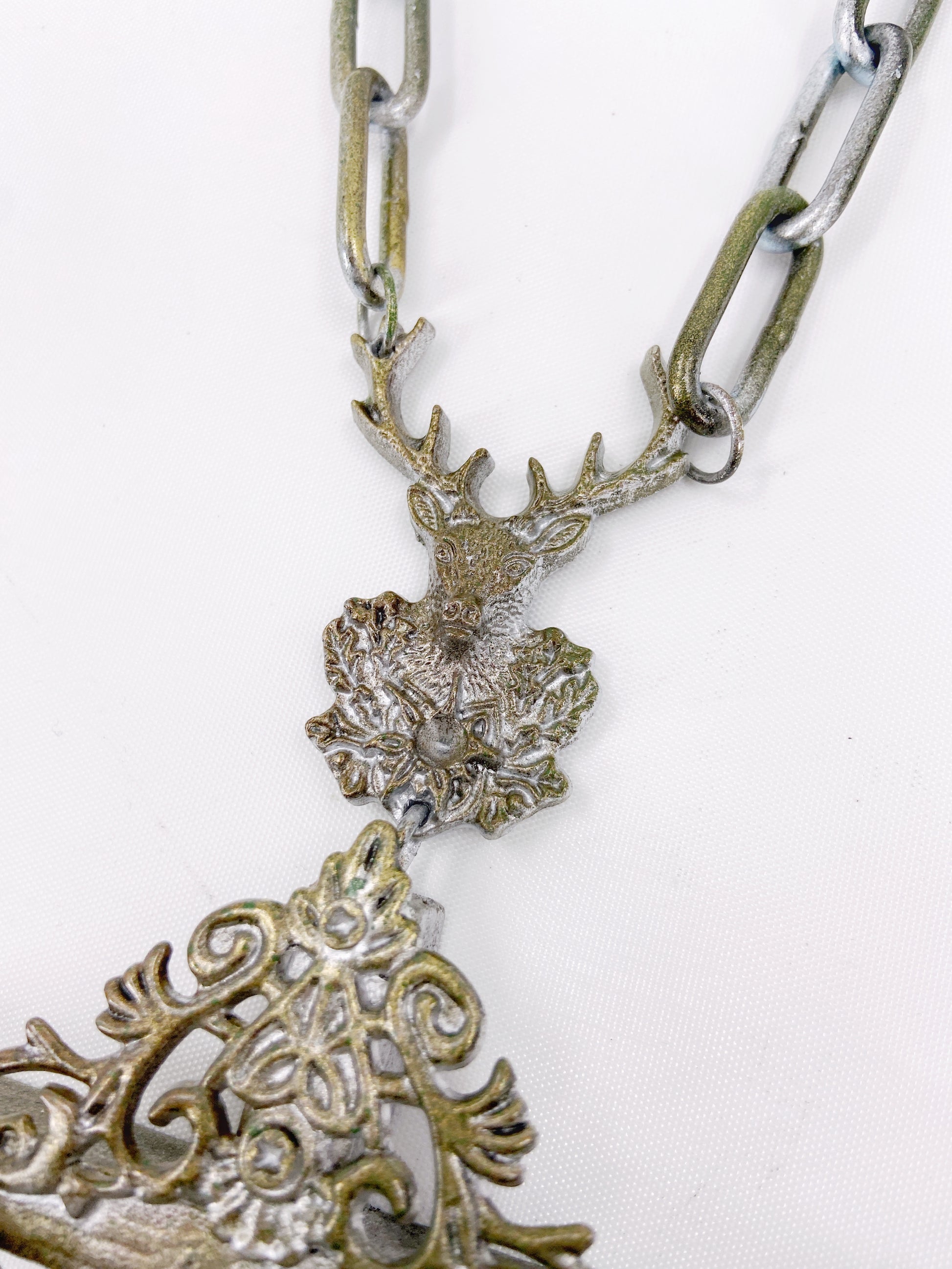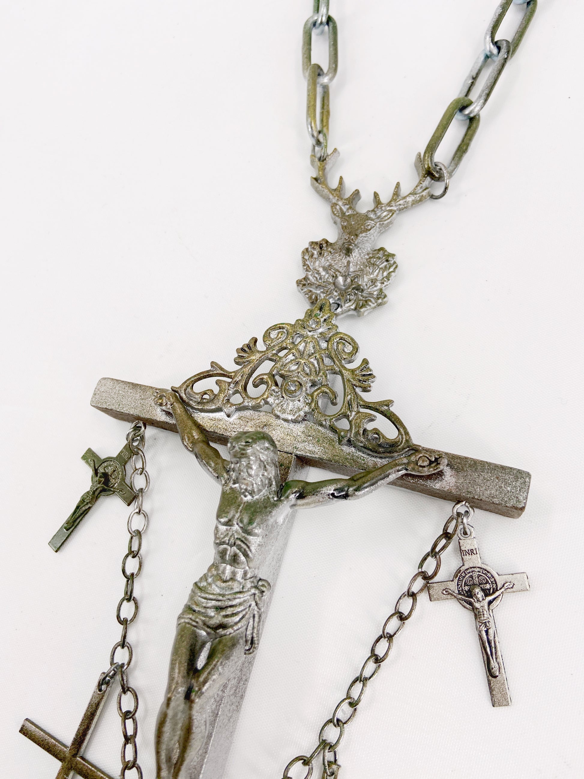 Composed of a wooden crucifix pendant with 4 crosses hung on chains, a deer ornament and heavy-weight metal chain