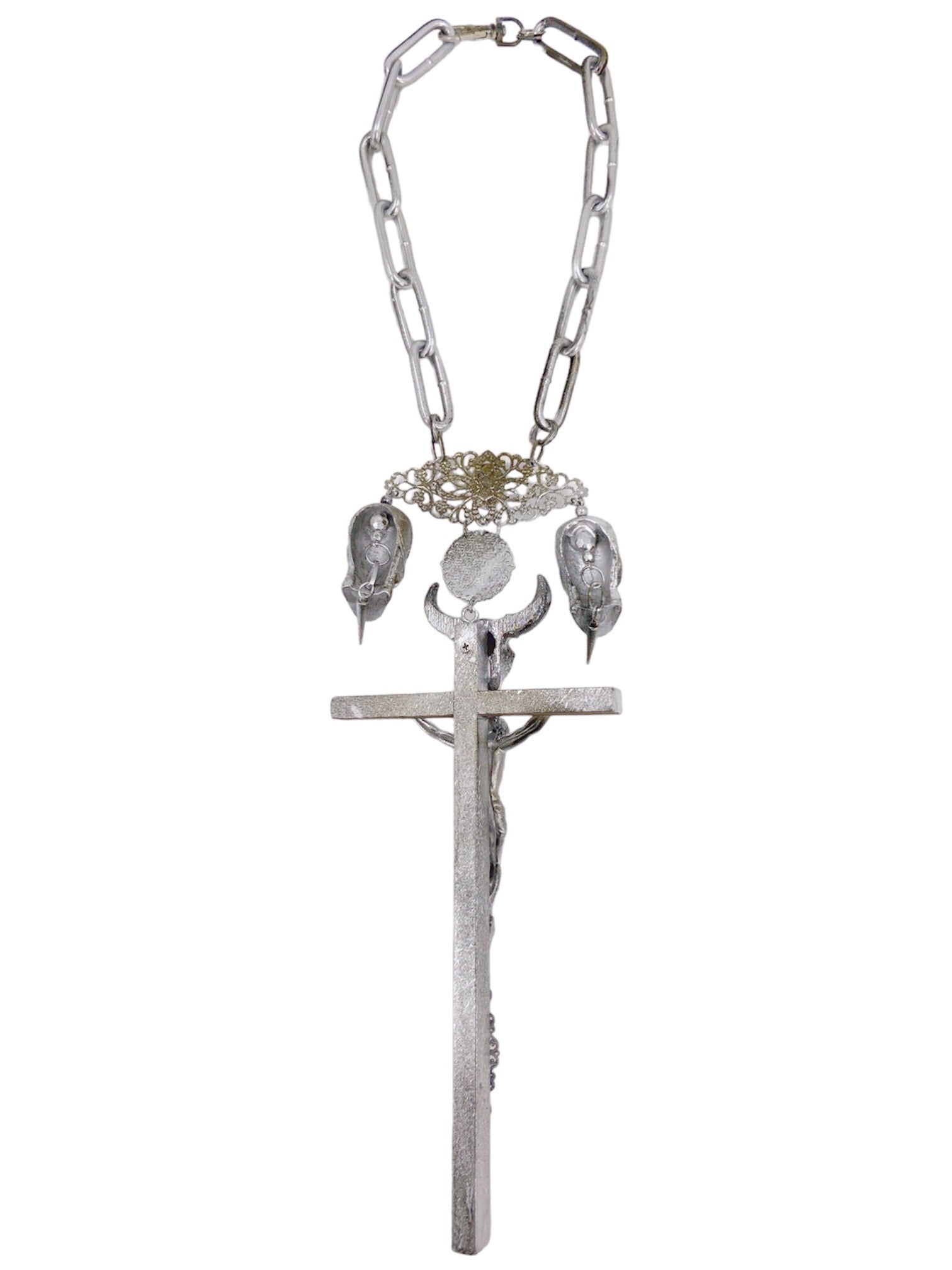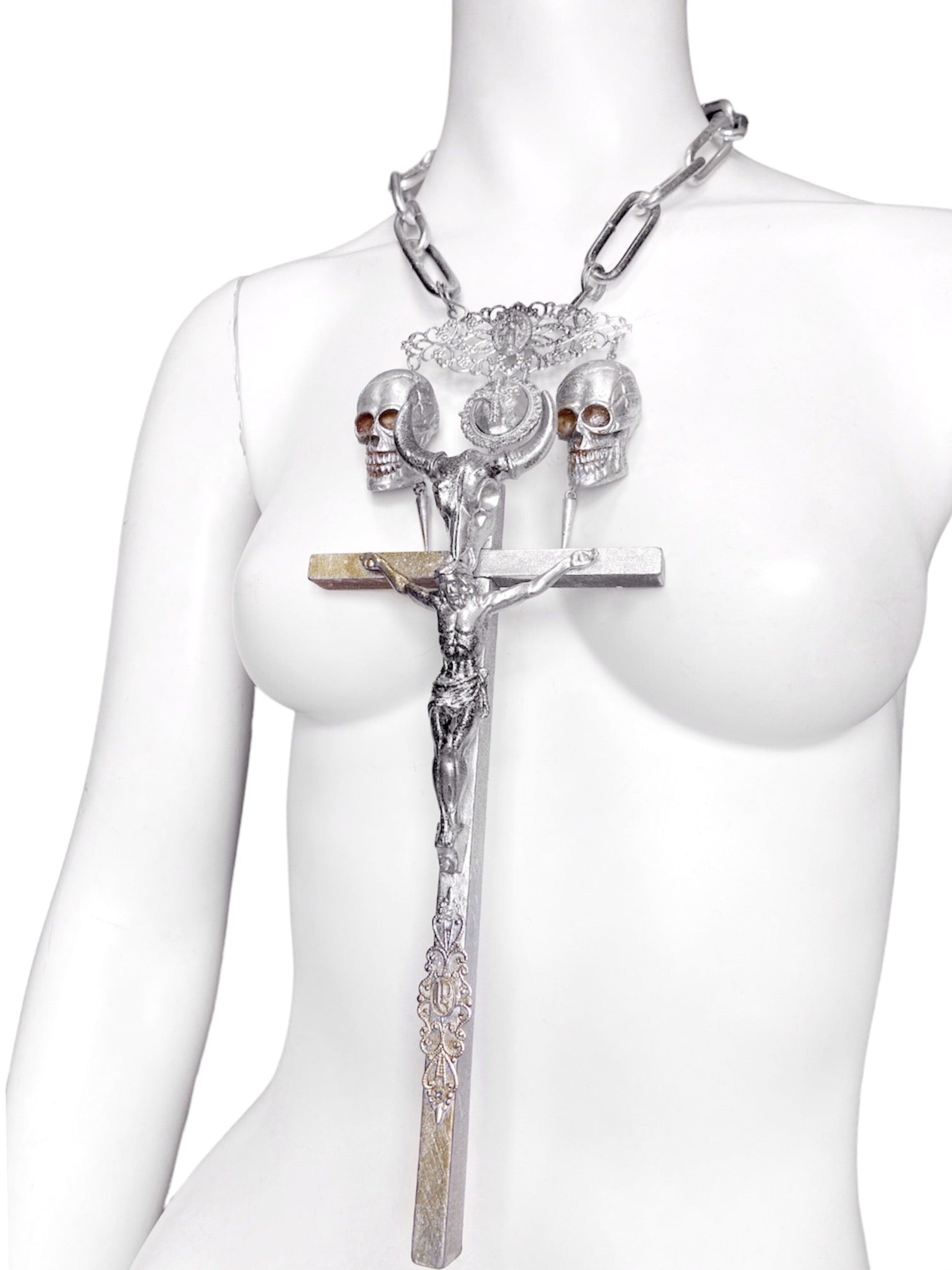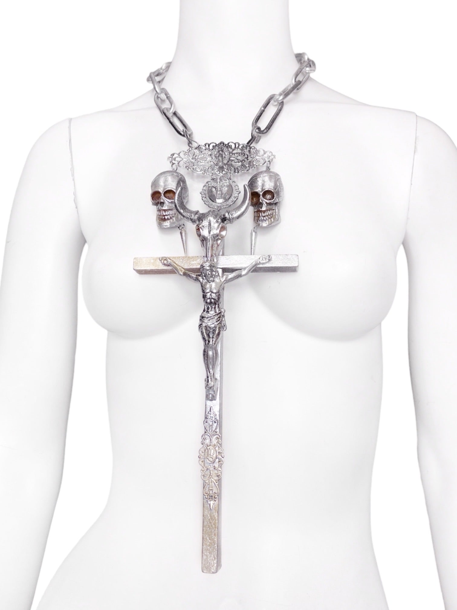 Composed of a giant crucifix with hand carved Jesus sculpture and bucranium (bull skull) sculpture that was synonymous with 90s Gaultier, a Virgin Mary ornament, another crucifix ornament, two skulls and two spikes, and a heavy-weight metal chain