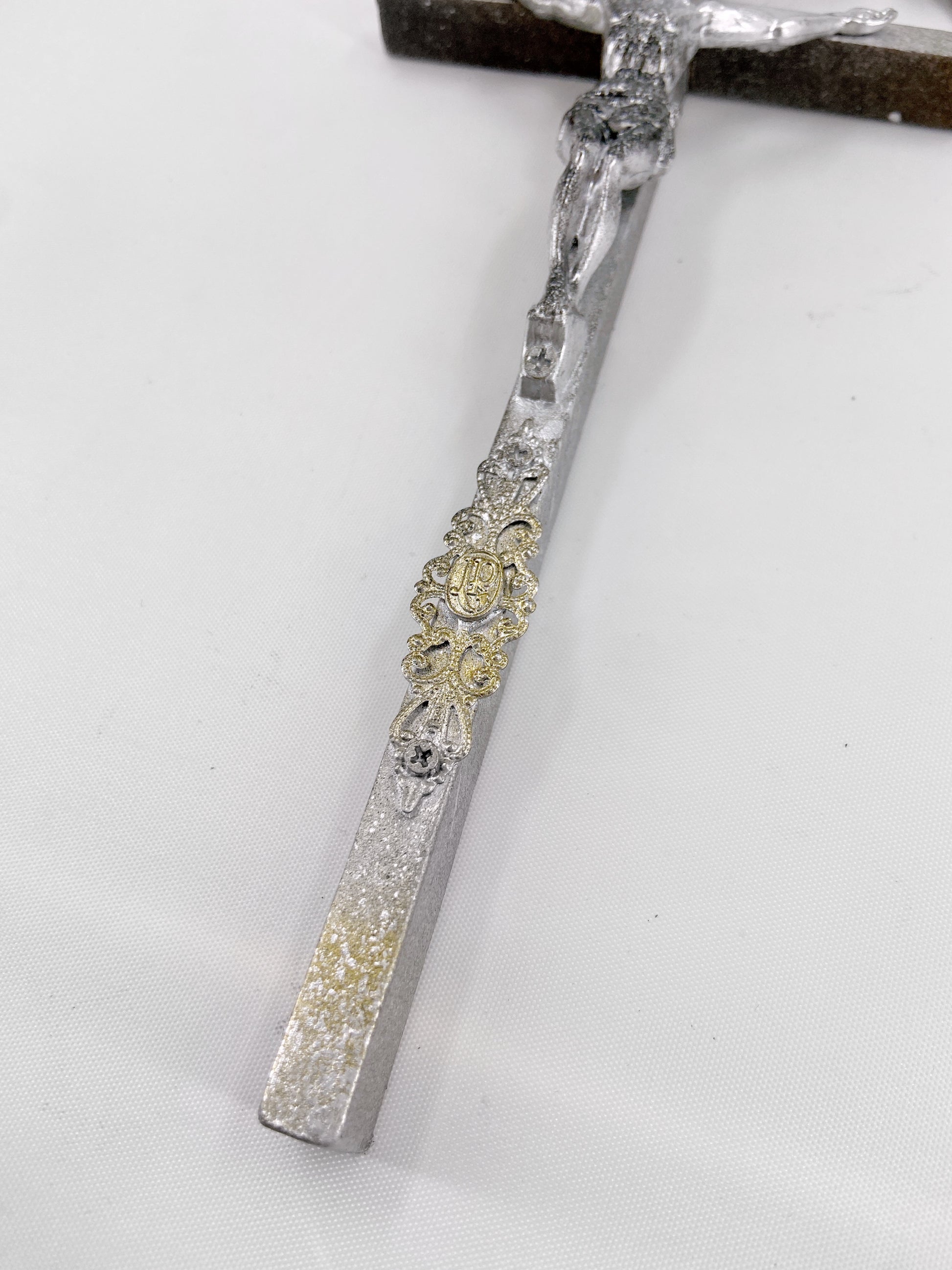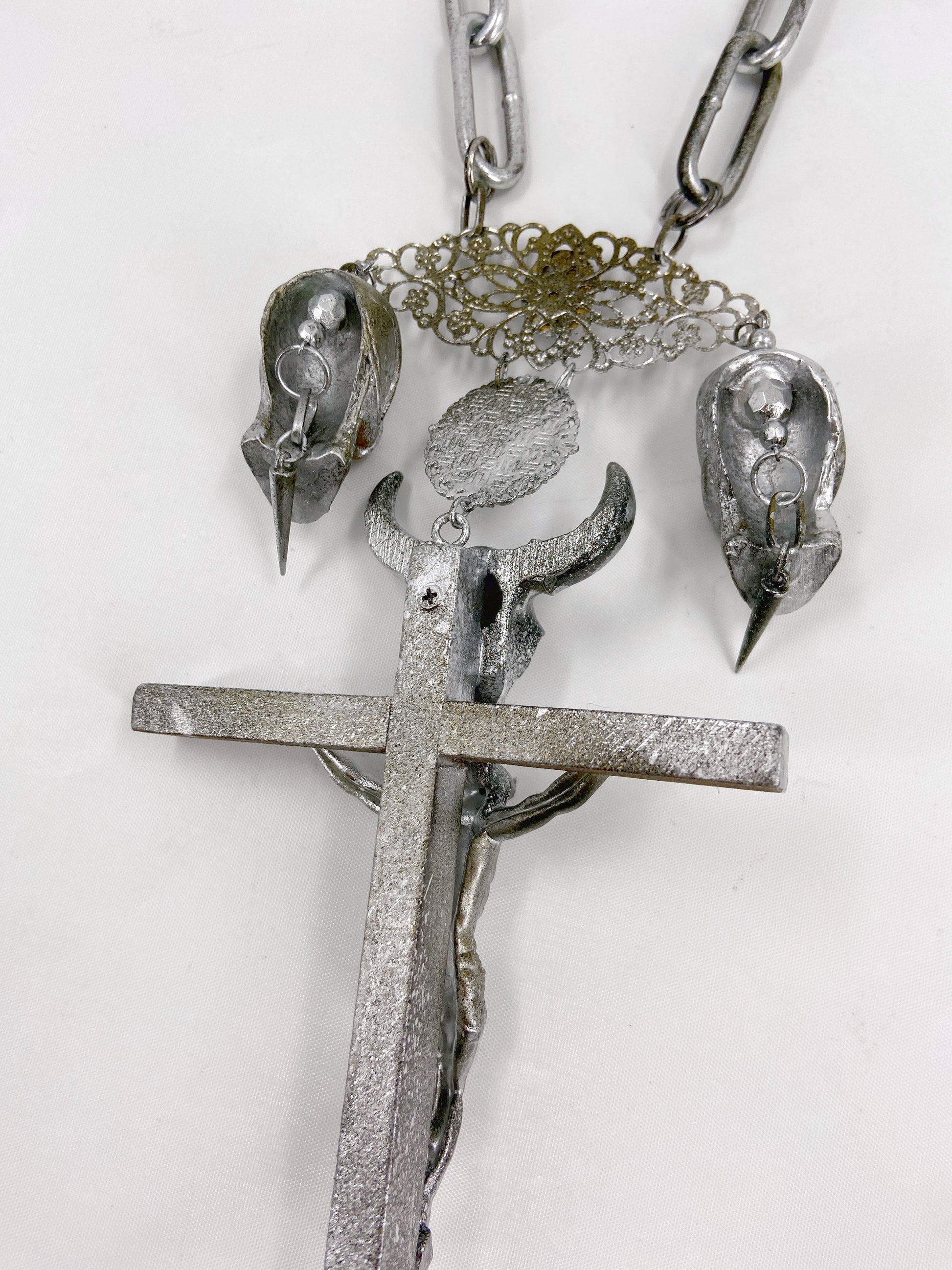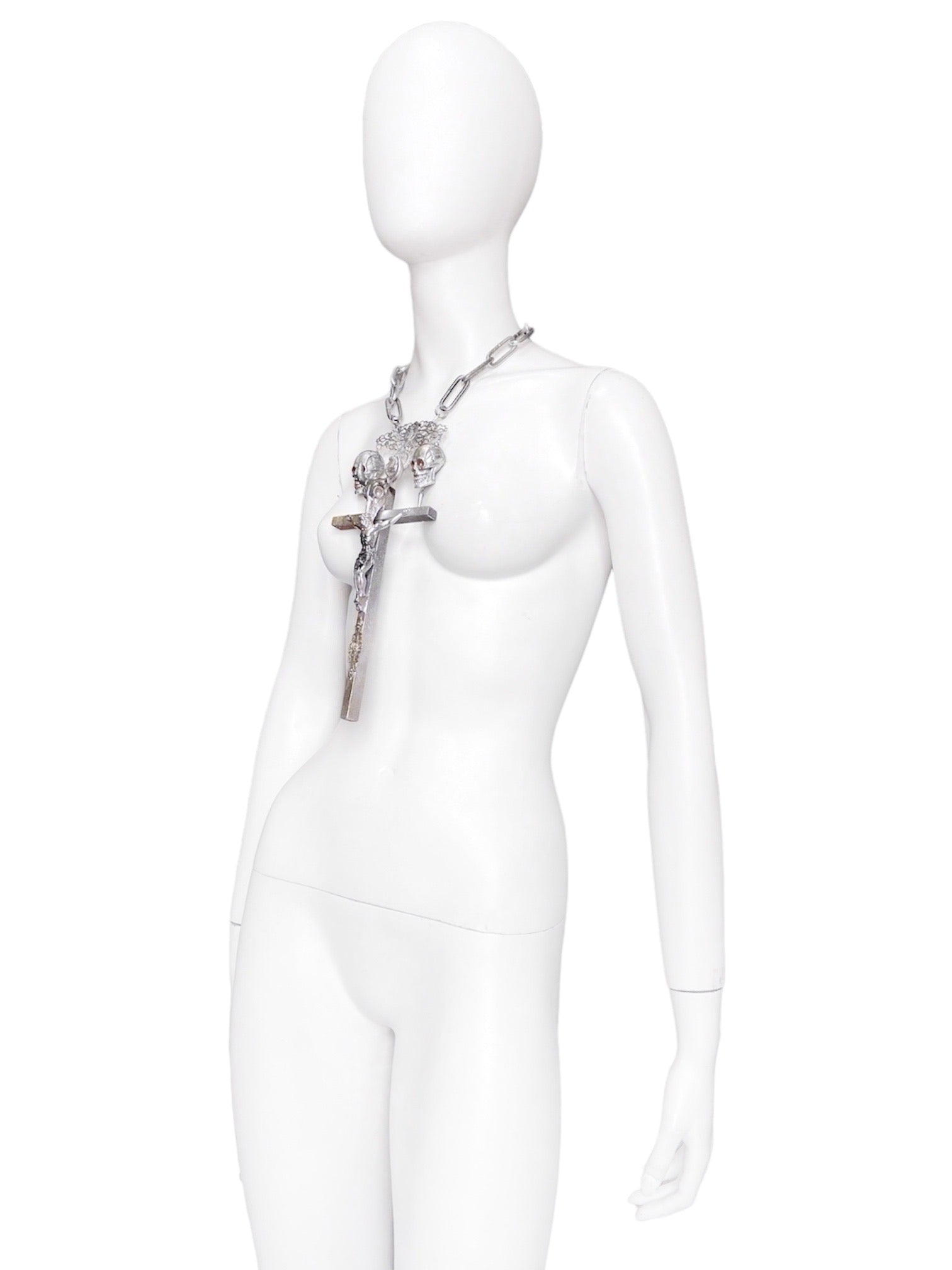 Composed of a giant crucifix with hand carved Jesus sculpture and bucranium (bull skull) sculpture that was synonymous with 90s Gaultier, a Virgin Mary ornament, another crucifix ornament, two skulls and two spikes, and a heavy-weight metal chain
