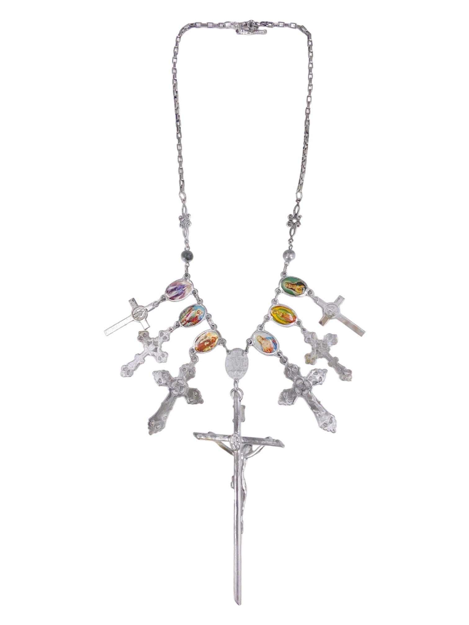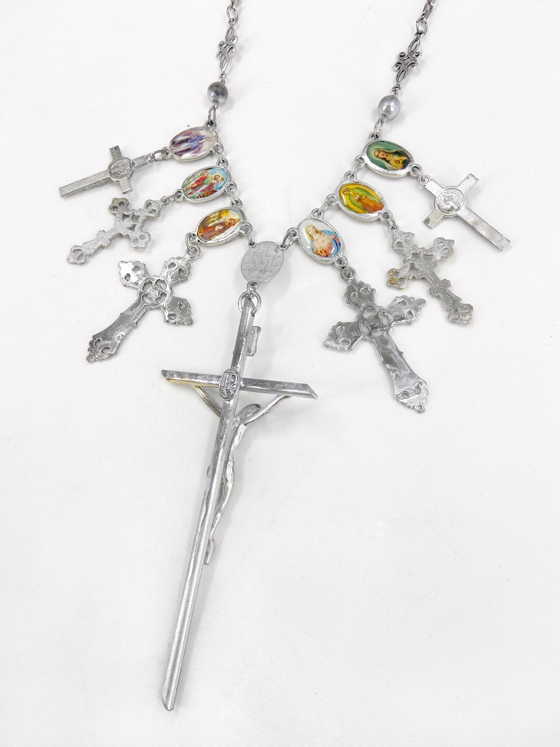 Composed of a crucifix cross with Jesus sculpture and a scroll carved with “INRI”, a metal Virgin Mary pendant, six individual enamel pendants with Christian iconography such as God and Virgin Mary, 3 sets totalling 6 crucifix crosses that are symmetrically matched on each side, and a metal chain