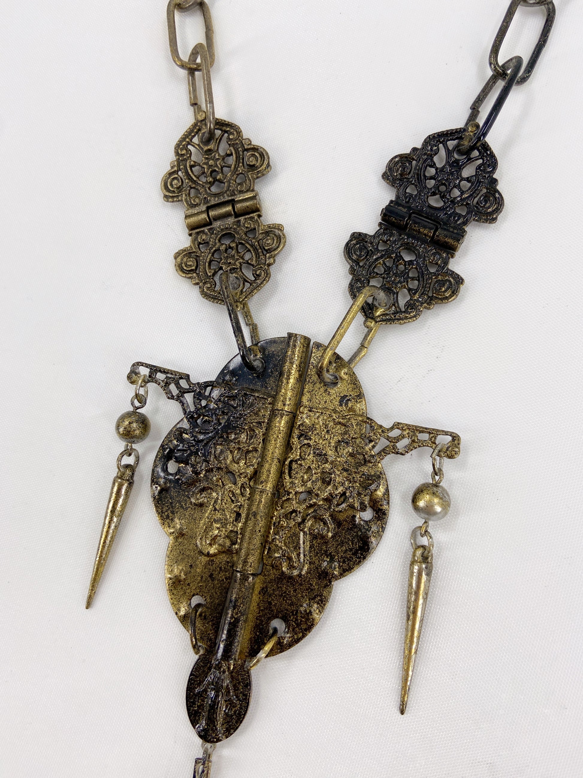 Notably the necklace is laid flat and airbrushed, giving the piece a antique look with uneven finish with some parts of the necklace still black