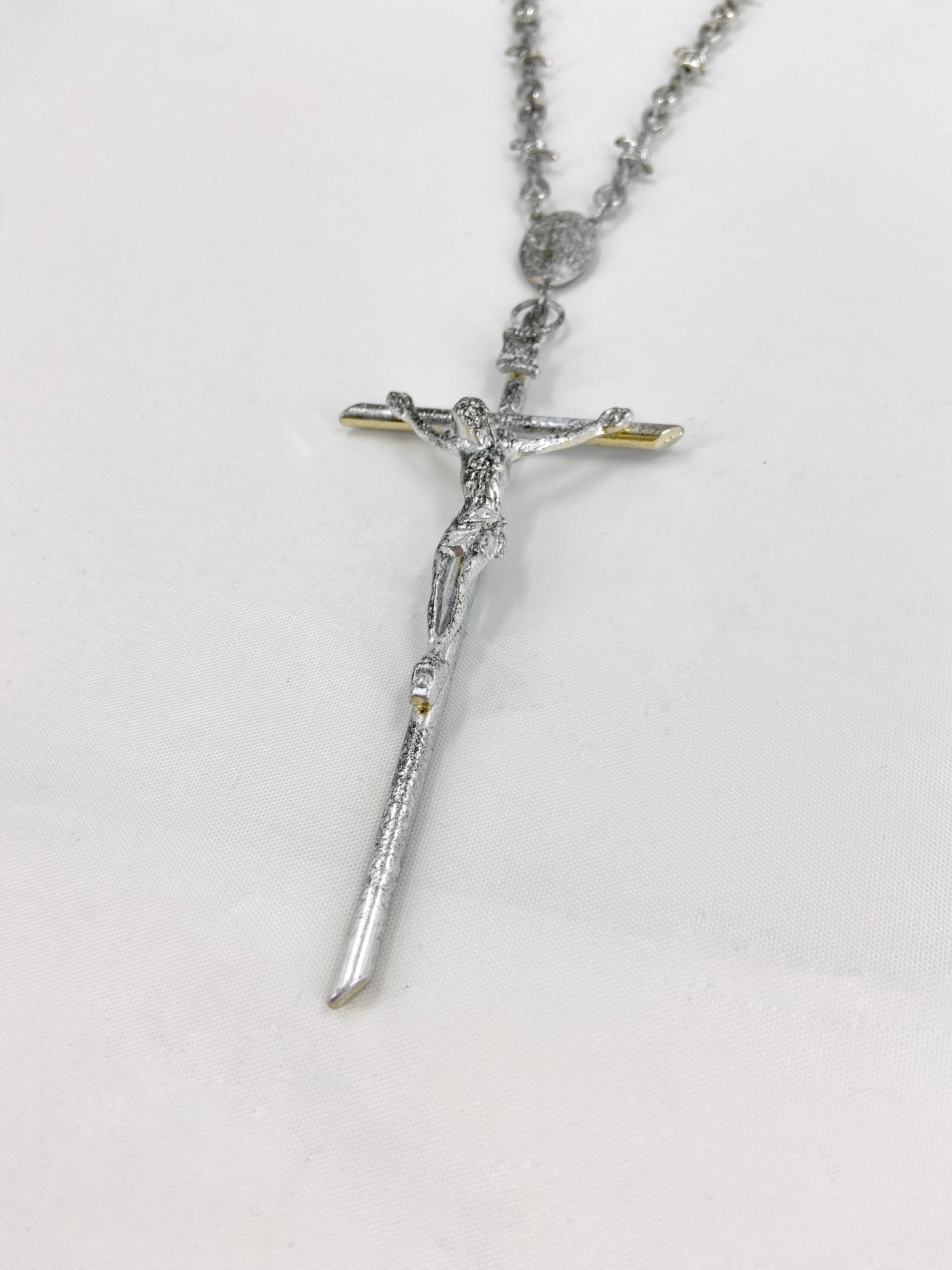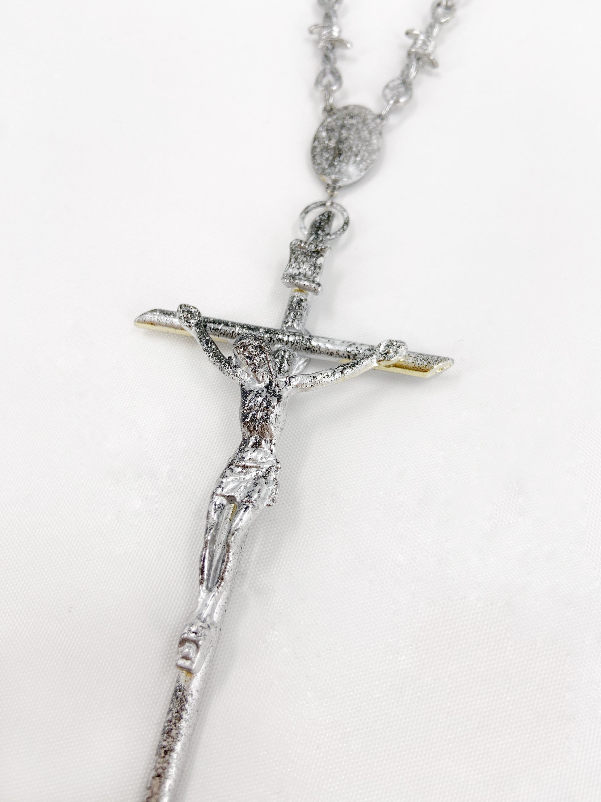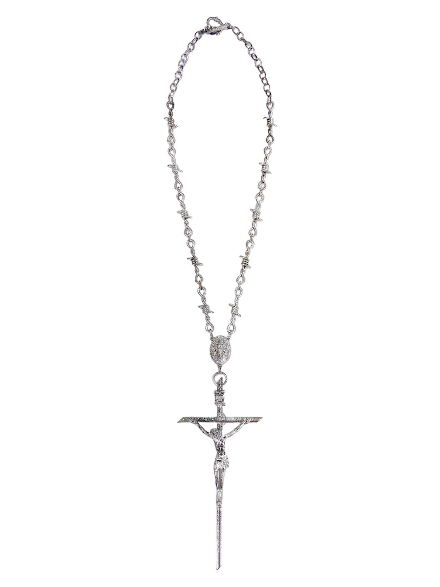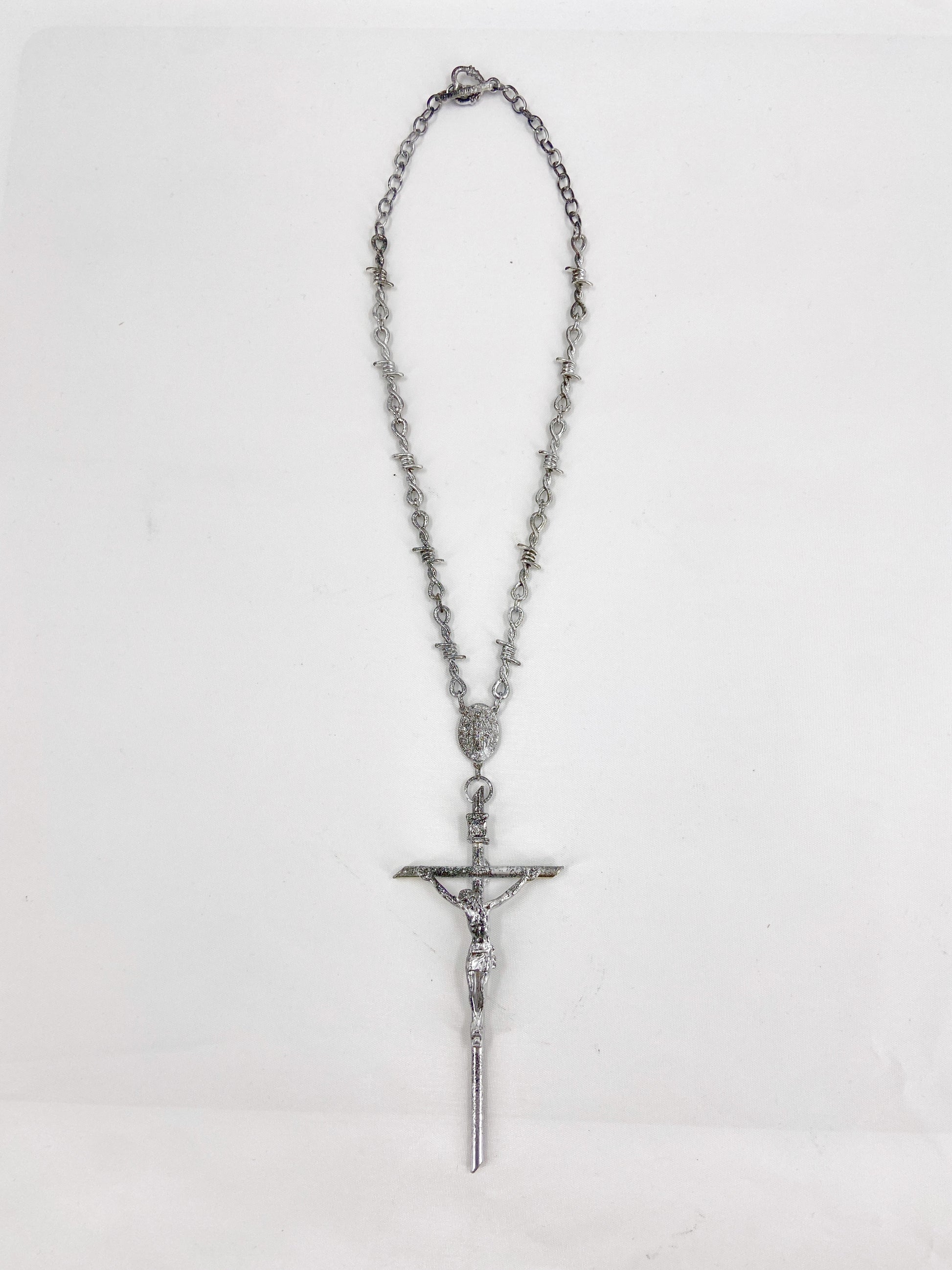 Composed of a metal crucifix pendant with Jesus sculpture and scroll carved with “INRI”, Virgin Mary pendant with barbed wire chain design and a heart-shaped closure
