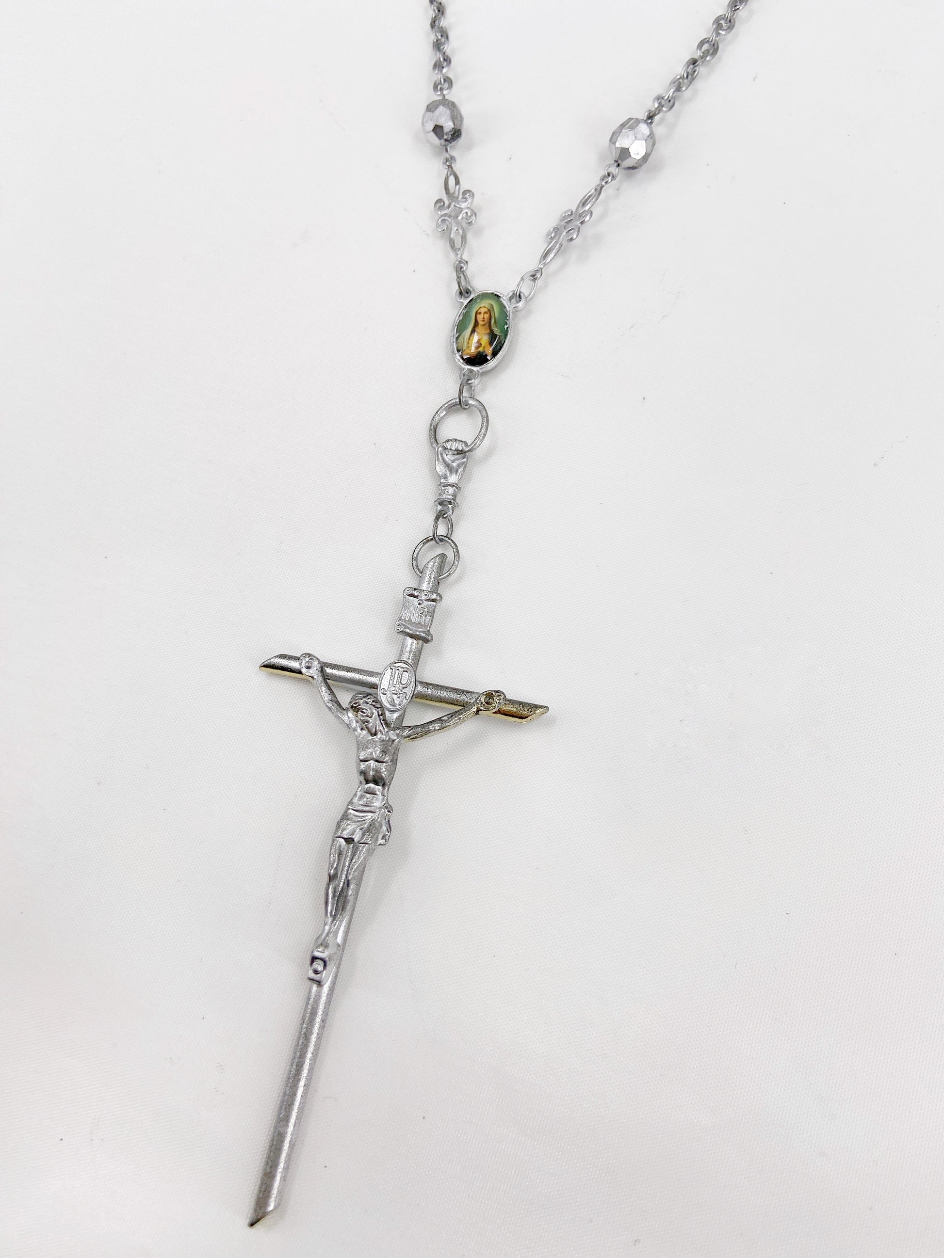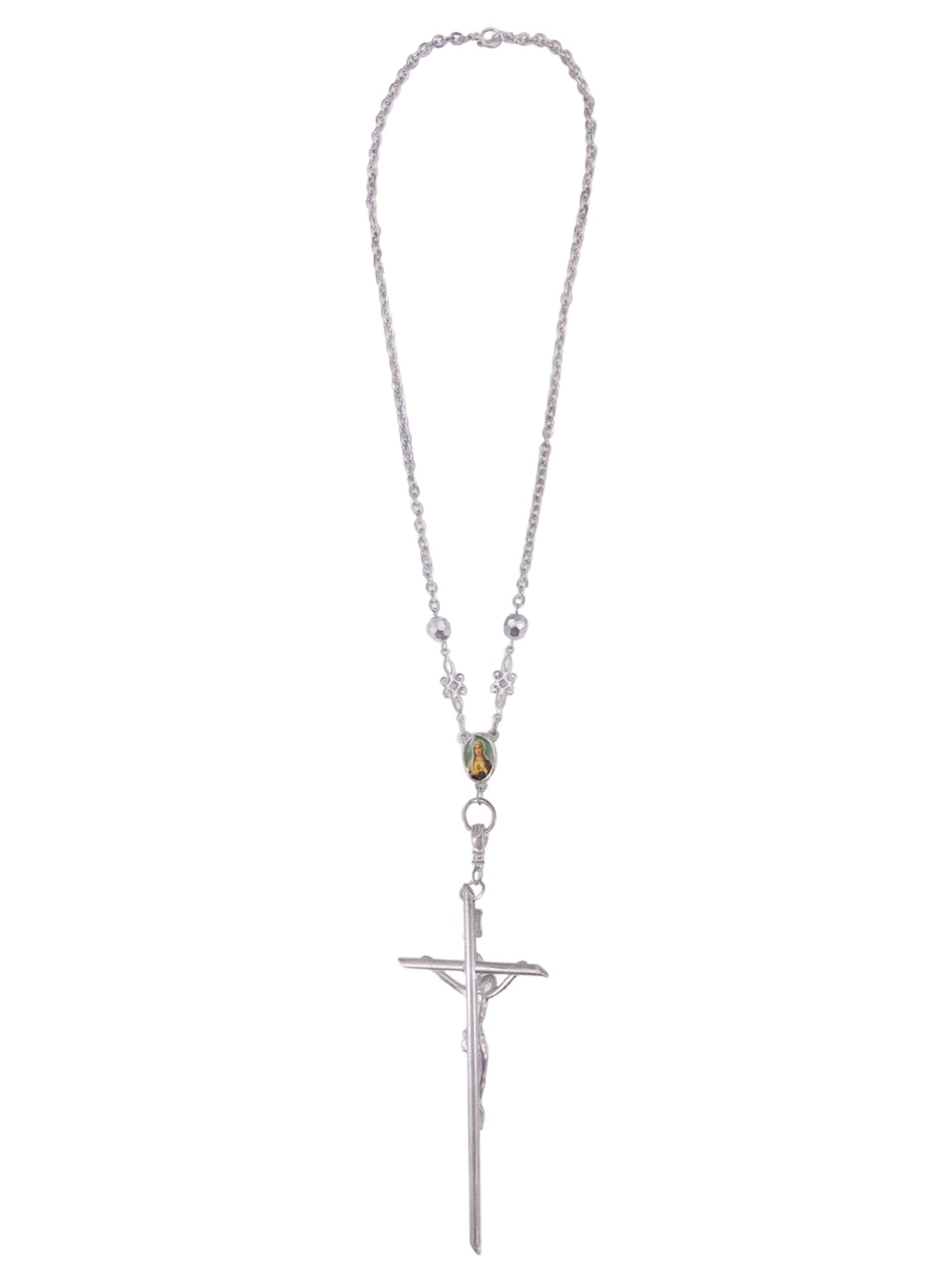 Composed of a metal crucifix pendant with Jesus sculpture and scroll carved with “INRI”, a Virgin Mary enamel pendant and a heart-shaped closure