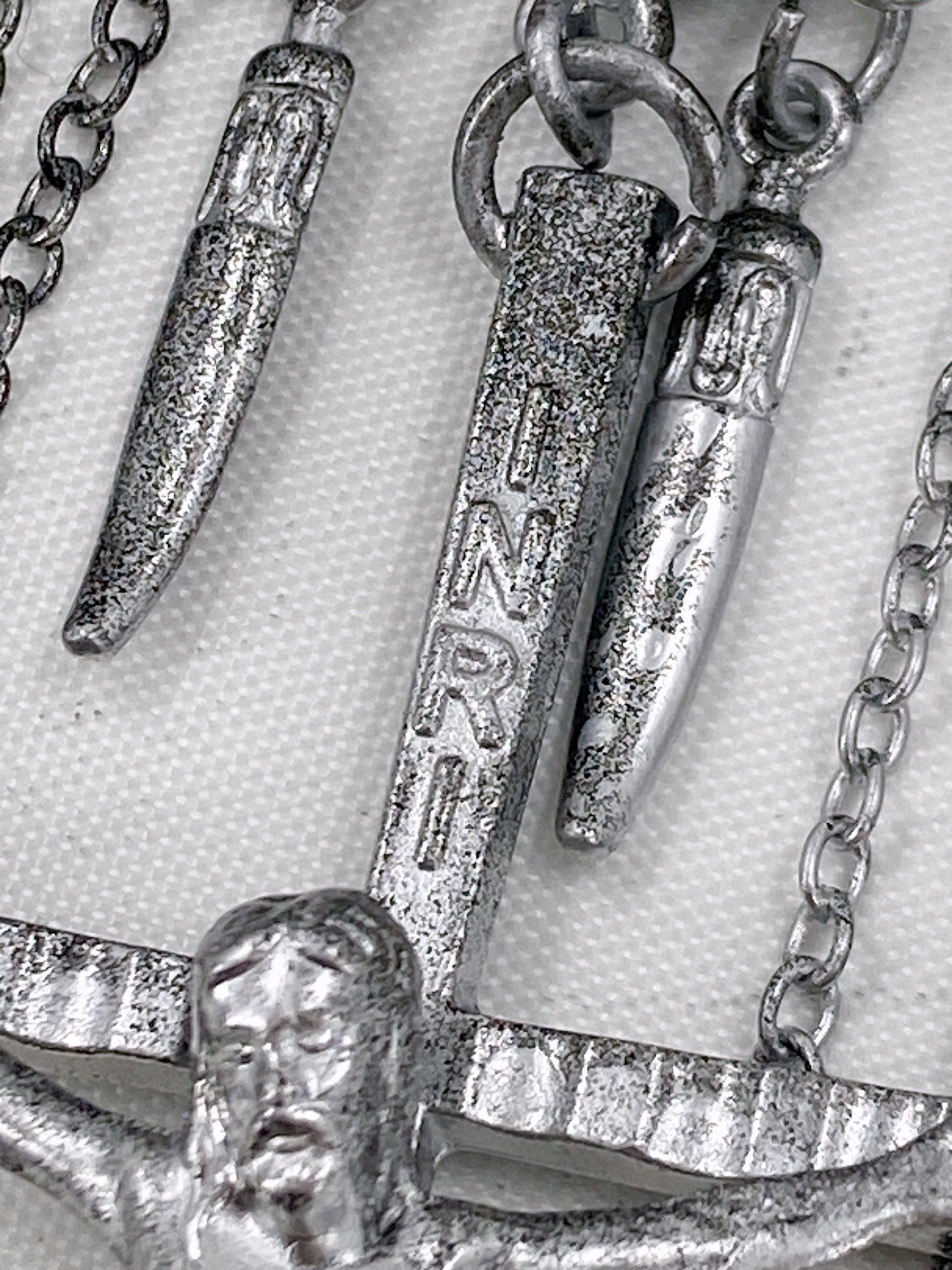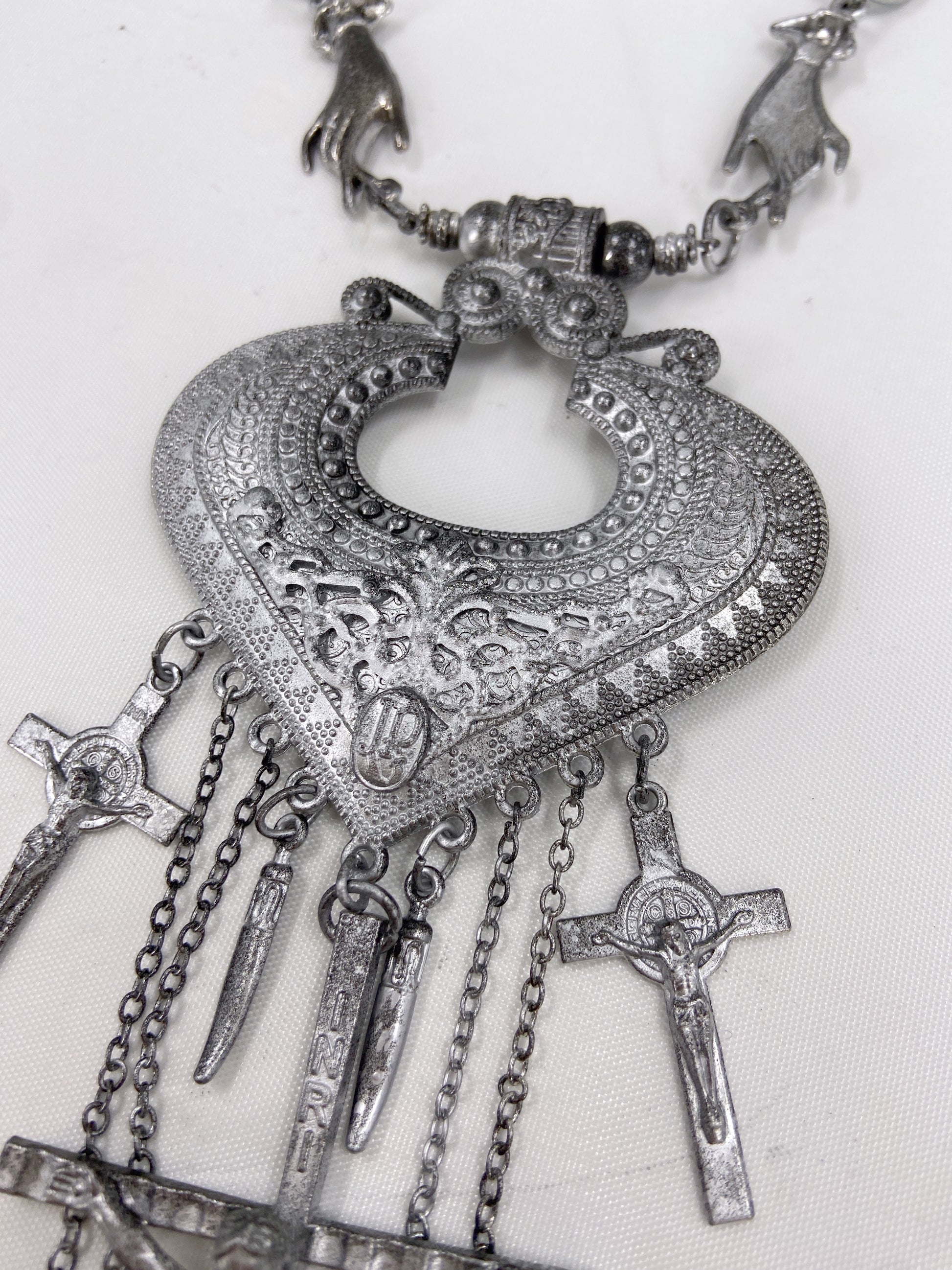 Composed of a giant spade with decorative carving and JPG logo stamp, with daggers and chains as a decorative fringe and three crucifix crosses, two hands and a heavy-weight metal chain