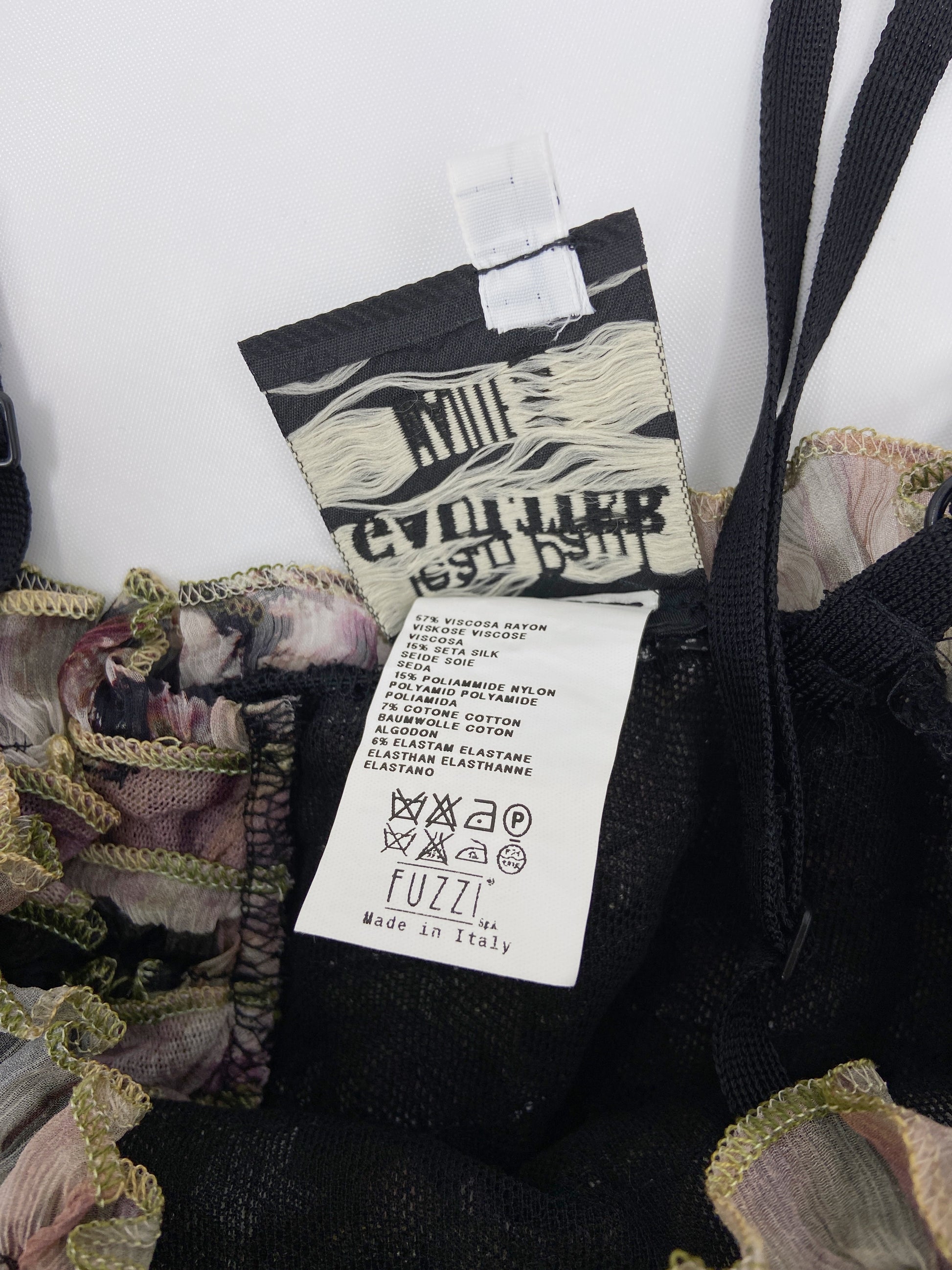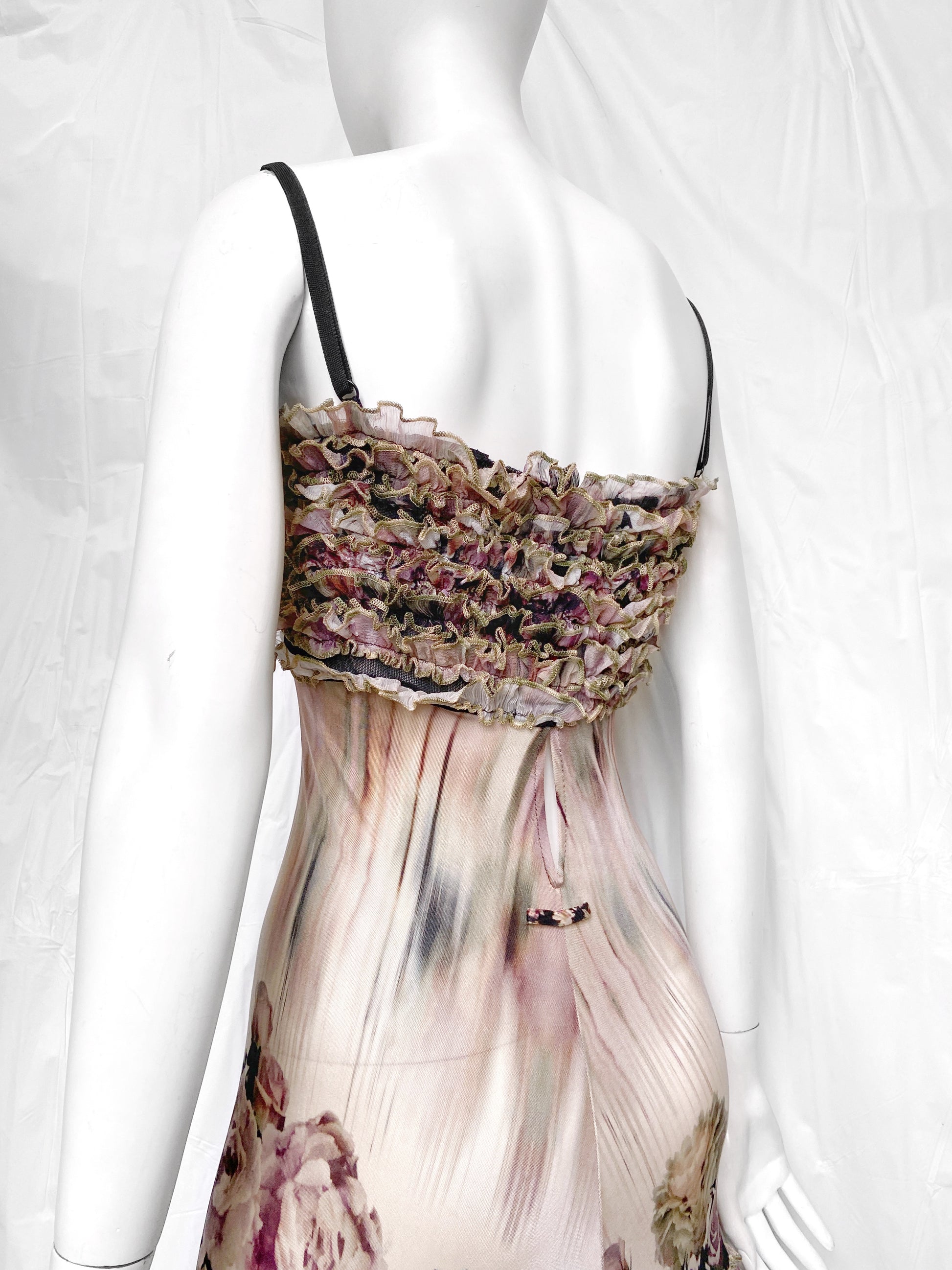 A similar version of the runway dress, spaghetti straps with various graphic prints and highly detailed ruched floral fabrics