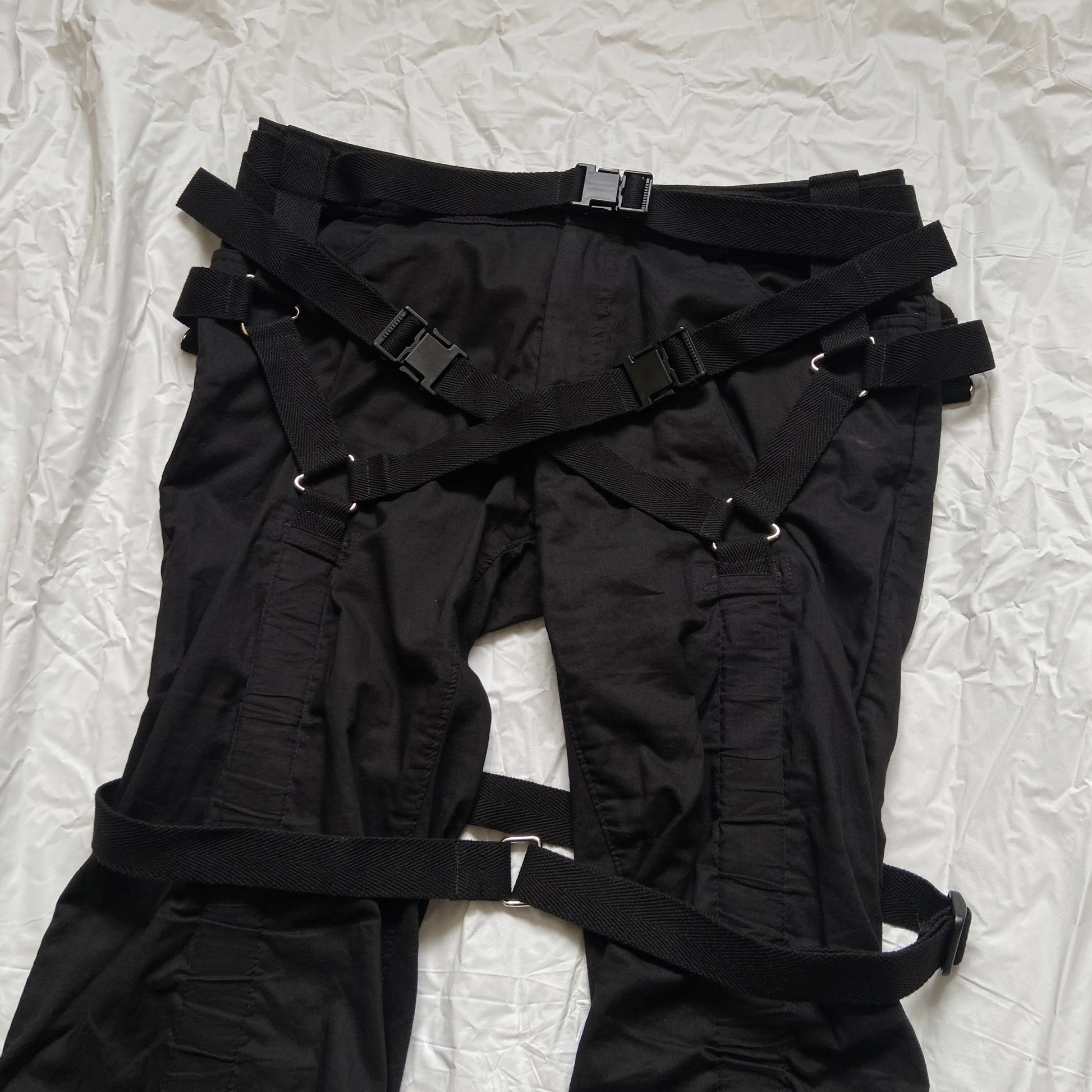 Pants are even more crazy in design with three buckle+straps in the front, another strap wraps both legs together in a bind. Flared legs.