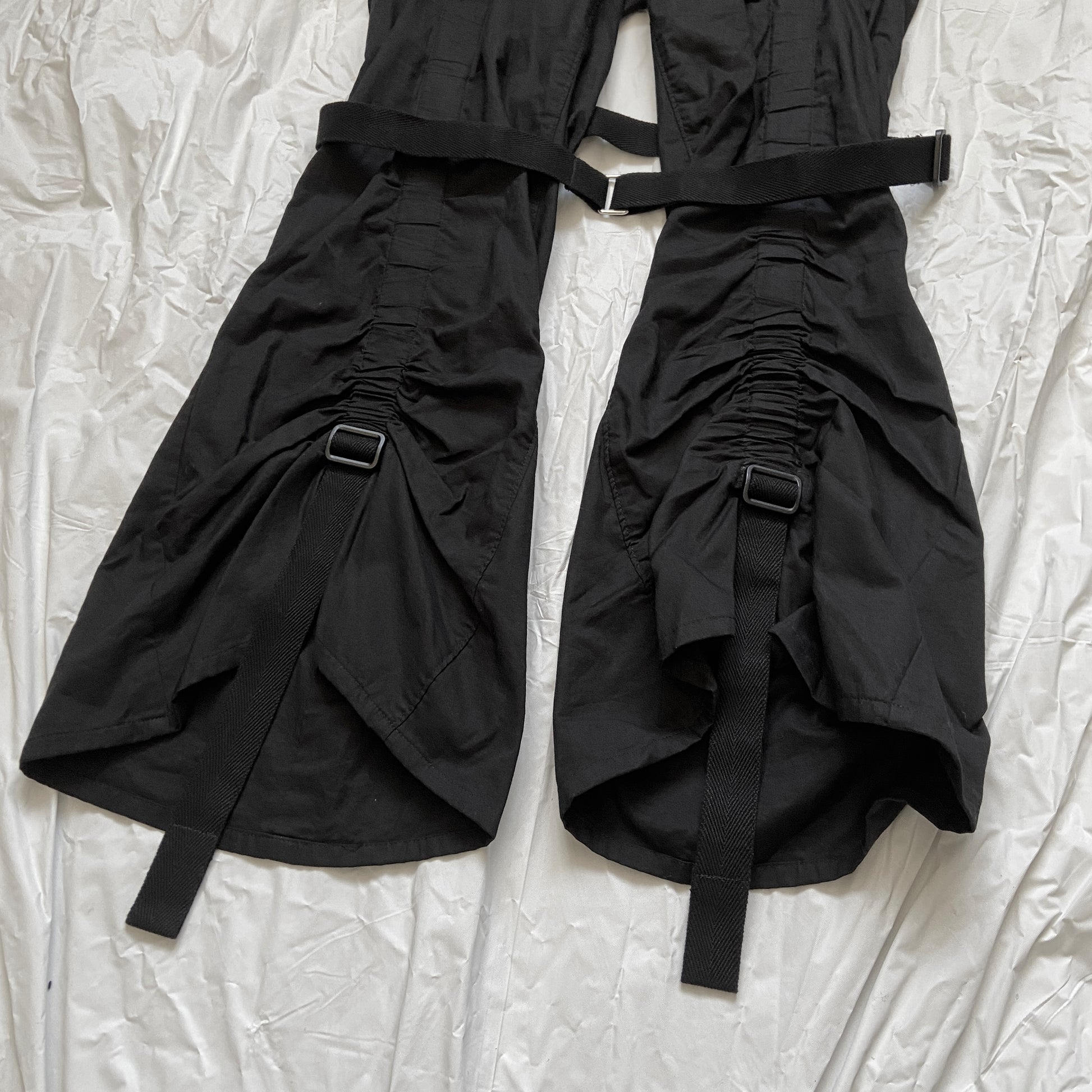An astonishing pair from classic junya bondage designs, back to 2003 when y2k is in full bloom and junya decided to put one of the sassiest runways ever, 1800s milkmaids going parachute, introducing pastel colours with not often associated parachute bondage elements, the runway looks fun and cozy at the same time. Buckles, metal rings and straps all over.
