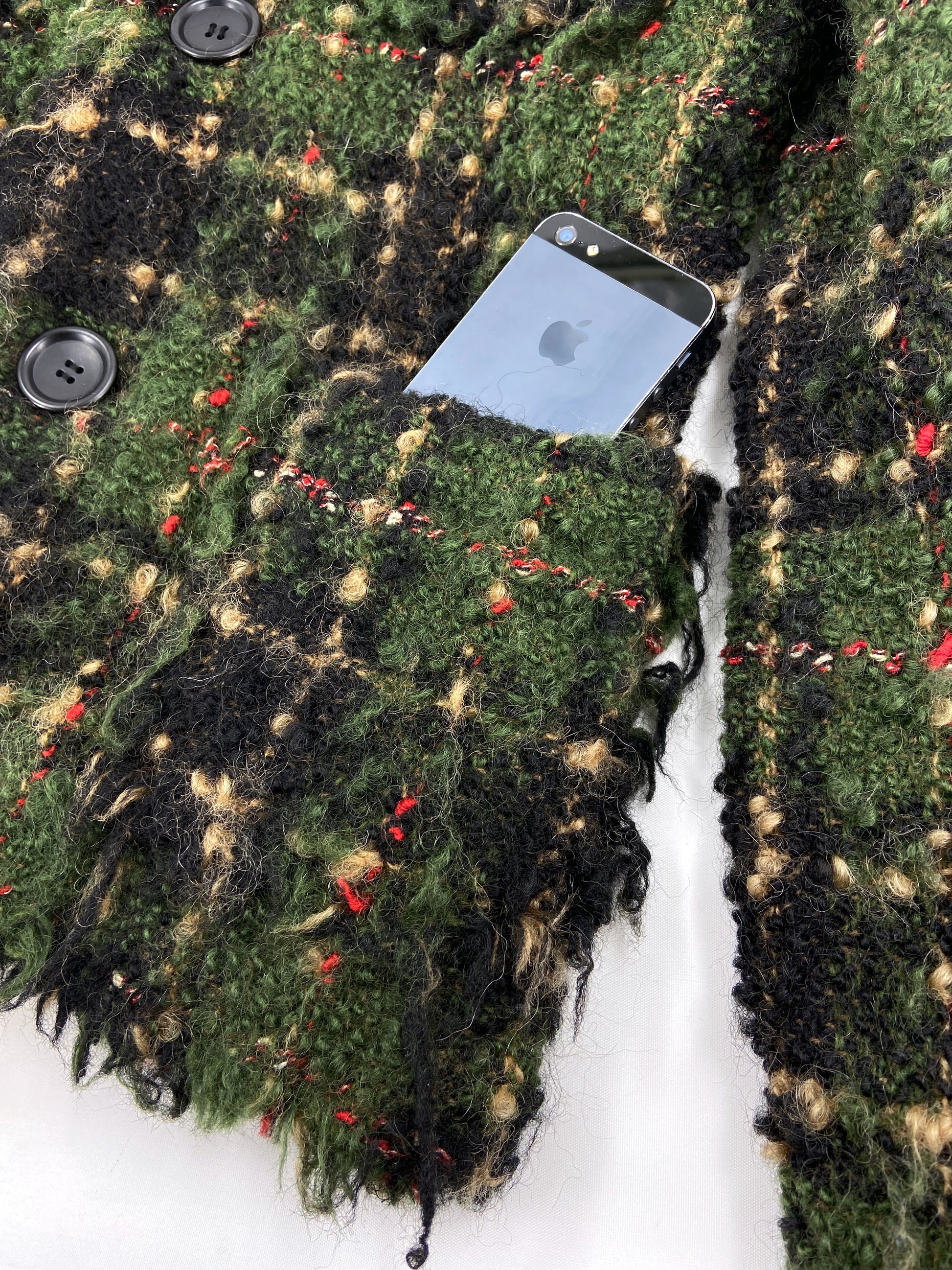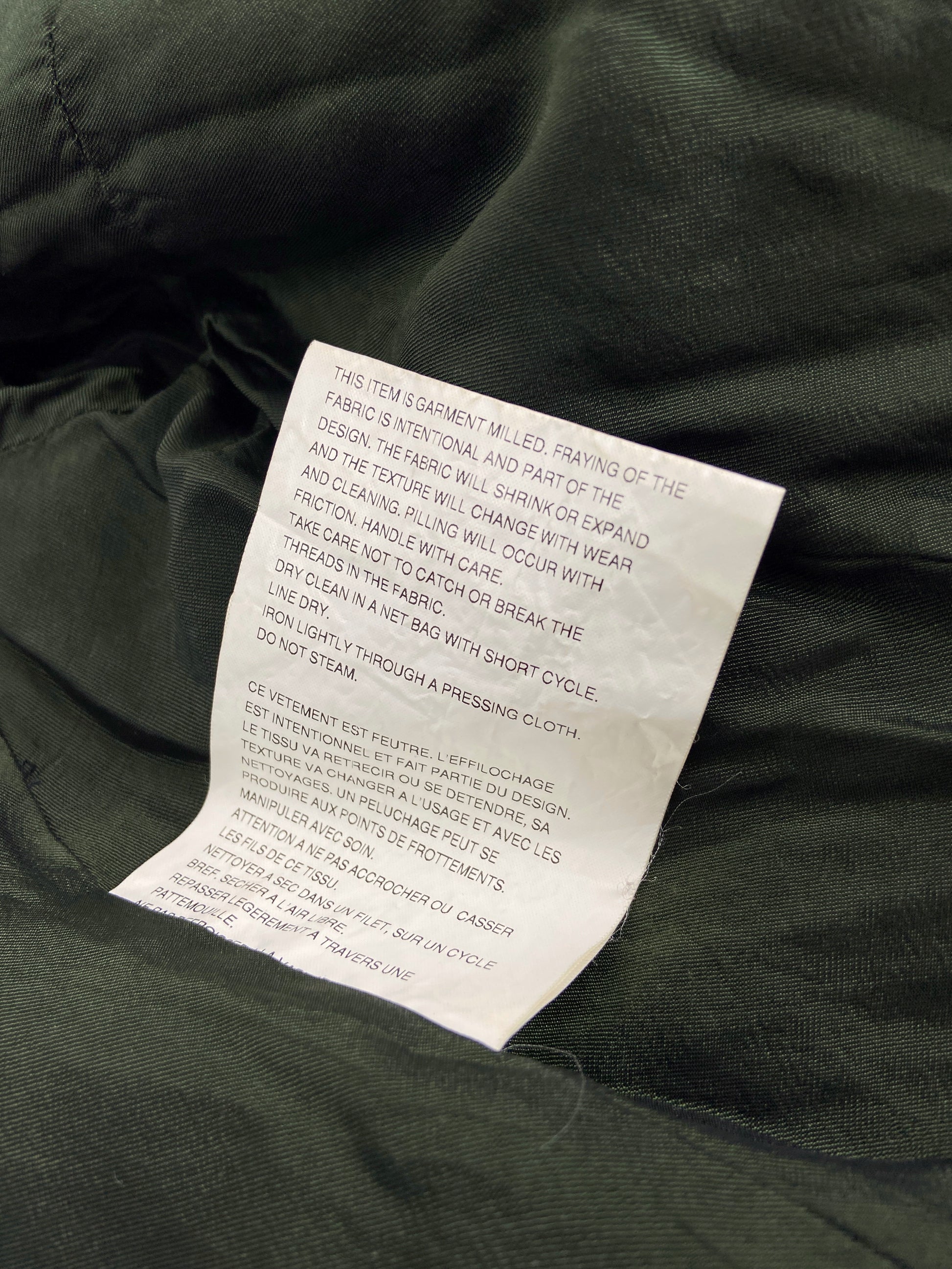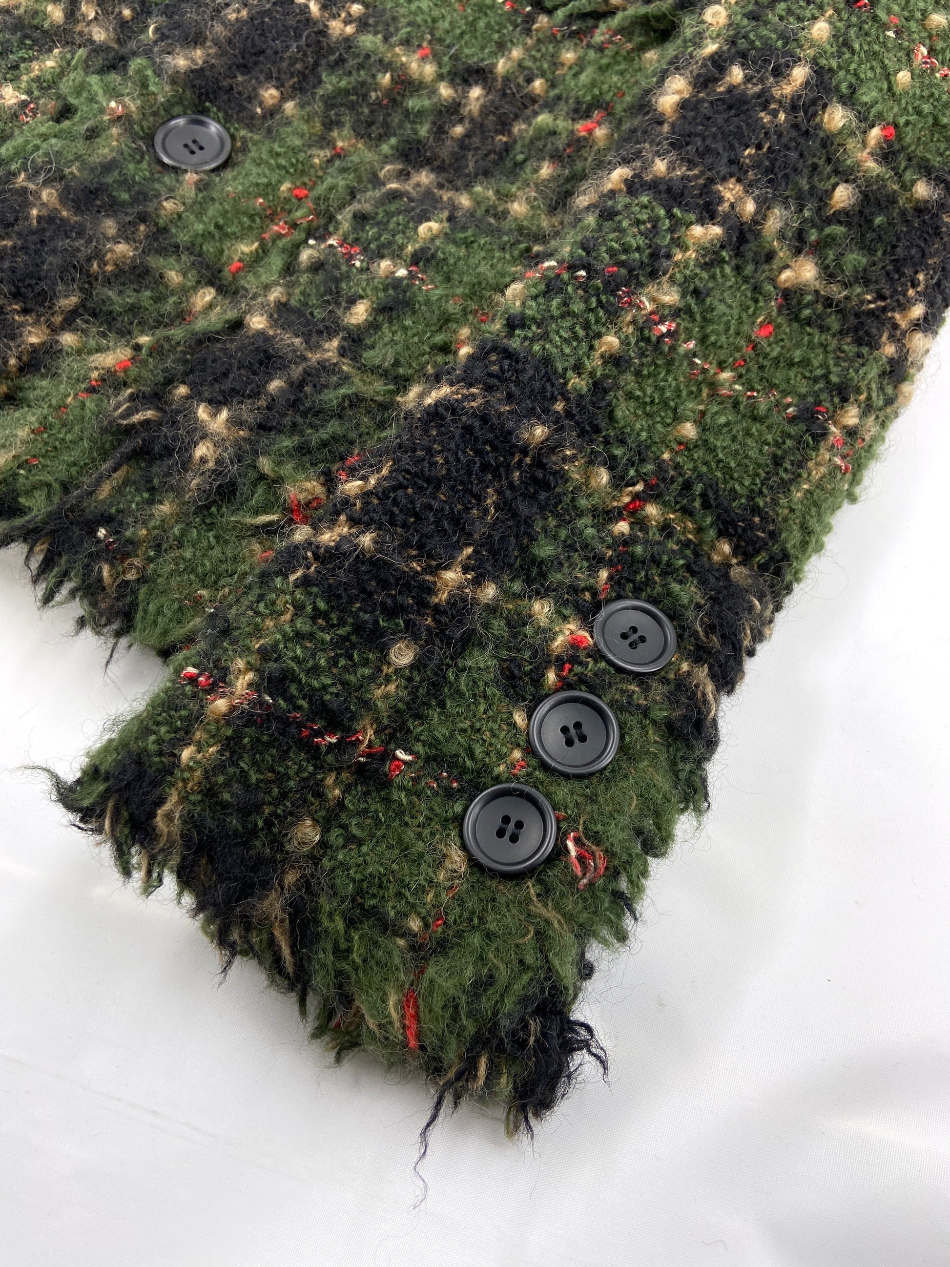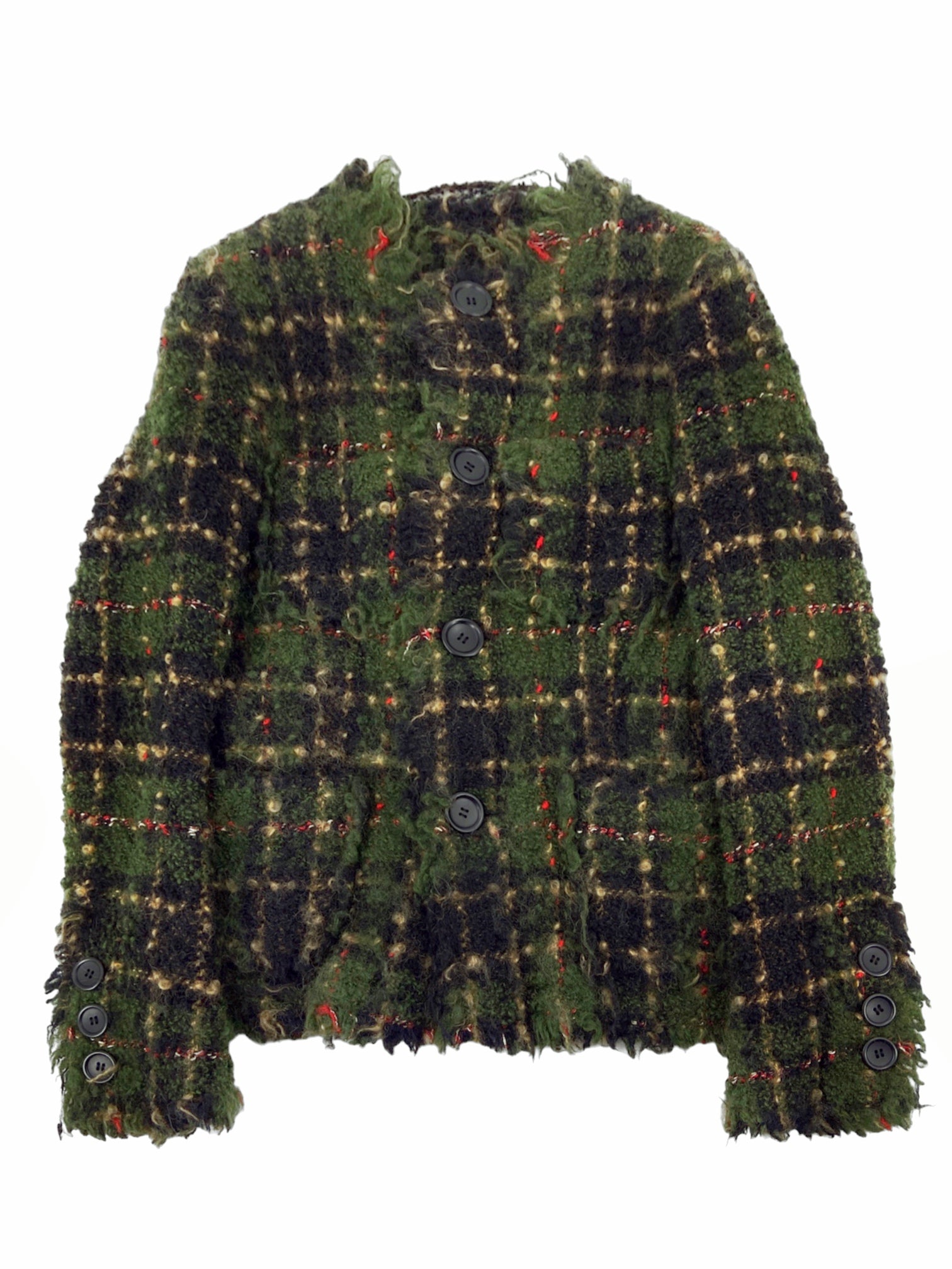 A very classic jacket heavily distressed with boiled wool that makes the wool and weaved into tweed patterns, edges with