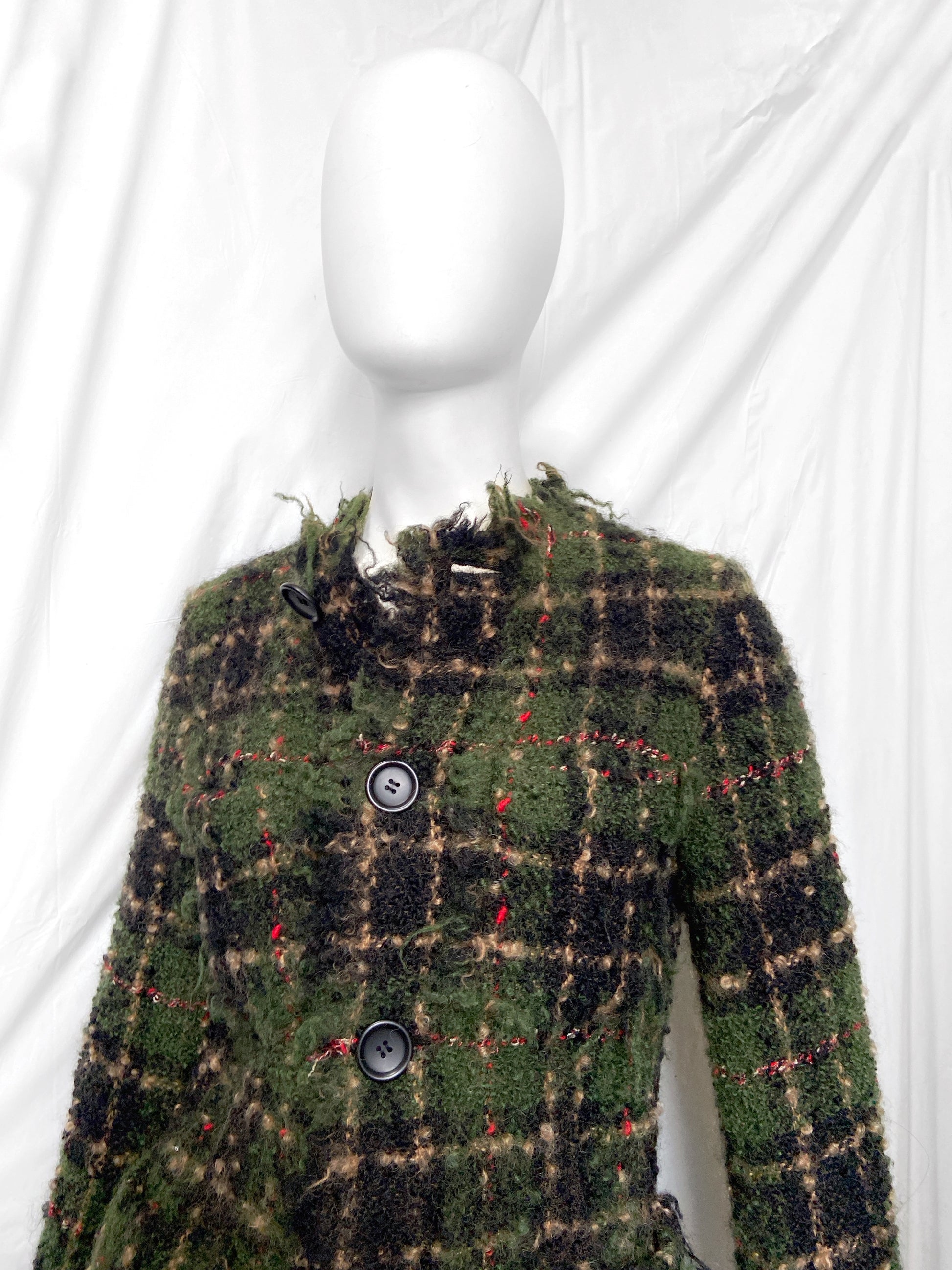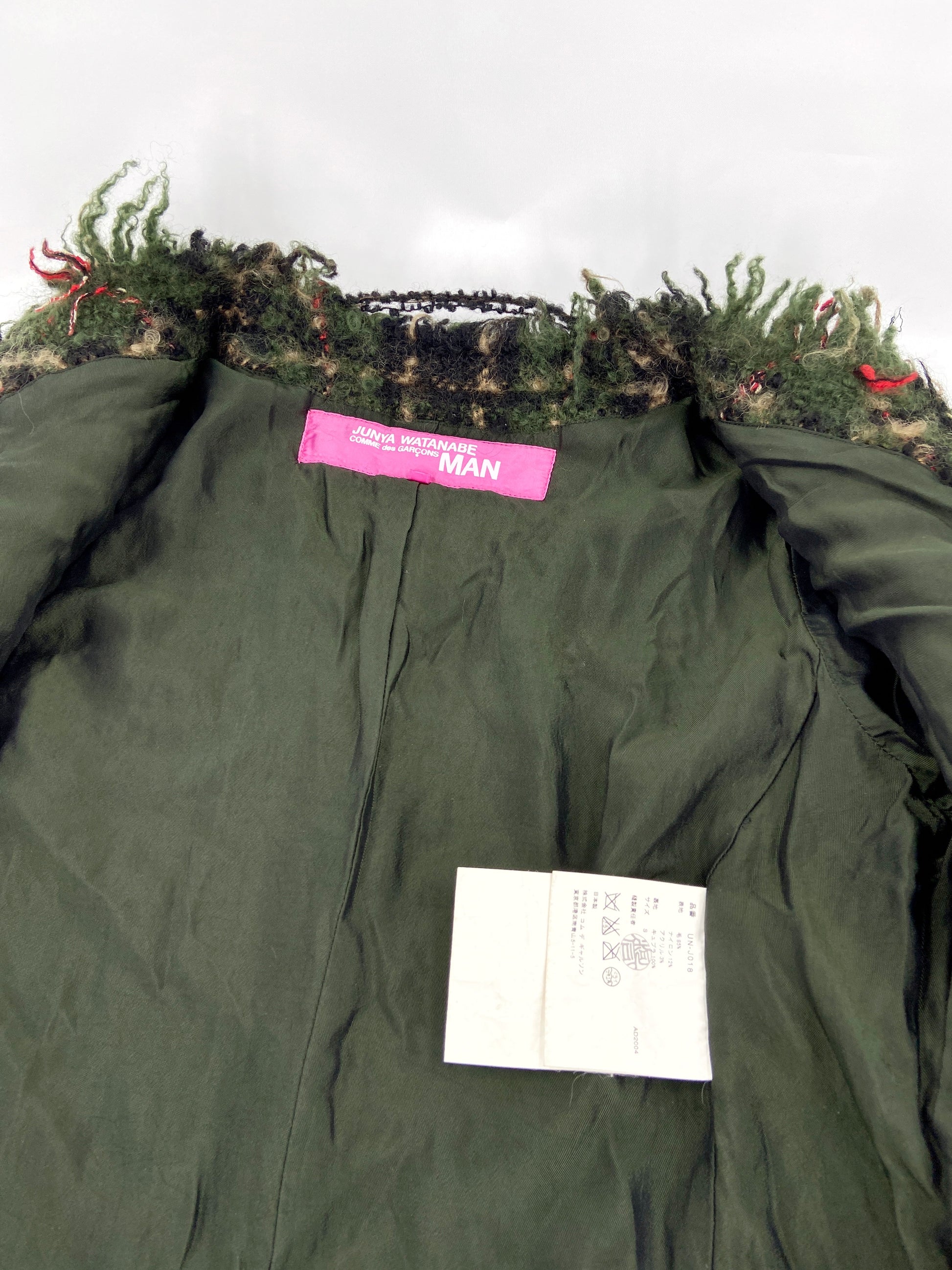 A clear callback to Fall 2003 of the Junya Watanabe mainline collection, with similar distressed Chanel-esque tweed jackets presented
