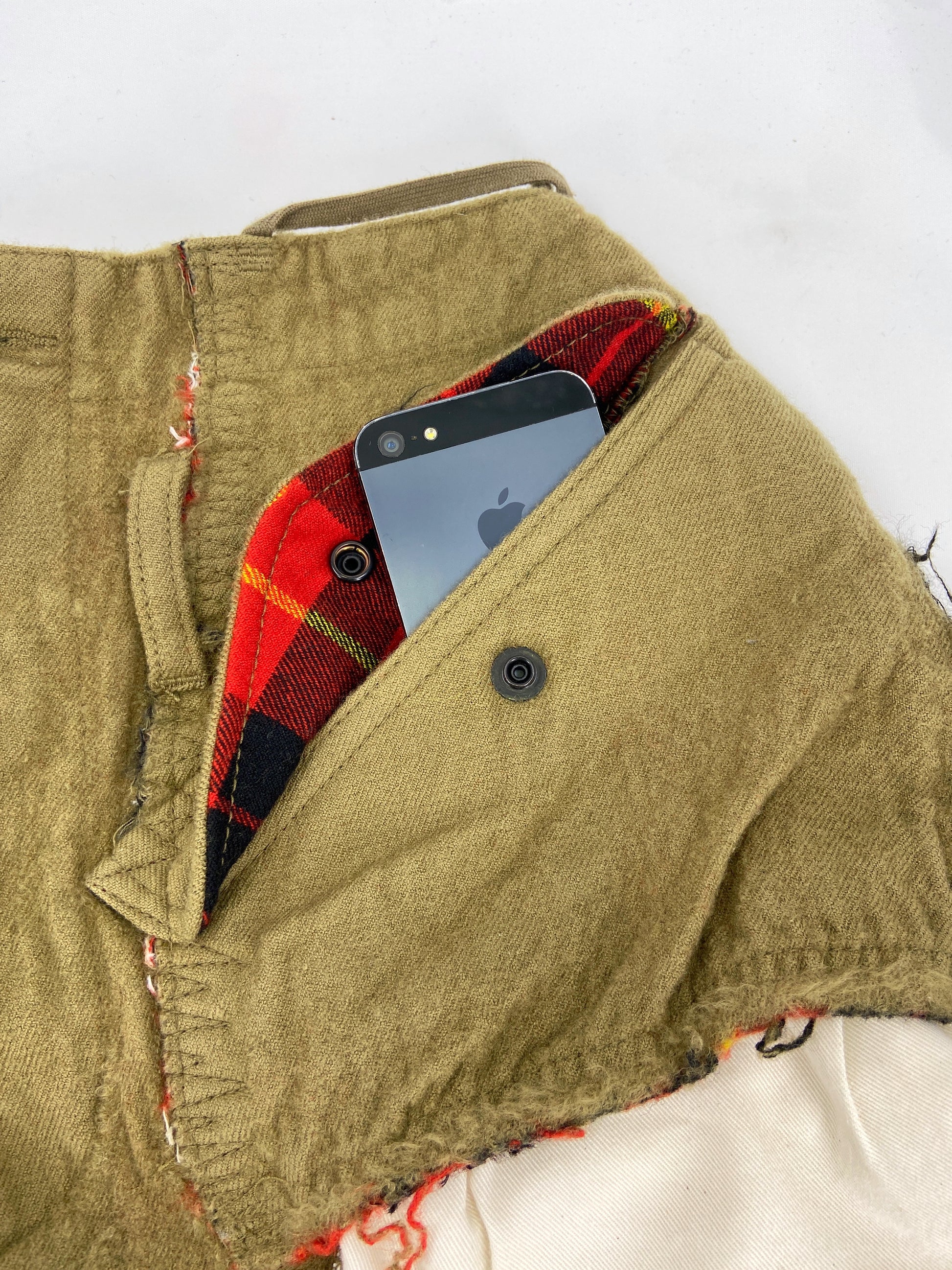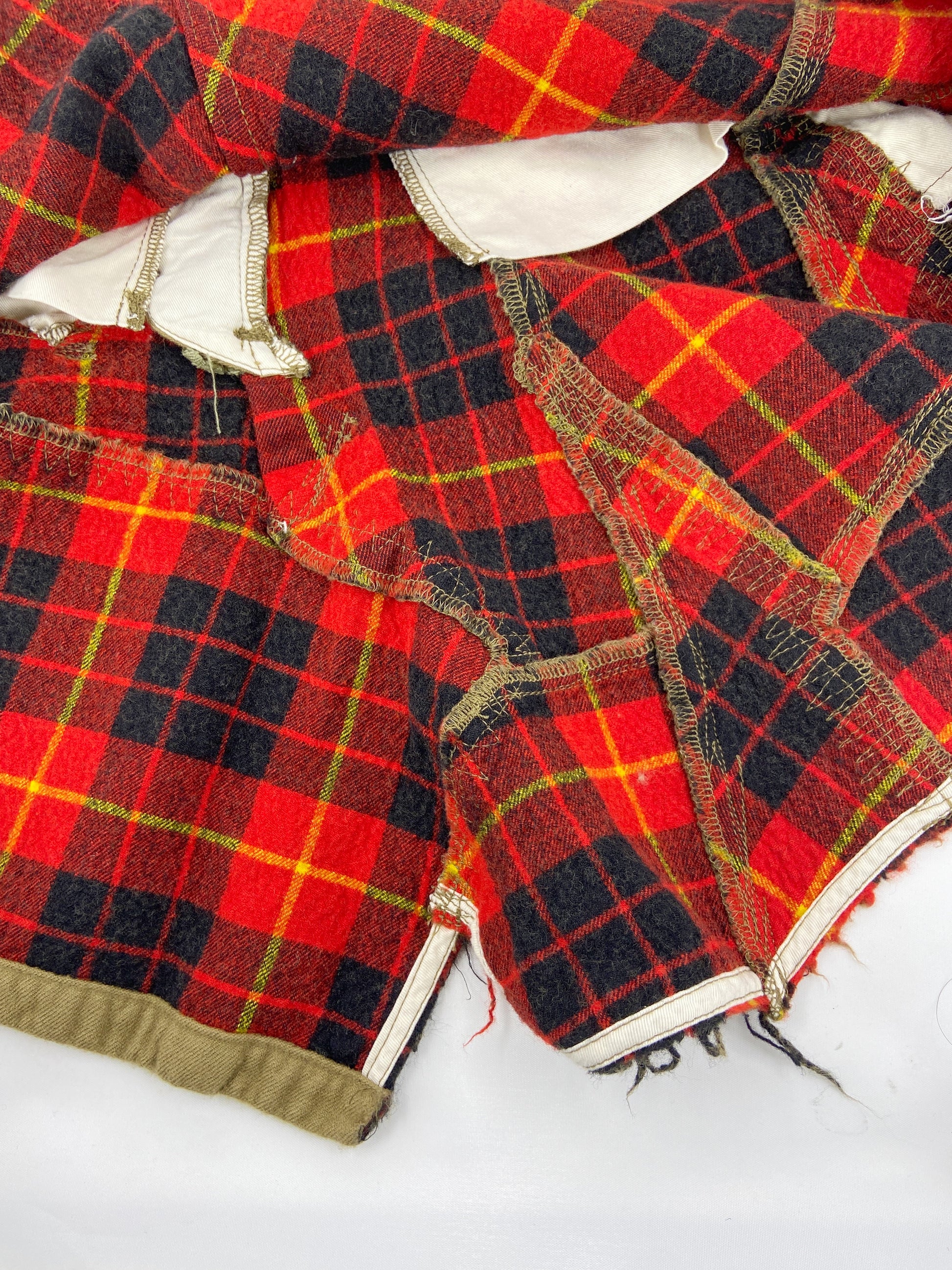 The fabric is specifically developed for the garment, with military green wool on one side and a bright red flannel print on the other