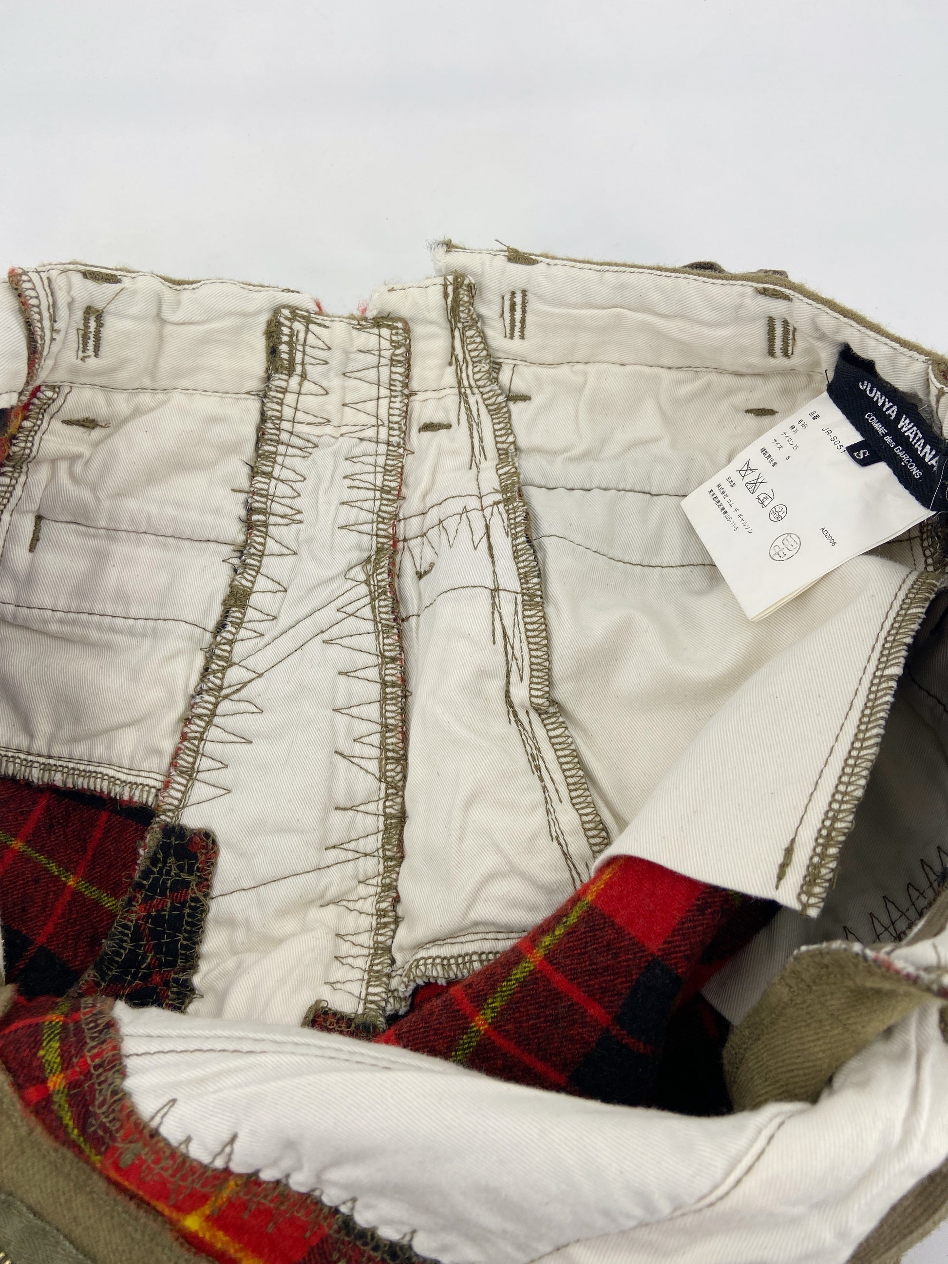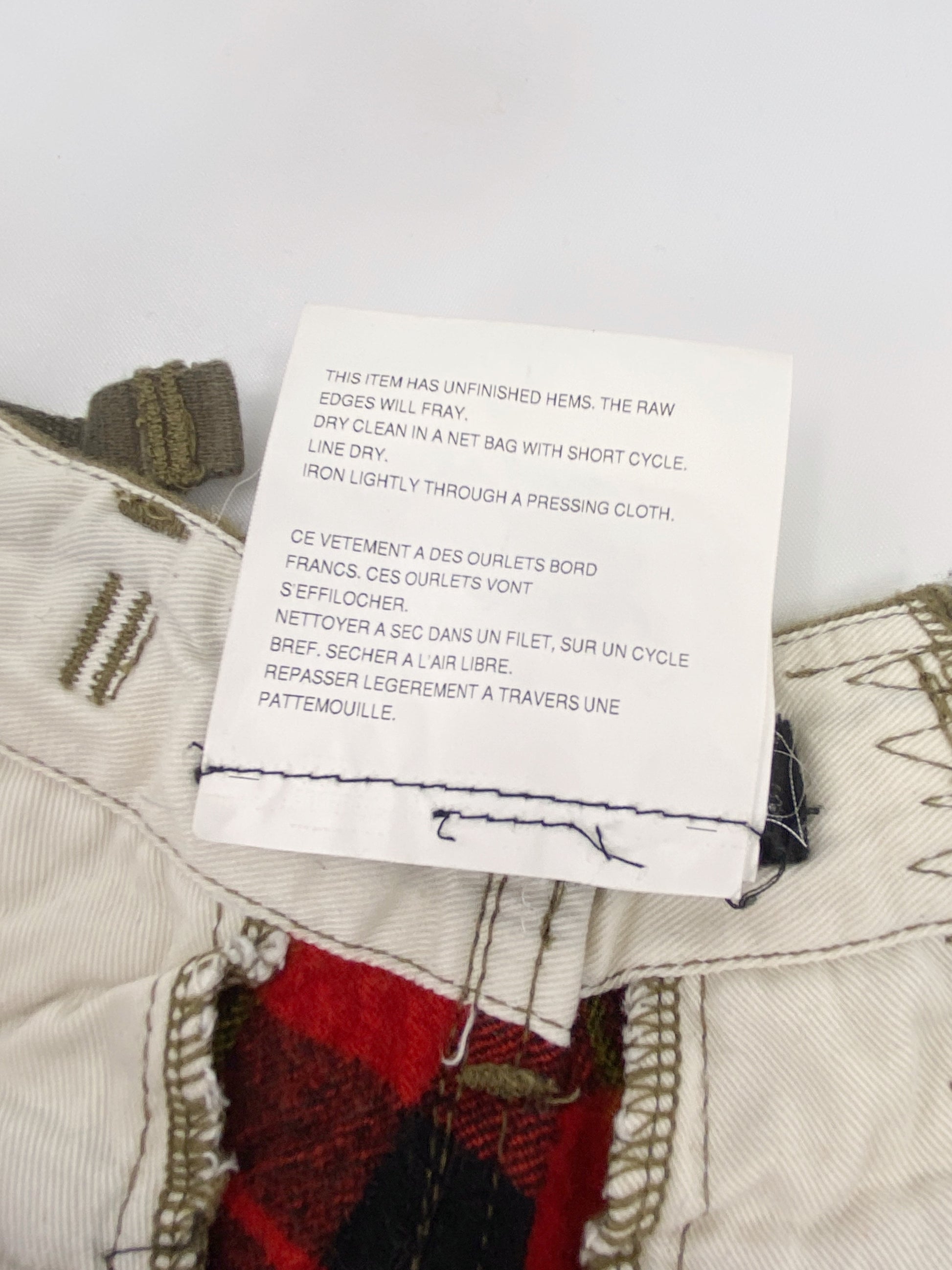 The design was constructed (or at least imitated)from a pair of mens pants and then cut and resewn together in excruciating effort, with the chaotic seam work showing on the inside of the skirt