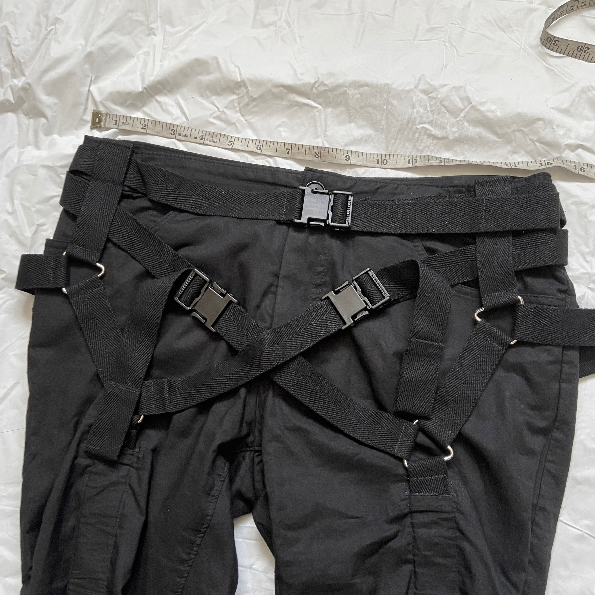 An astonishing pair from classic junya bondage designs, back to 2003 when y2k is in full bloom and junya decided to put one of the sassiest runways ever, 1800s milkmaids going parachute, introducing pastel colours with not often associated parachute bondage elements, the runway looks fun and cozy at the same time. Buckles, metal rings and straps all over. These do have front pockets. You can adjust most strap lengths