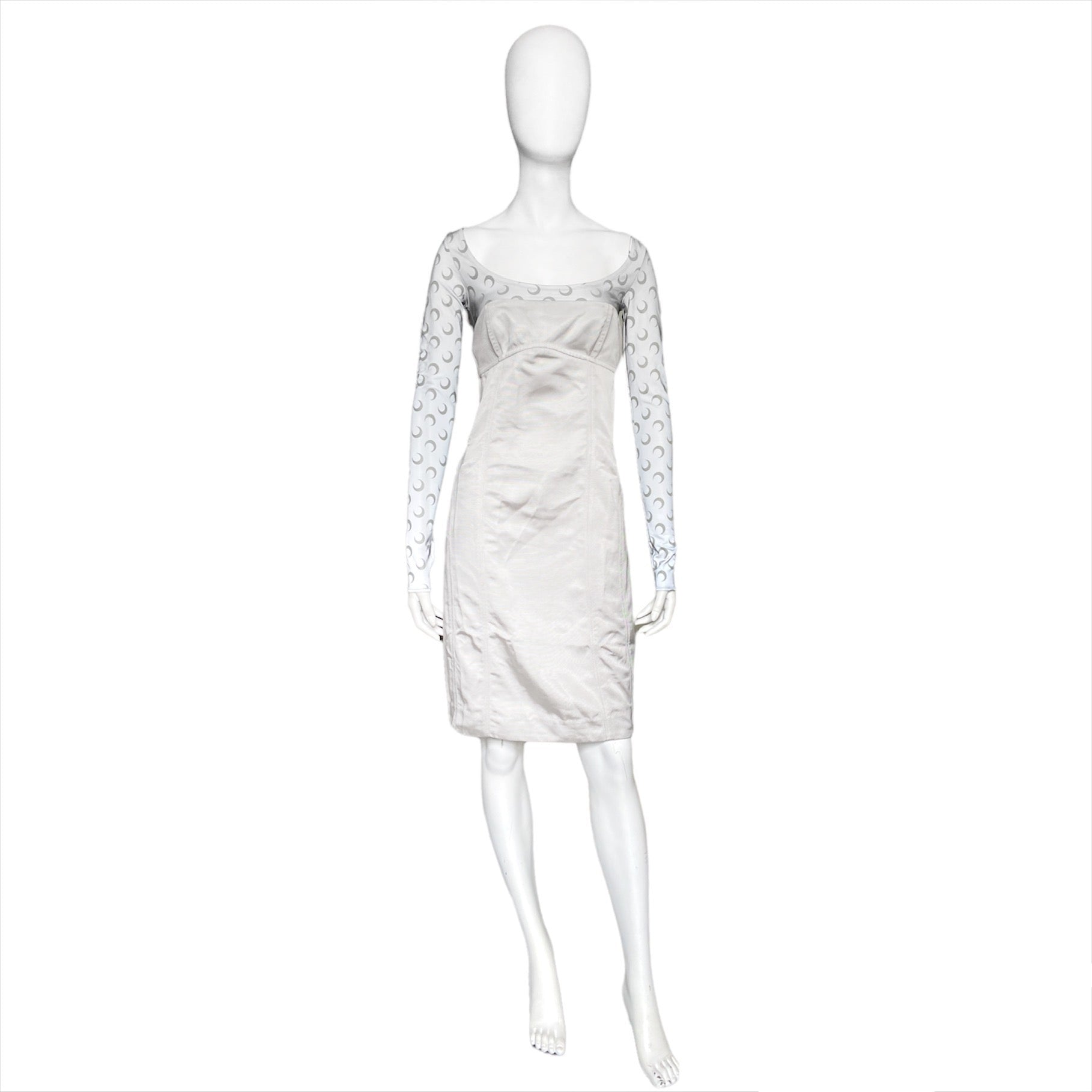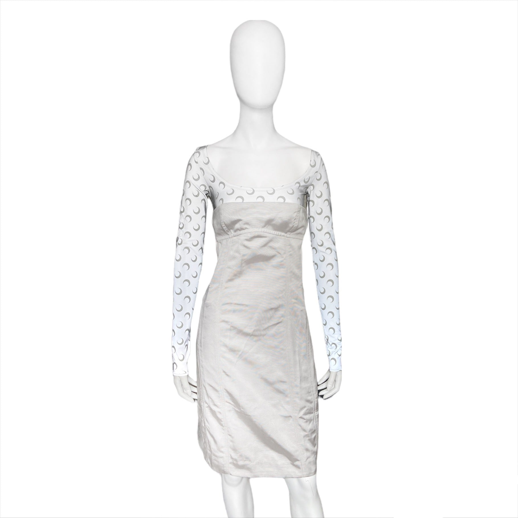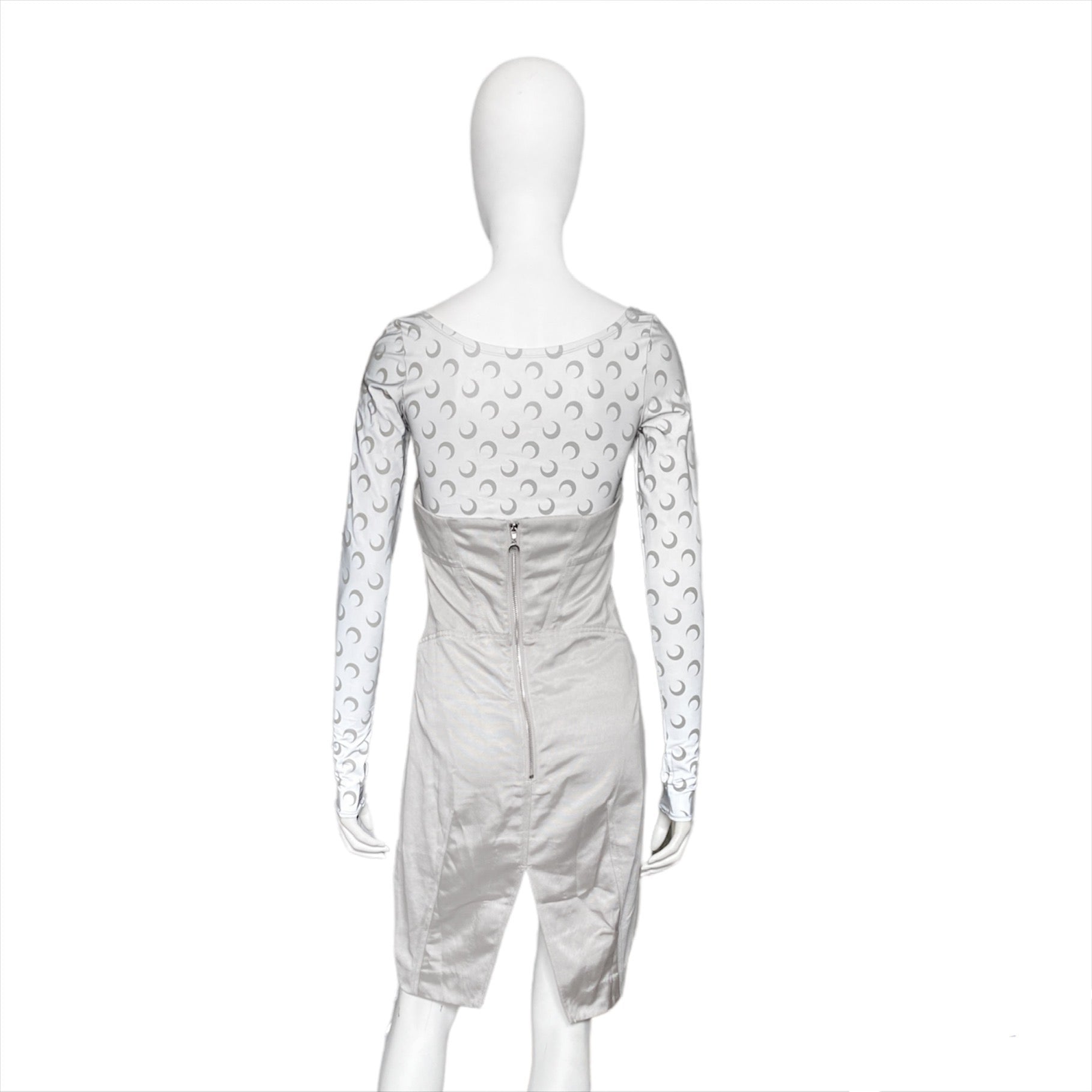 Brand new condition straight from the runway. Logo moon print top plus denim like polyester knee dress. No tears or damages. With moon zipper and slit that seperates the back of the top from the dress.