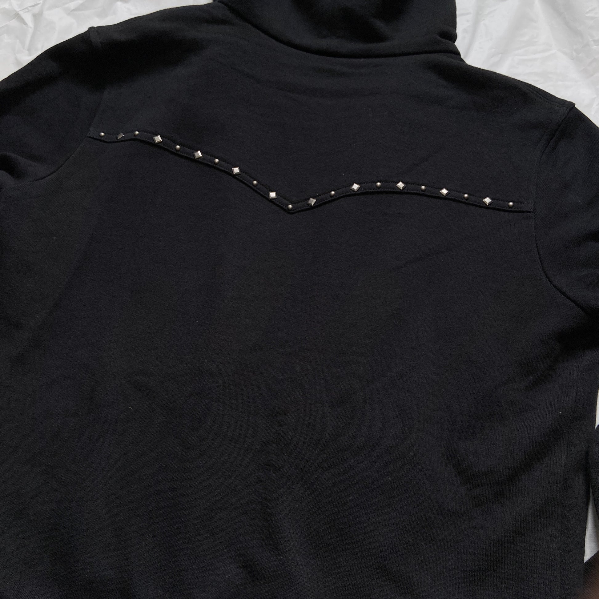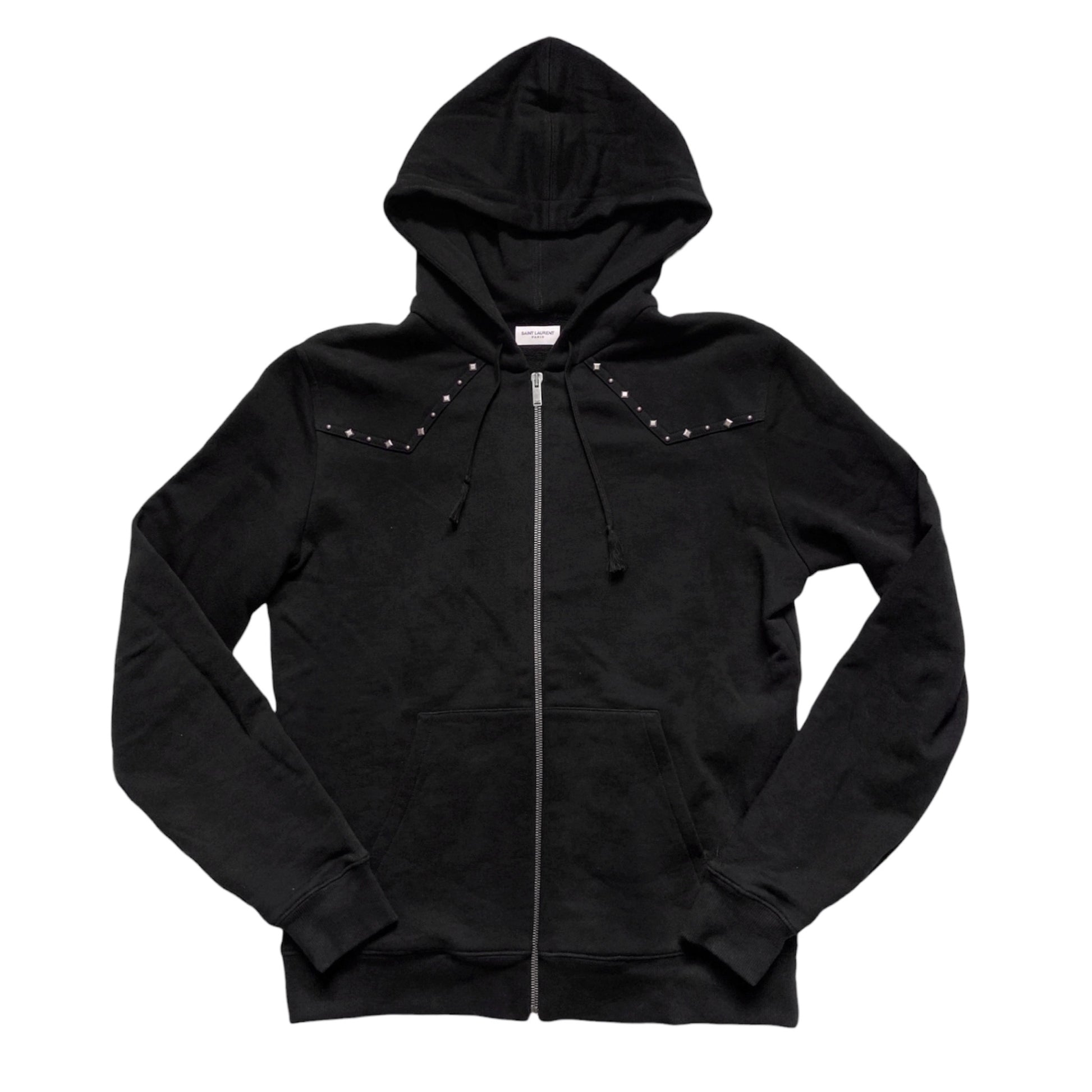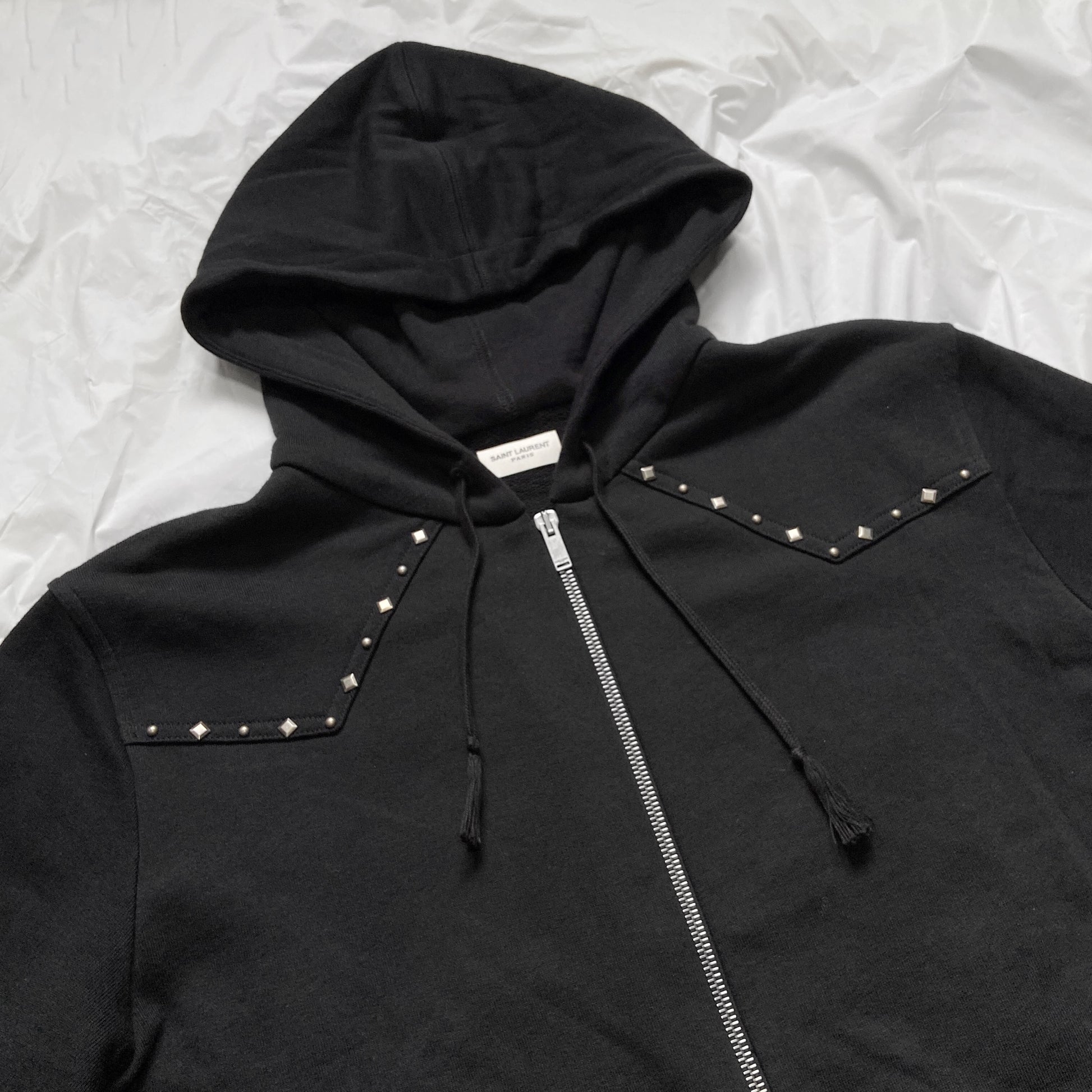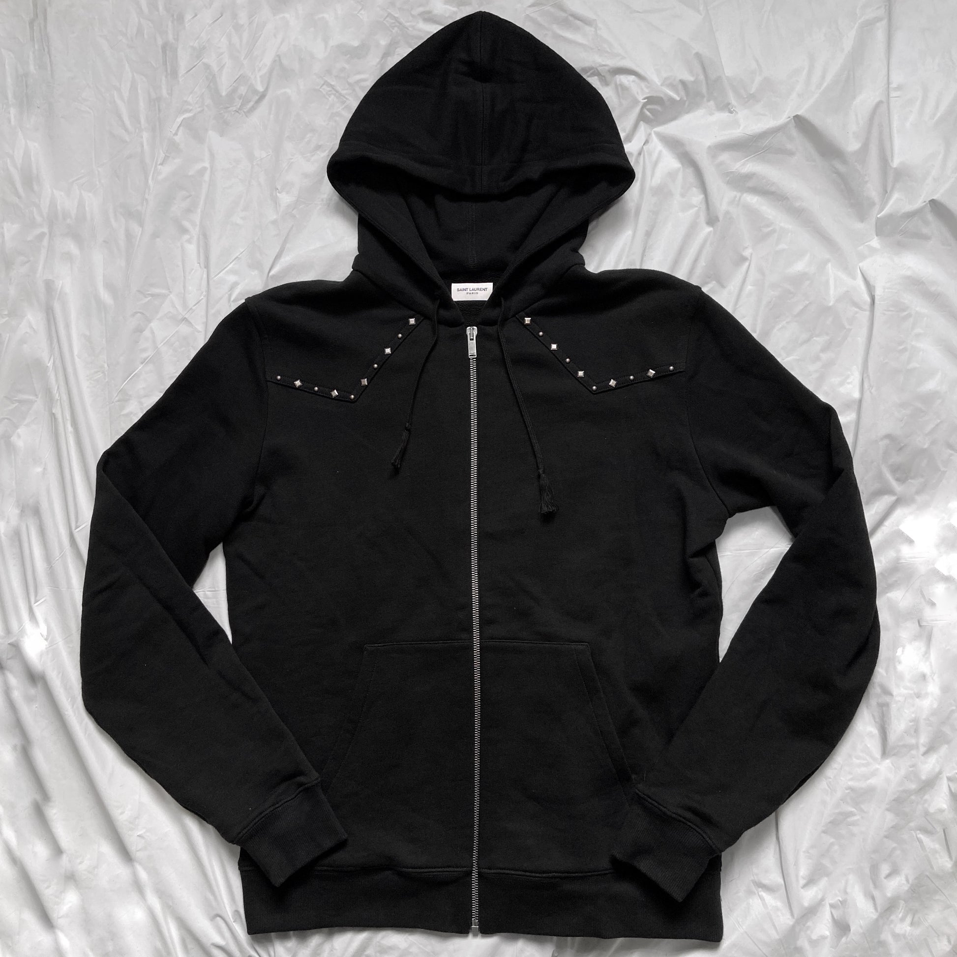 rarest Saint Laurent hoodie ever. Was sold on Farfetch for $1275. Instilling a sense of Western style into a simple black hoody, Saint Laurent shows its rock ‘n’ roll persona. Made from cotton jersey in France, it’s detailed with alternating metal studs at the yoke and completed with a pair of kangaroo front pockets. Drawstring hood with tassels end. In super well condition, barely worn at all.