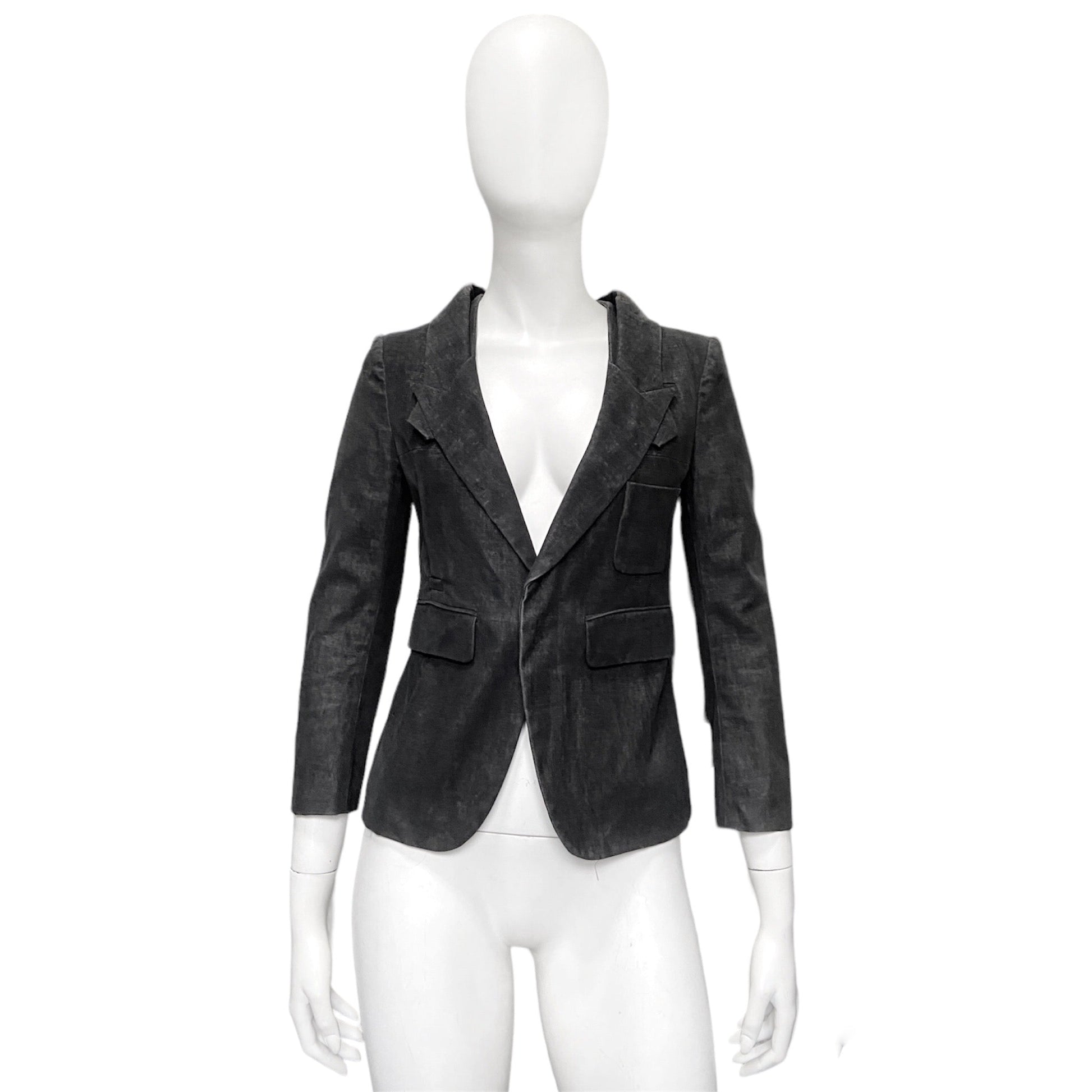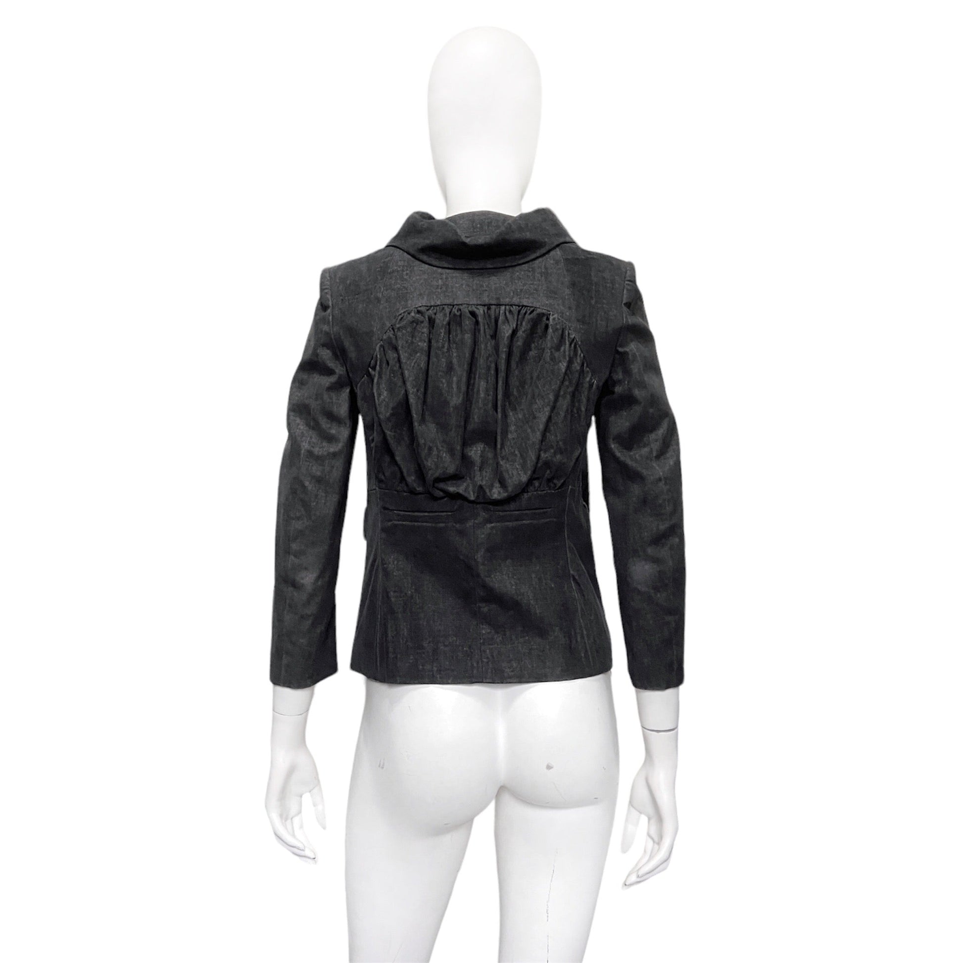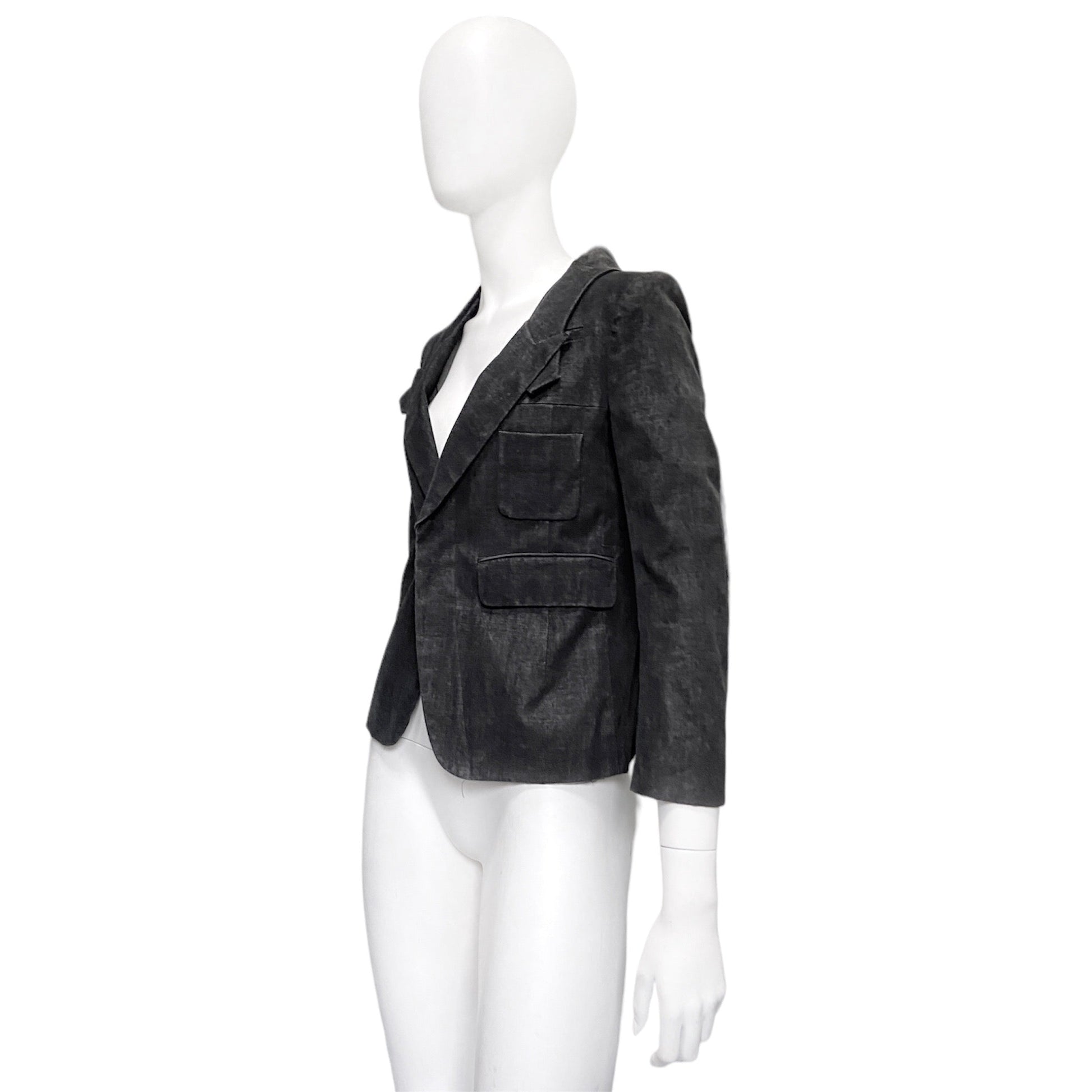 Great jacket, nine pockets, five front, two back and one inner pocket on each side of the blazer. Layering banger piece. Double collar at the back. Pls refer to runway pics. Theres a sort of draping going on in the back. The colour of the jacket is dyed indigo then distressed, making bits of dye coming off creating a really vintage feel to the piece. Silk lining and hidden buttons.