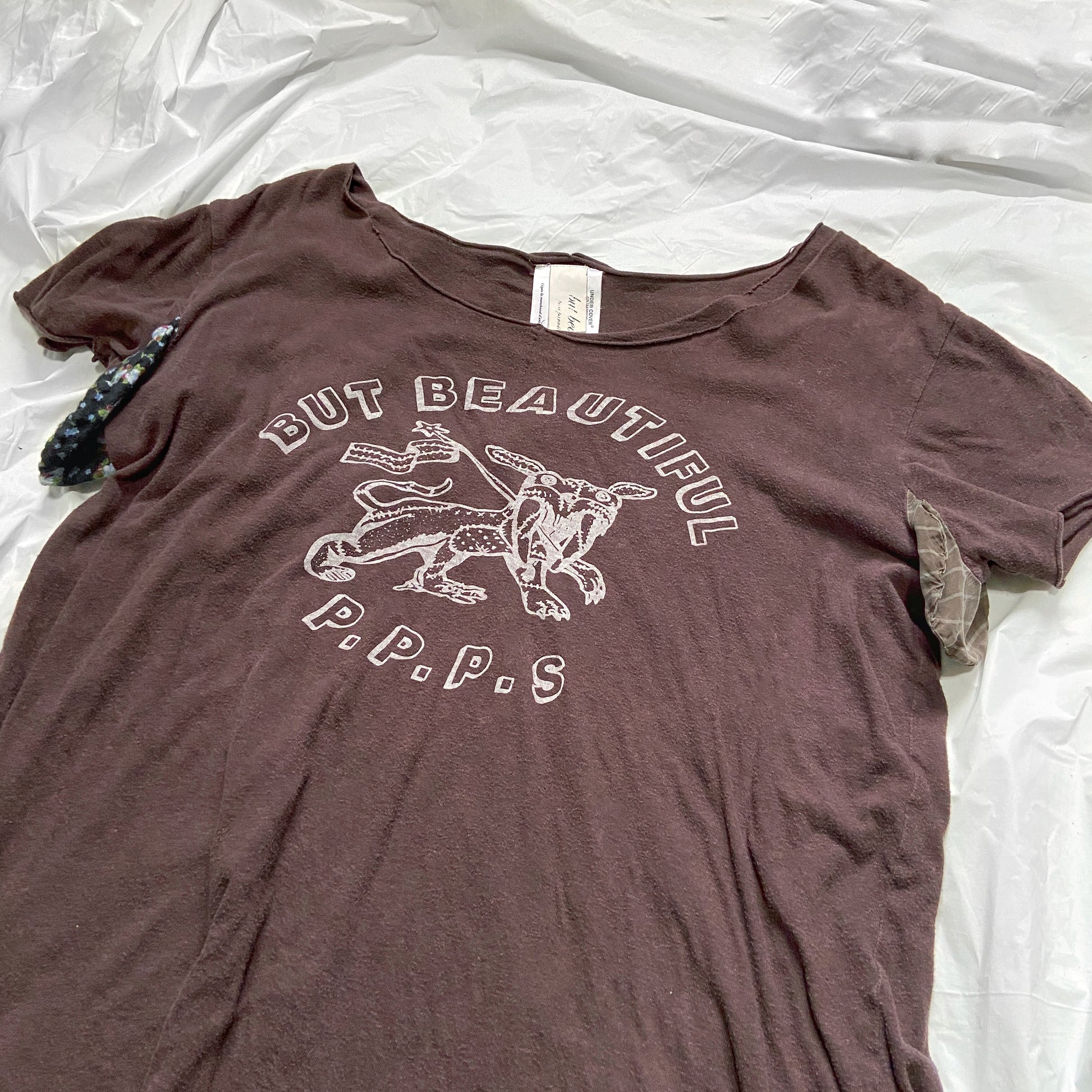 A beautiful t-shirt from Undercover fall 2004 collection, with a animal doll print inspired by the works of Anne-Valerie Dupond. The tee consists of two layers, with two lining fabrics attached to both pits. Also a seasonal signature small piece of fabric attached to back. Oversized look, mint condition with slight signs of use.