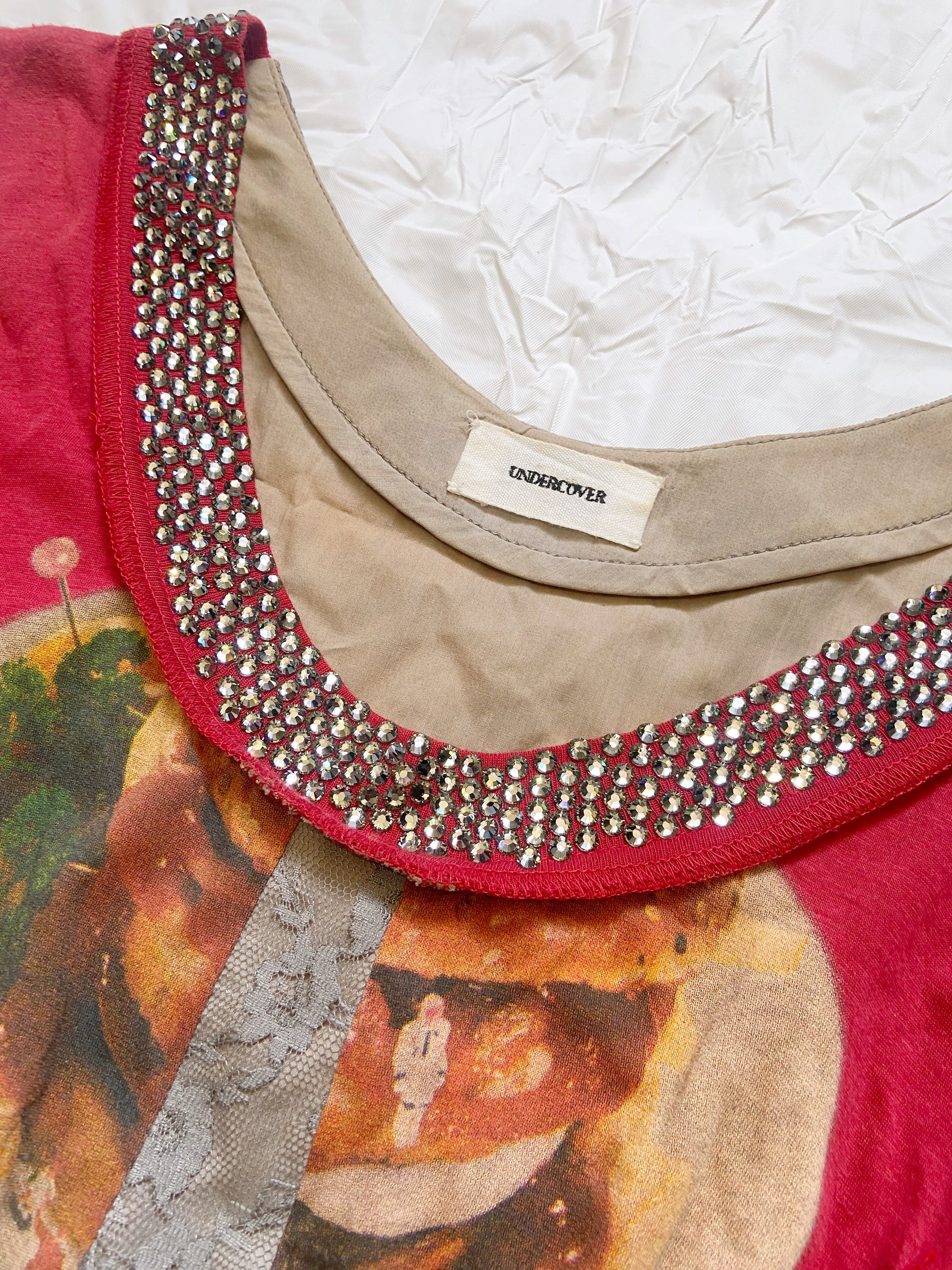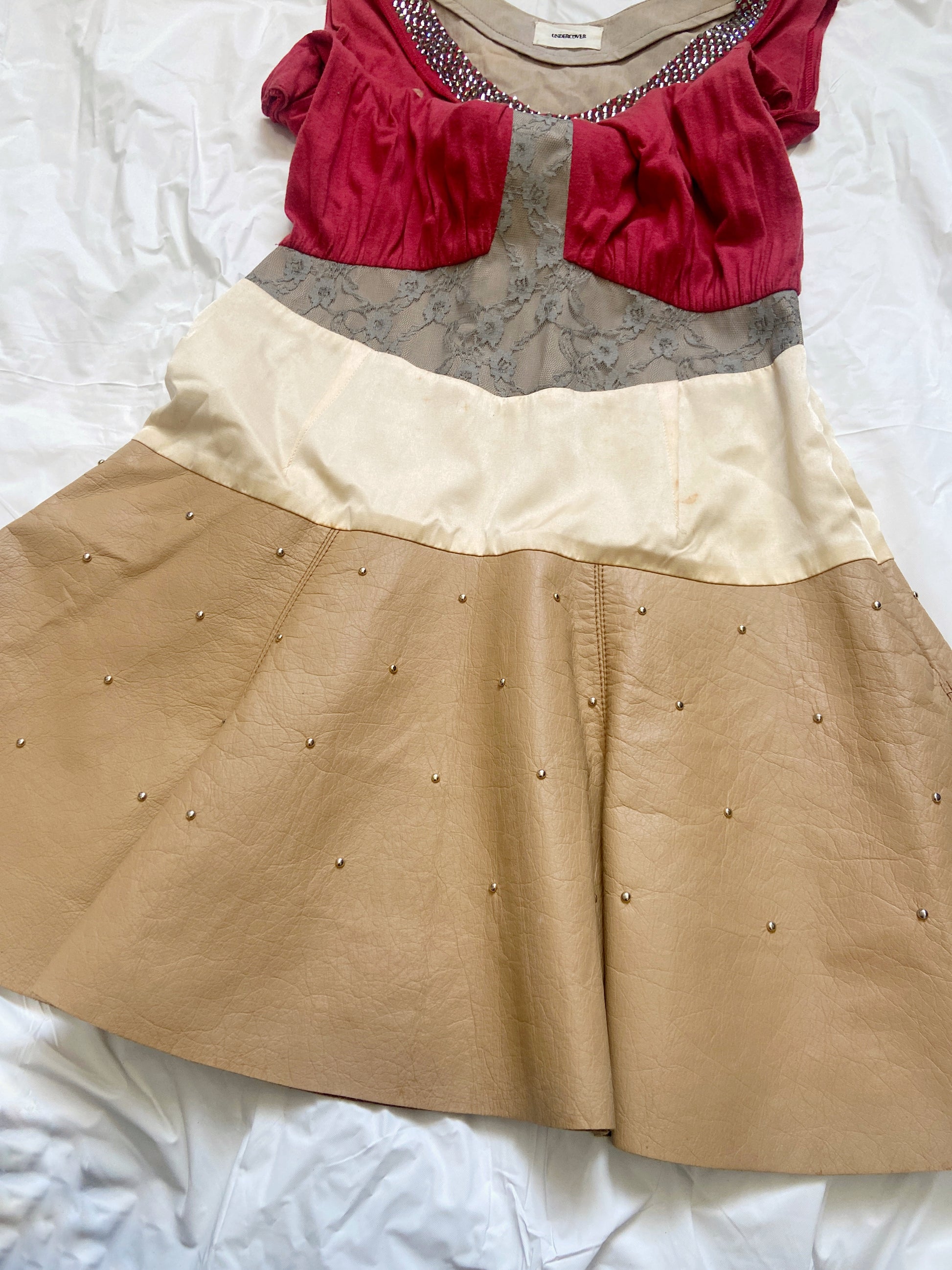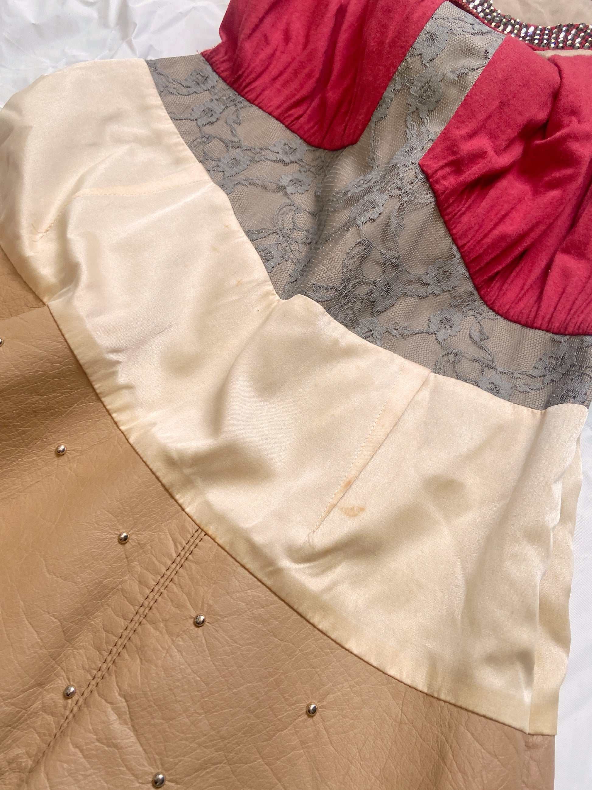A combination of materials, cotton, mesh, lace, silk, crystals, leather and metal bits. Featuring a hamburger print thats an iconic design of the undercover brand. Weird and fun looking. Leather part has some round metal bits embossed all over it. In great condition, unfortunately there are some minor stains at the front of the dress. Not very noticeable tho
