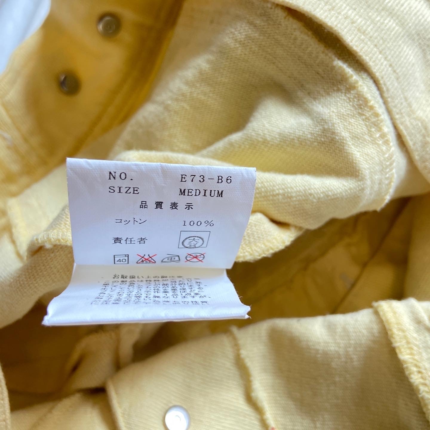 Notice the details on this piece, where it was expertly cut and distressed to result in a such a distorted and rippled fashion, with large gaps between buttons means that the front is hanging loosely and create a ripple like visual. Also notable are the elongated elbow spaces created for the elbows to recreate a used stretching of denim. Also scab logo buttons. This yellow version is very rare and never seen anywhere else.
